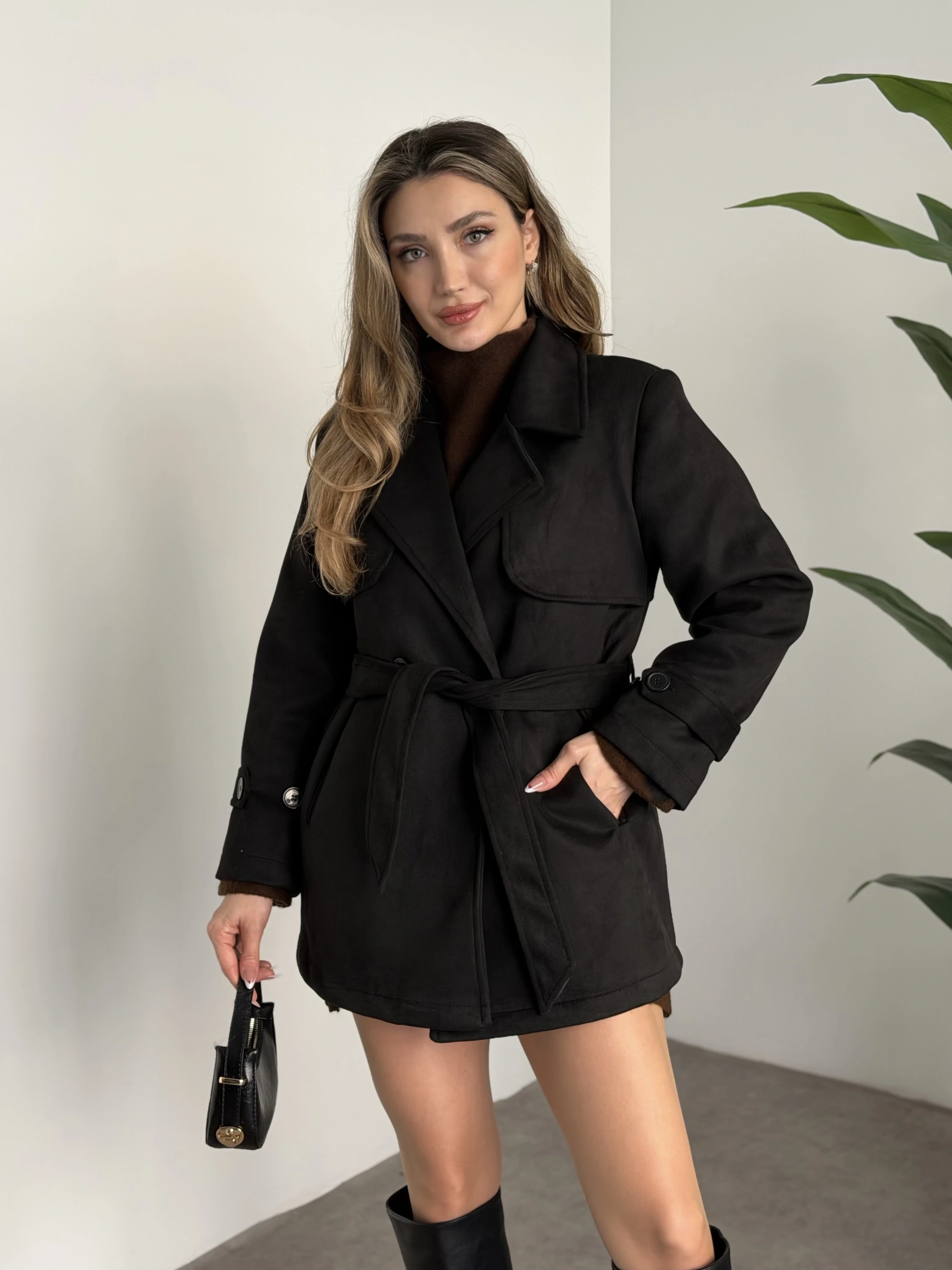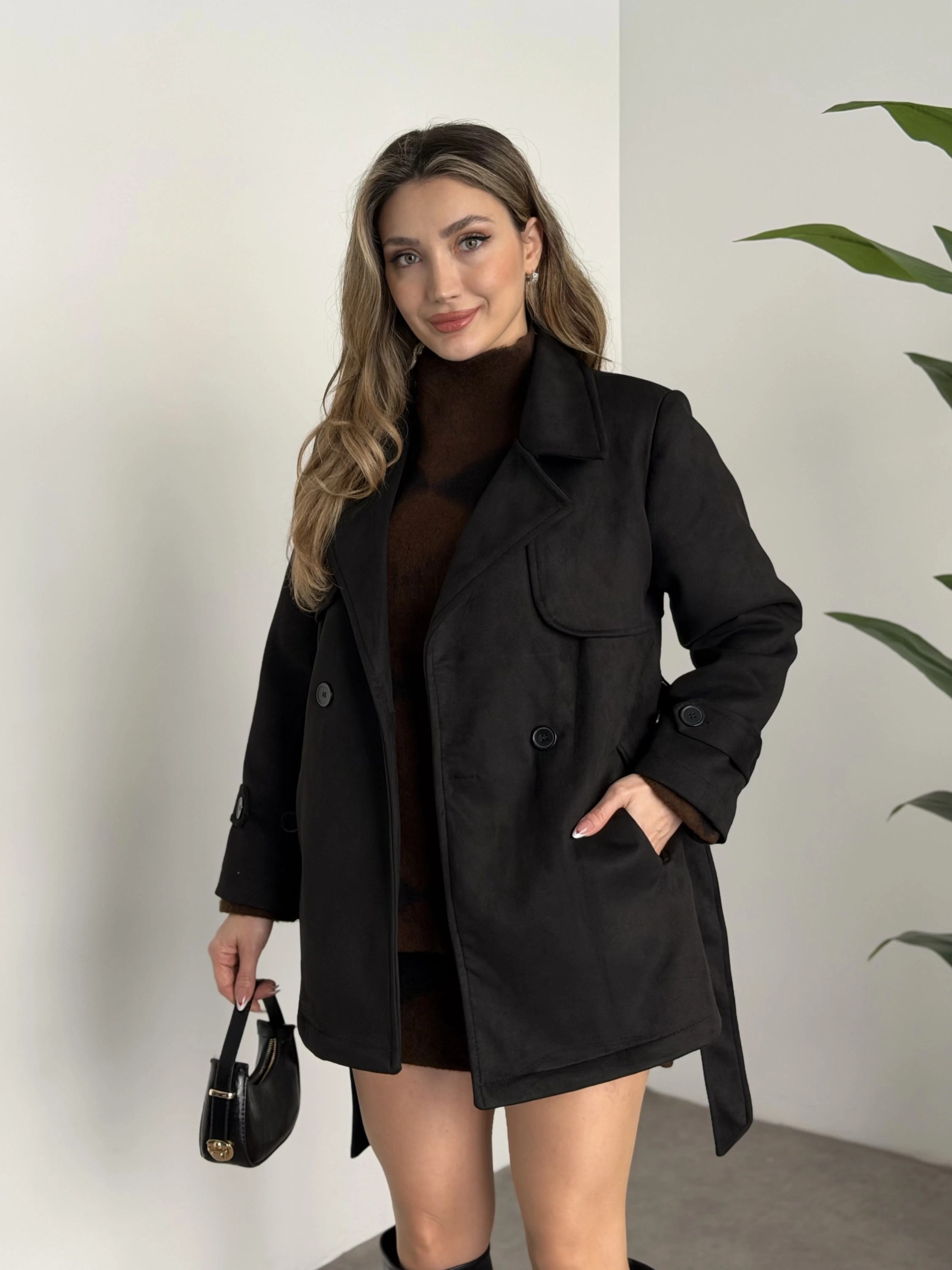 Premium kalite Torino kumaş kruvaze model kolları kemerli trenç siyah