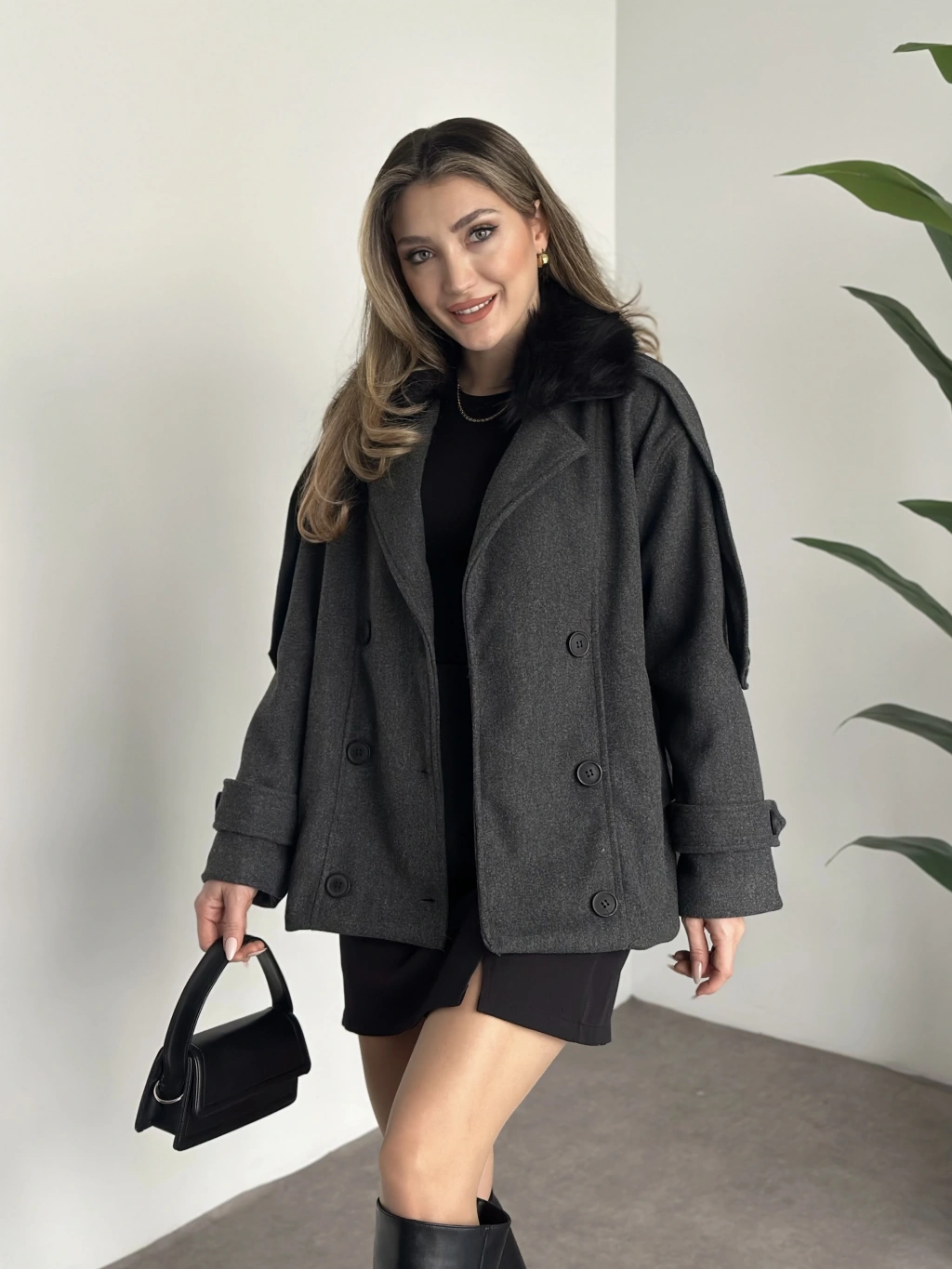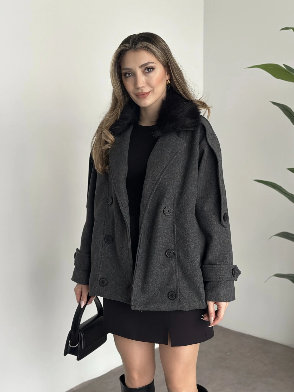 Ara boy bol kesim yakası kürk detaylı kaşe kaban antrasit