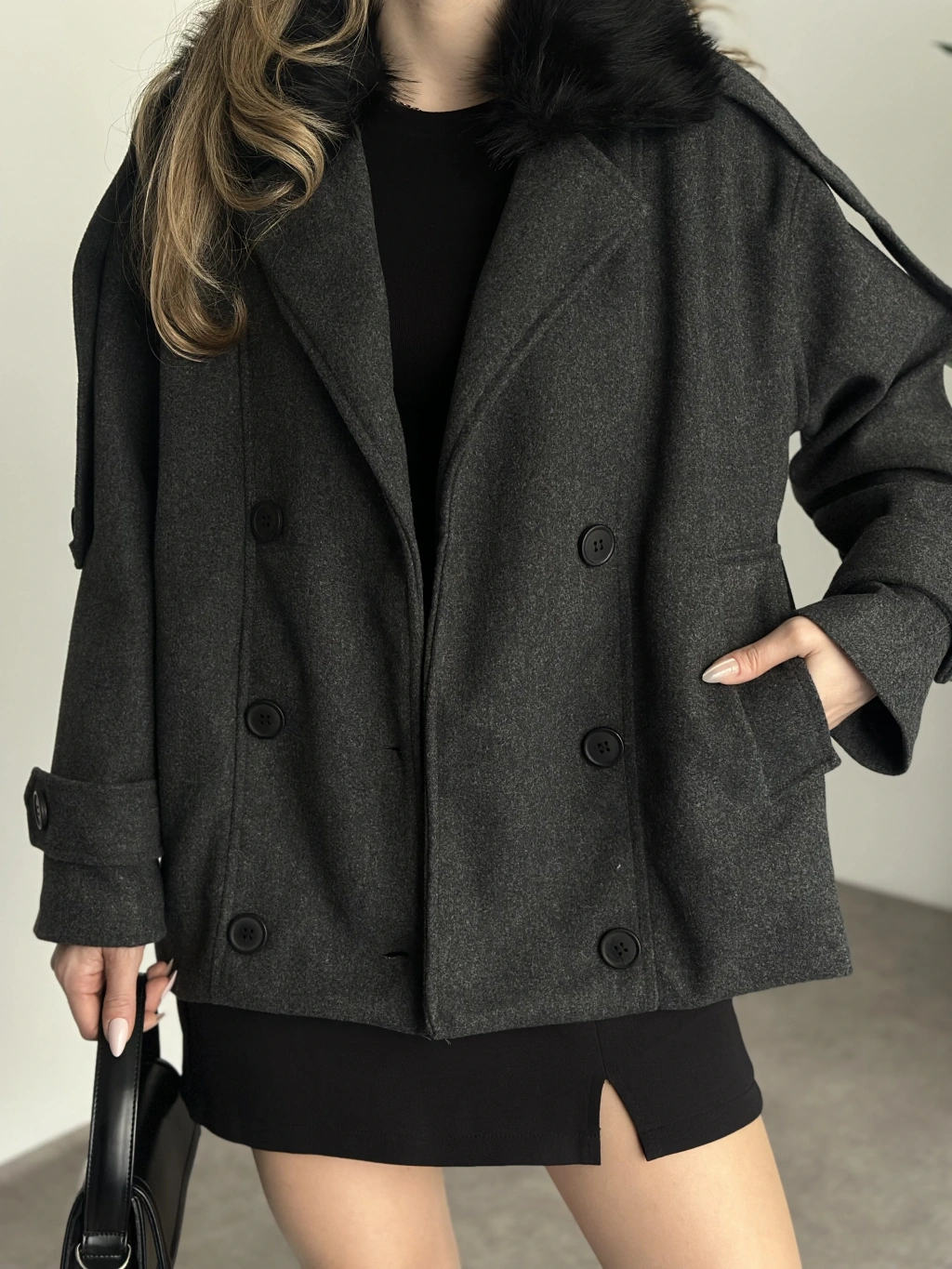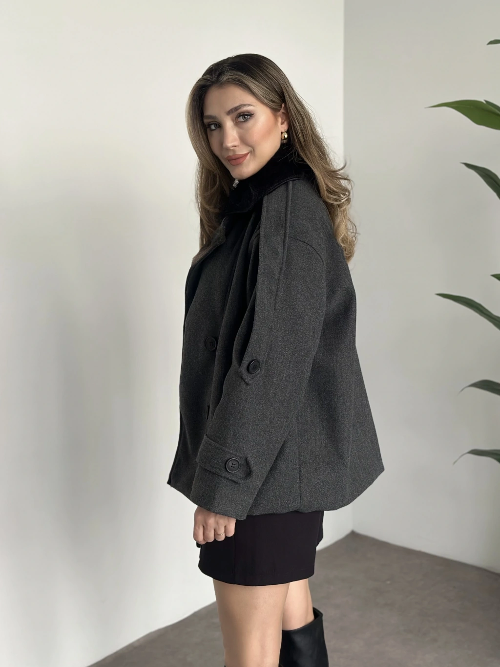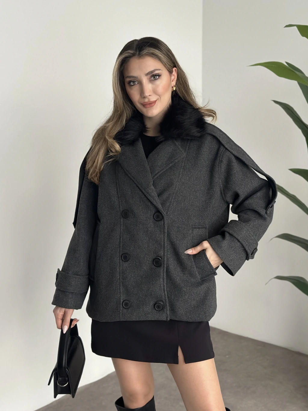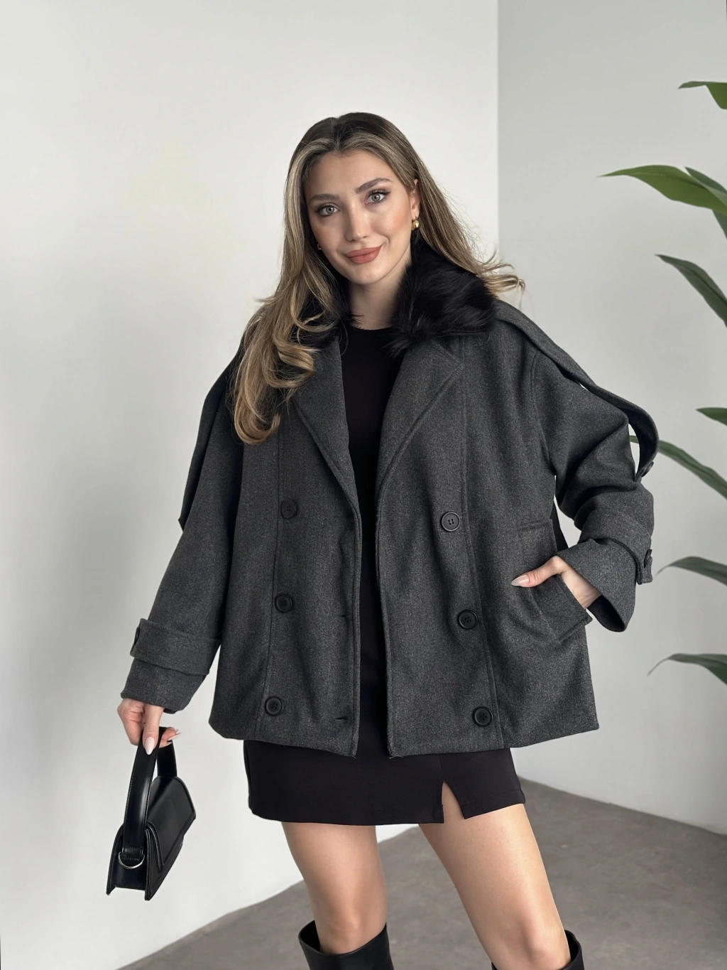 Ara boy bol kesim yakası kürk detaylı kaşe kaban gri