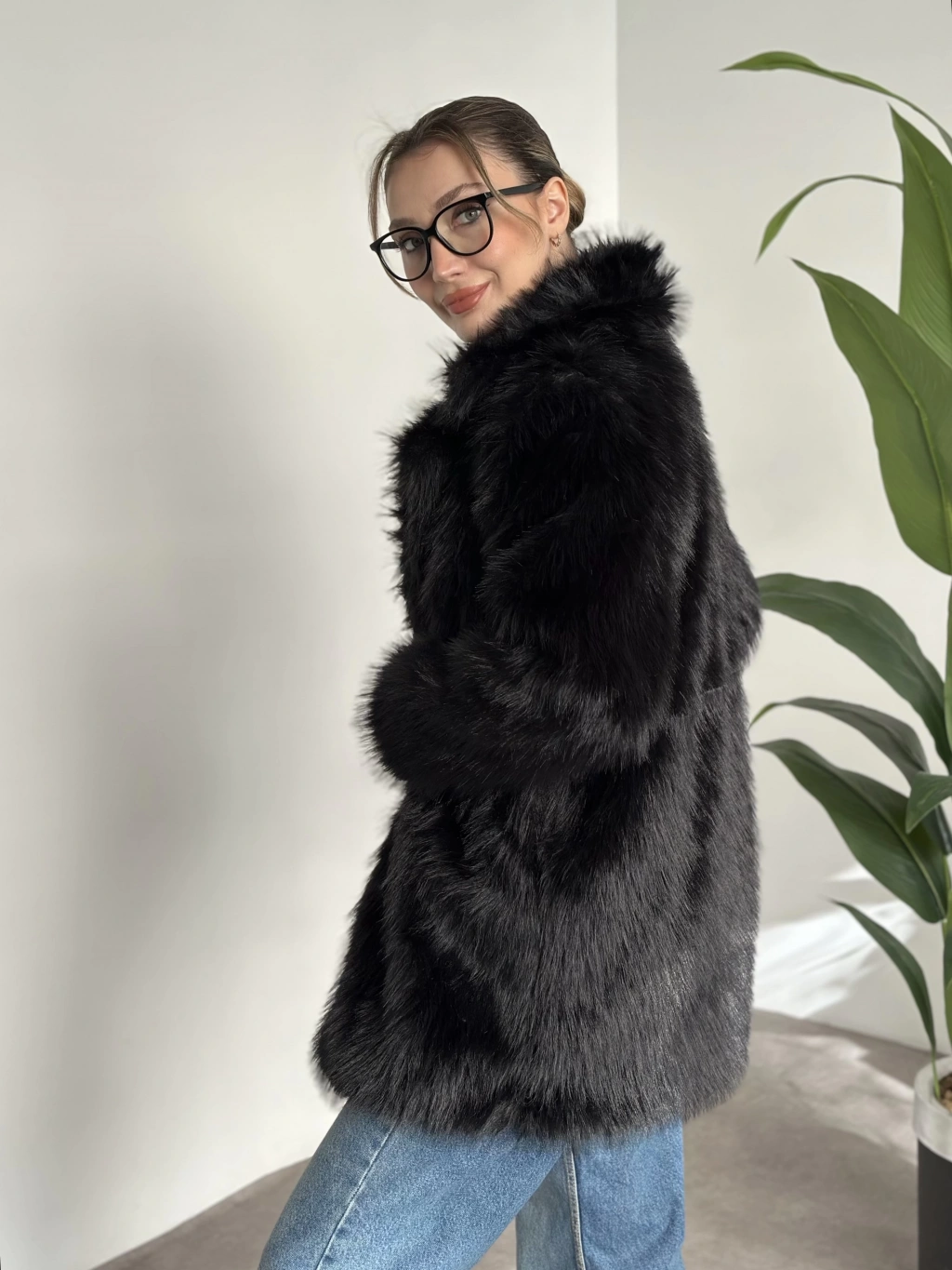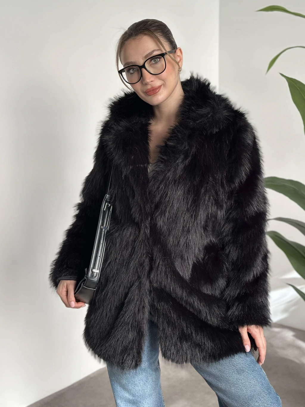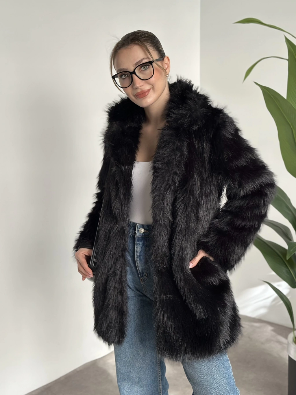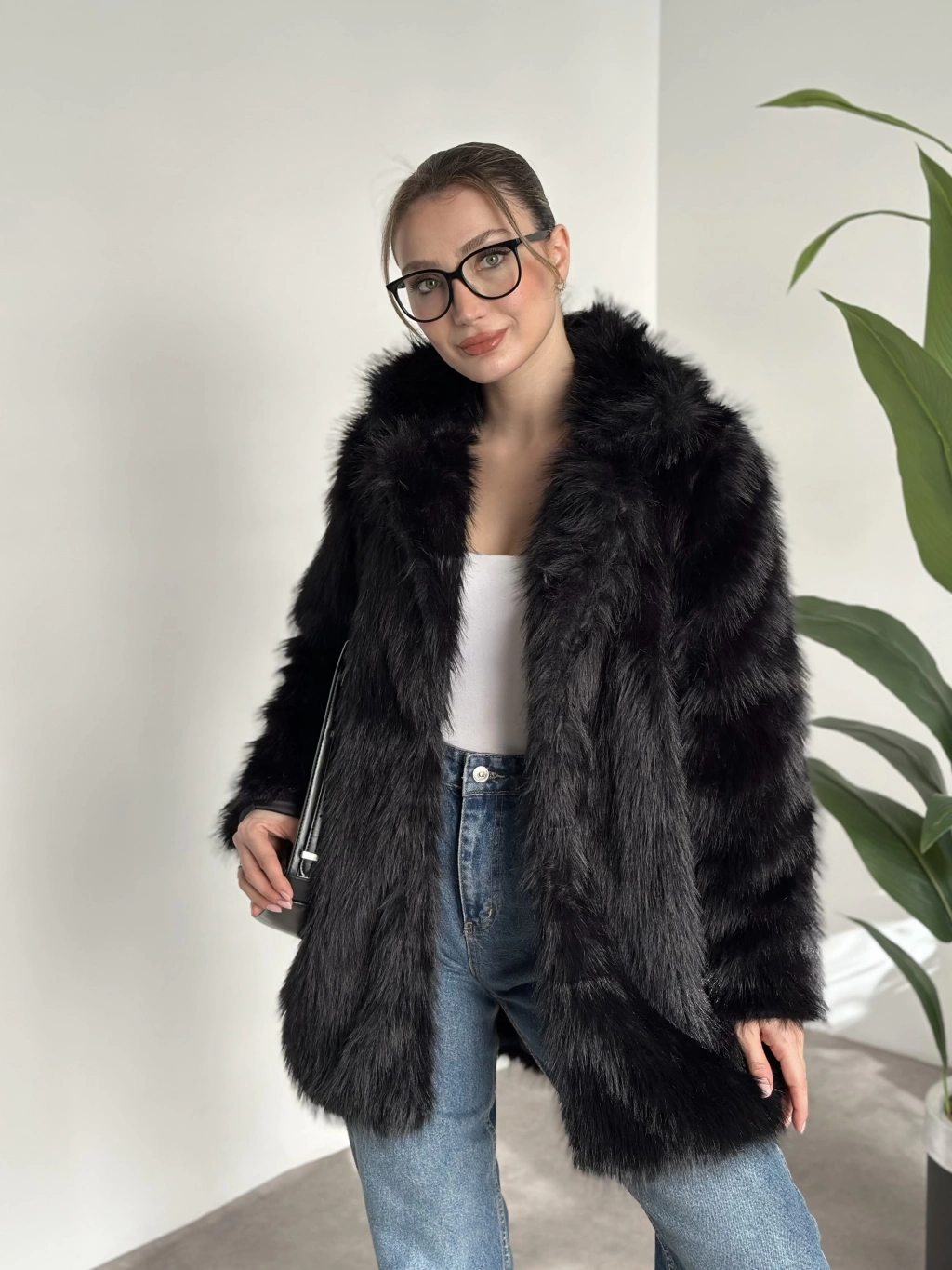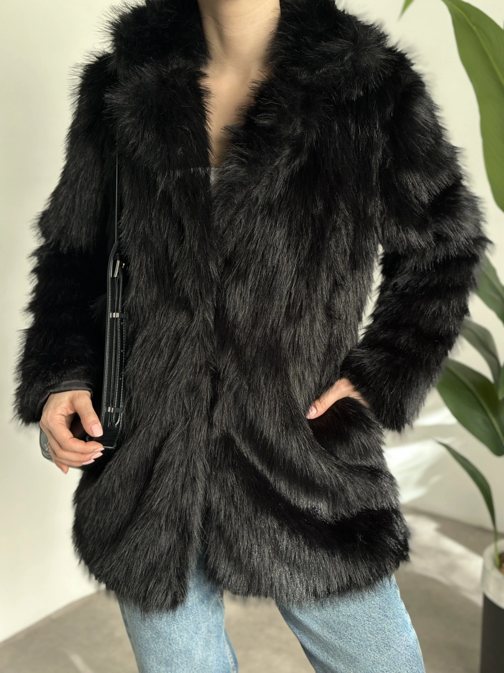 Dokulu süet zr model içi krem peluşlu oversize mont siyah