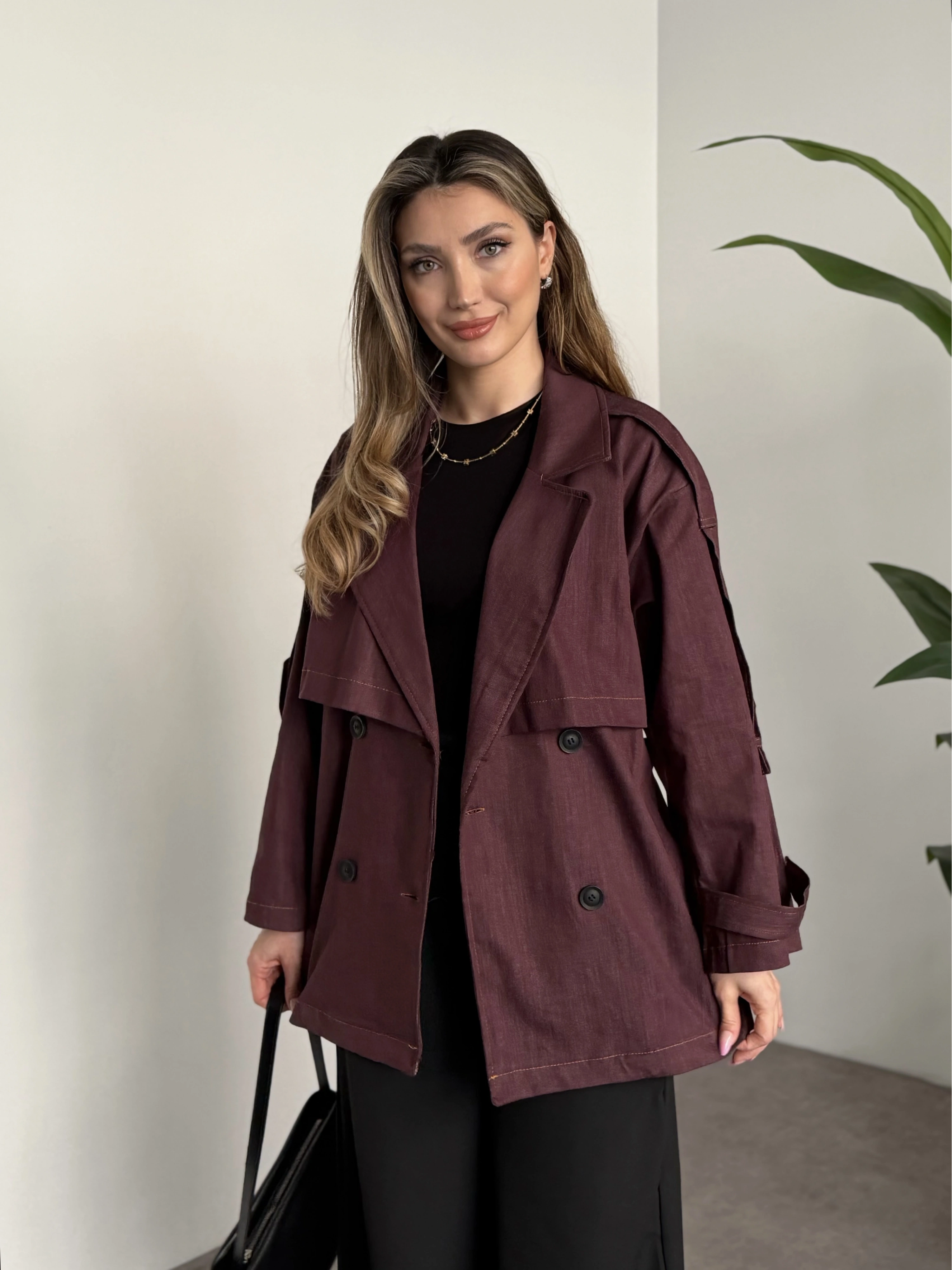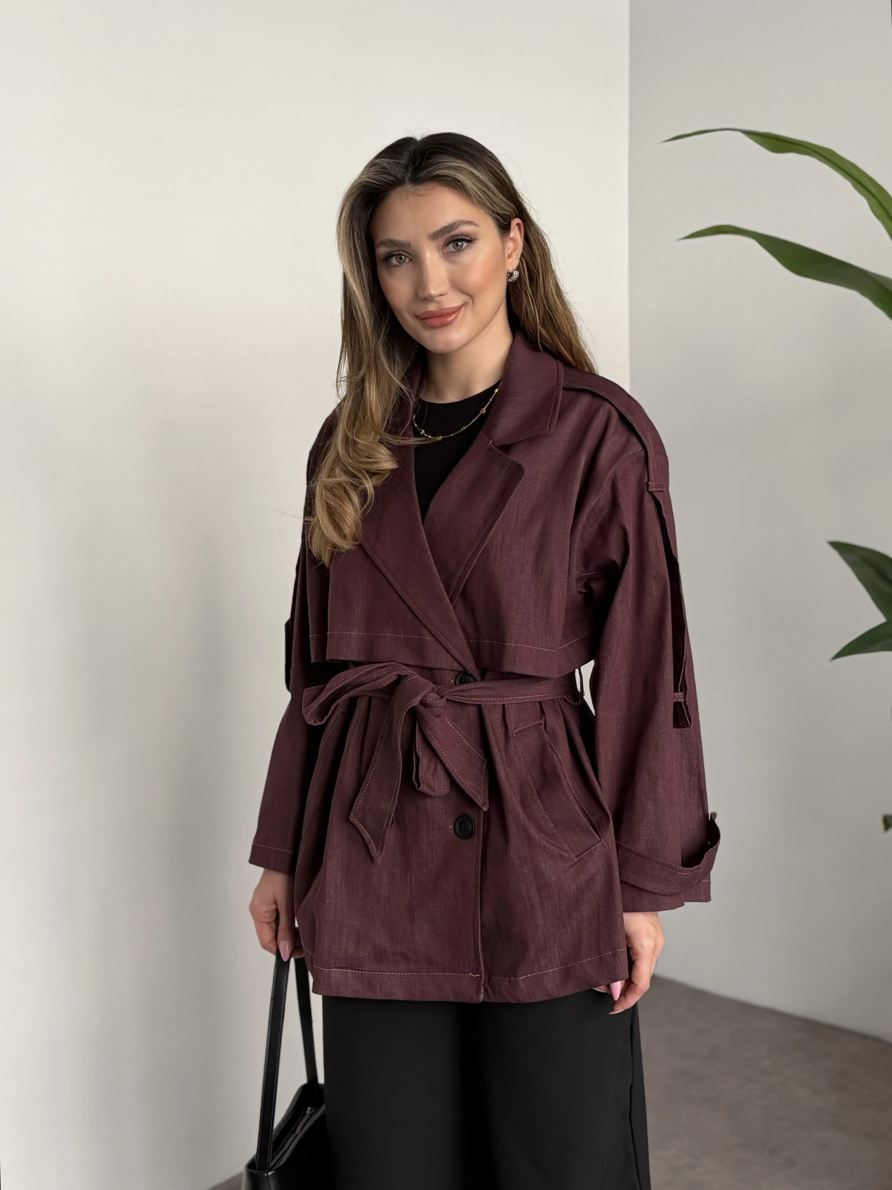 Uzun torino kumaş düğmesiz trençkot acı kahve