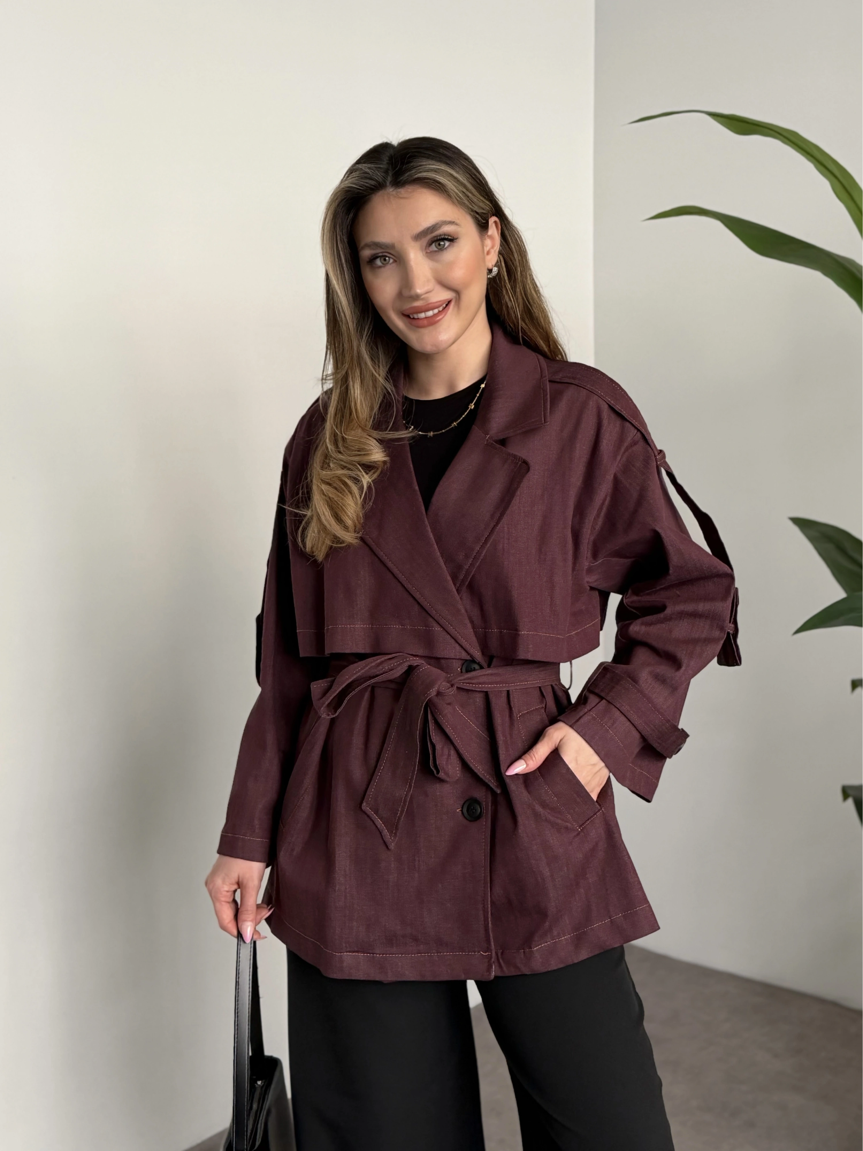 Ara boy belinden kuşaklı deri trenç kahve