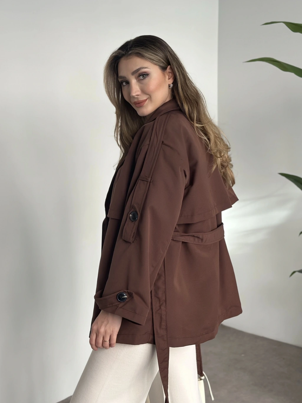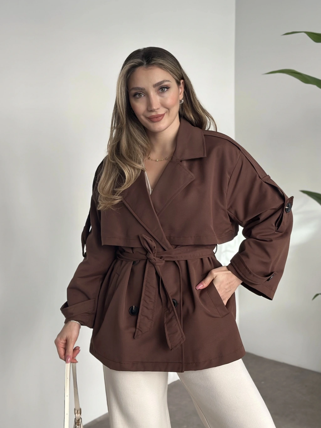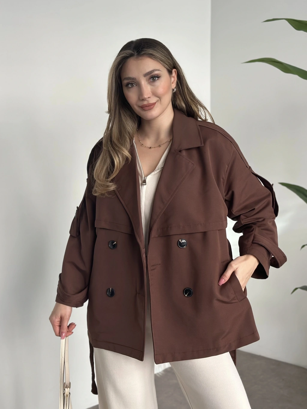Ara boy düğmeli beli kuşaklı oversize astarlı trençkot kahve