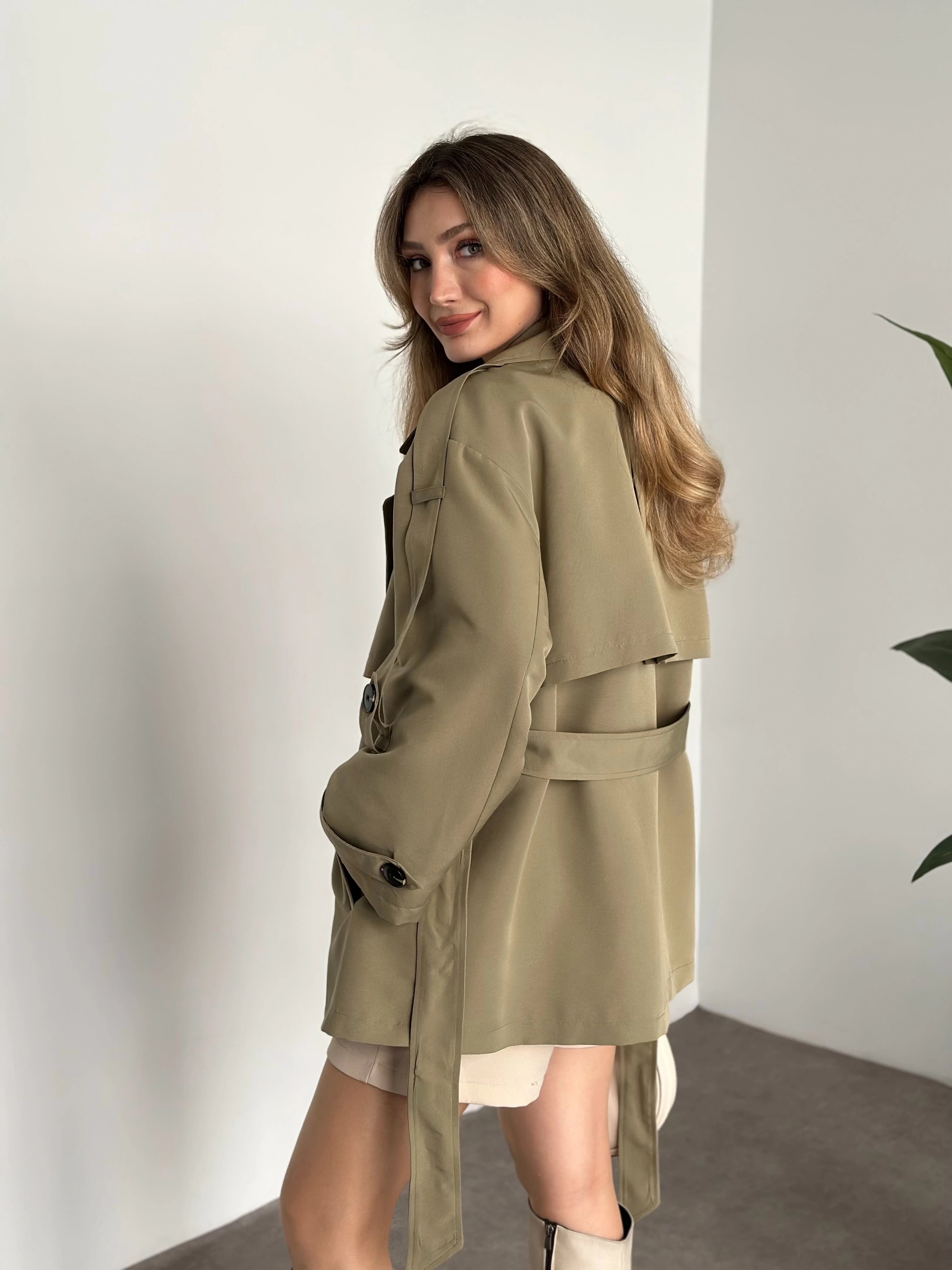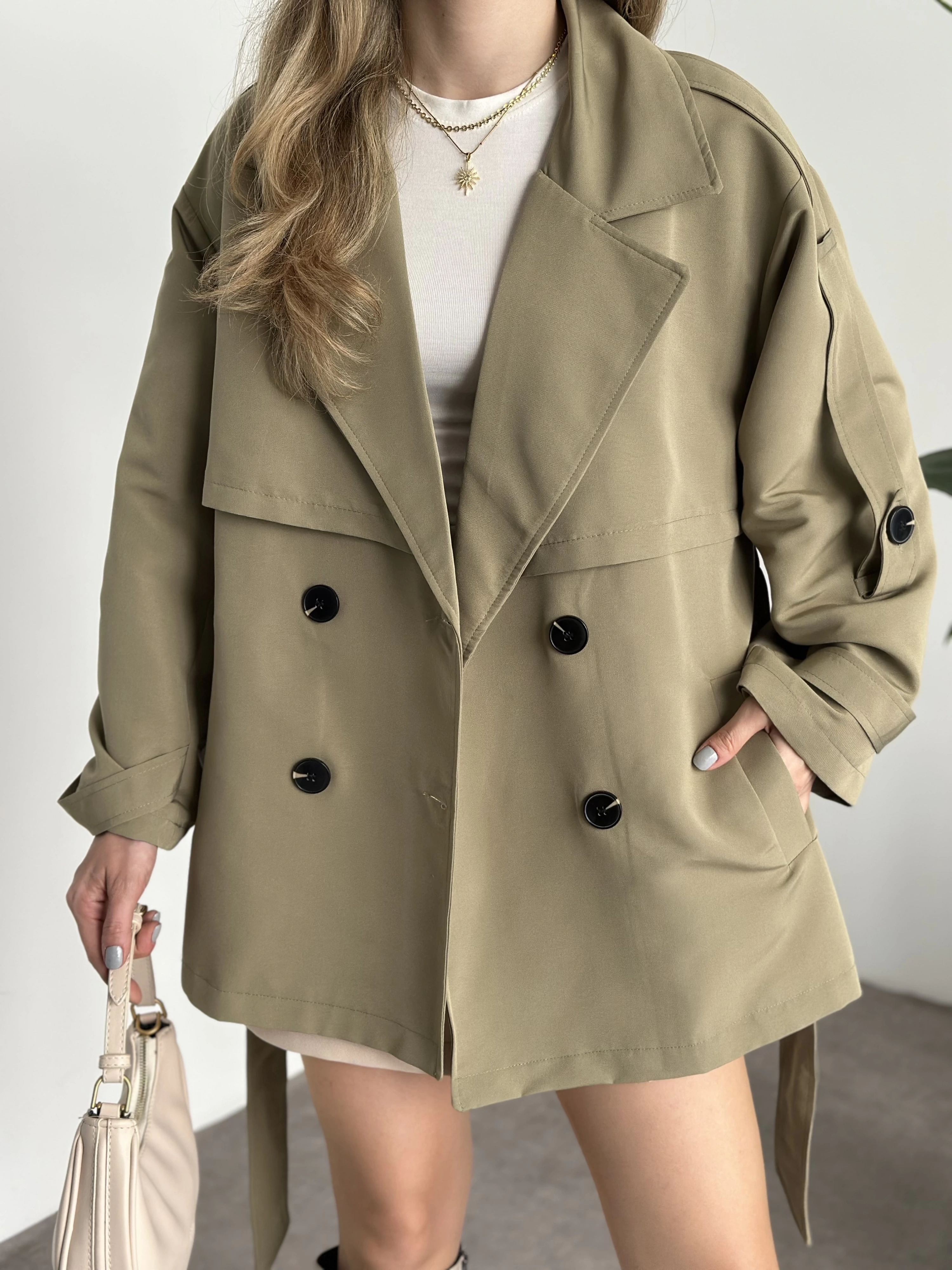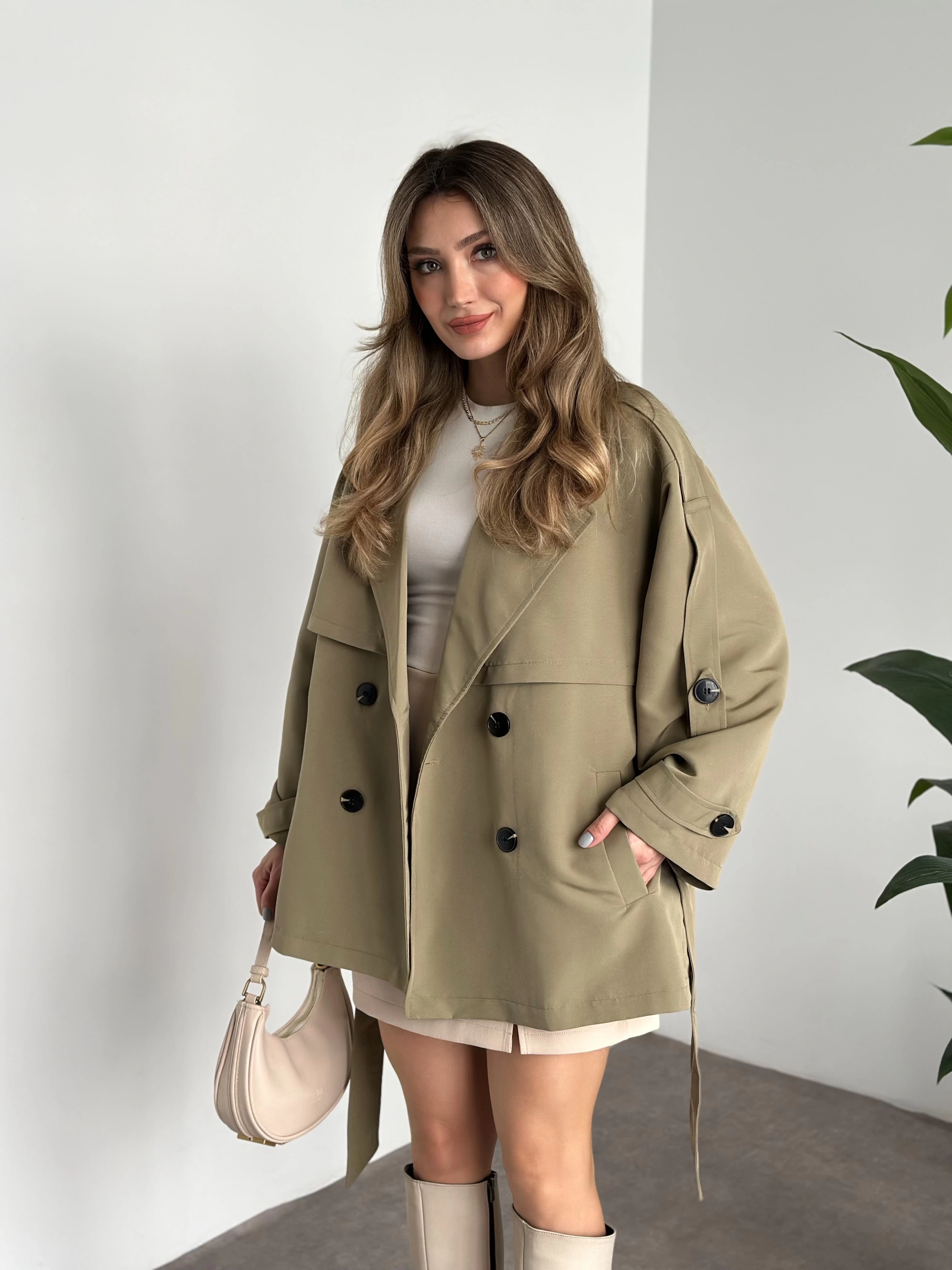 Ara boy düğmeli beli kuşaklı oversize astarlı trençkot yeşil
