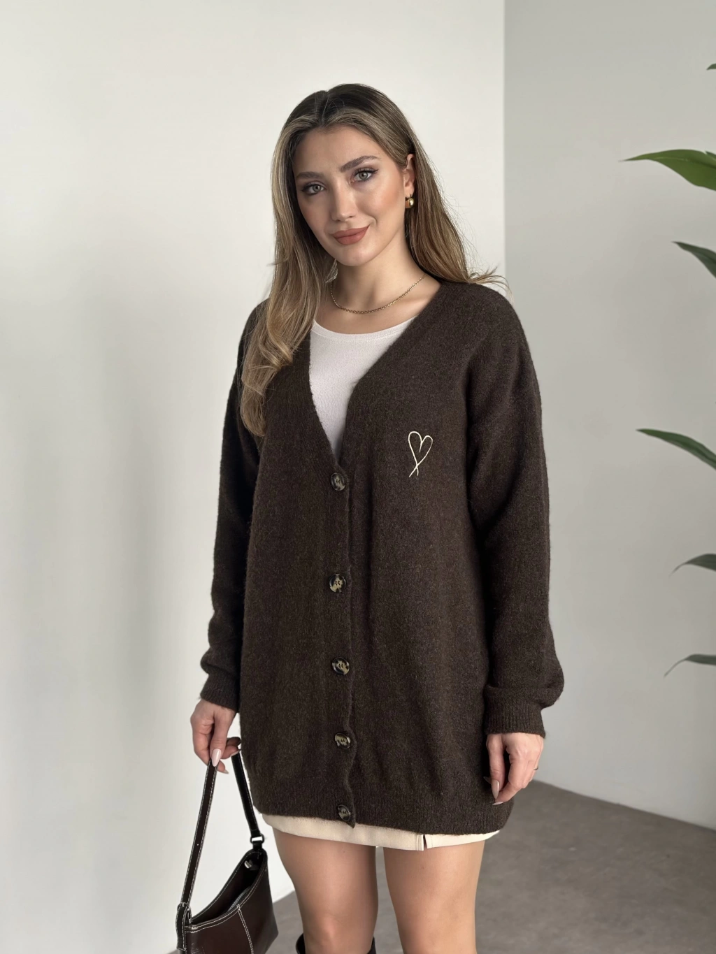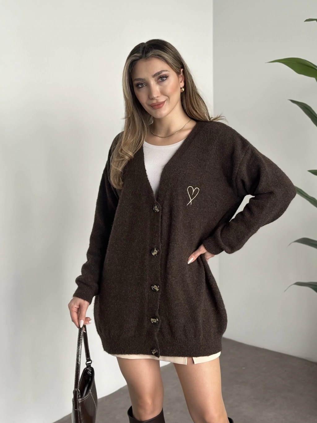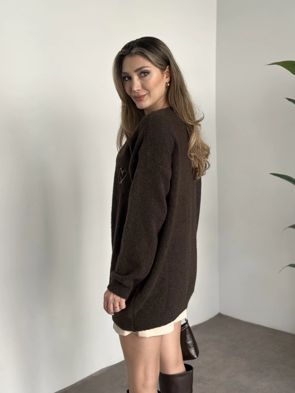 Ara boy kalp nakışlı yumuşak dokulu triko hırka kahve