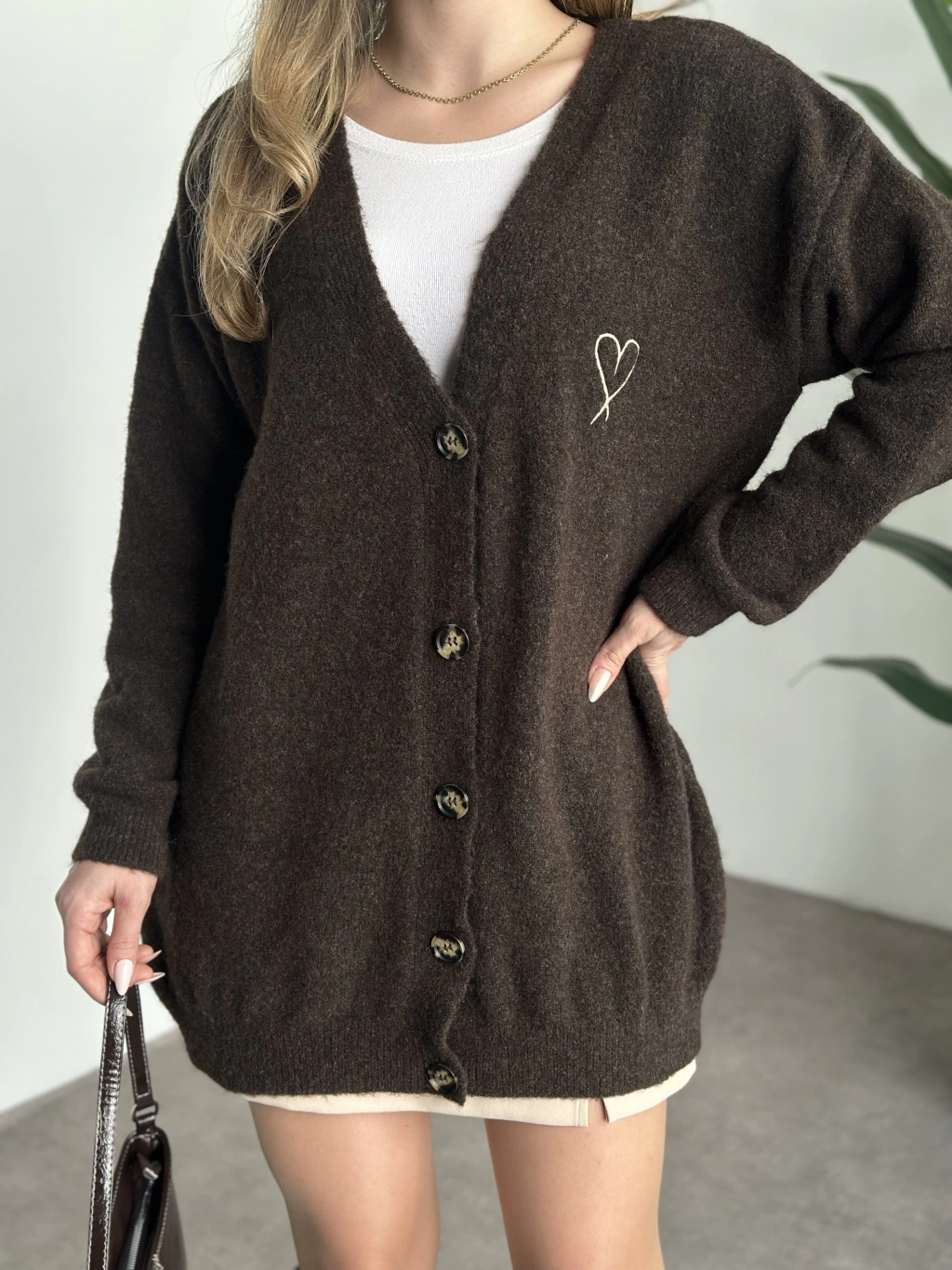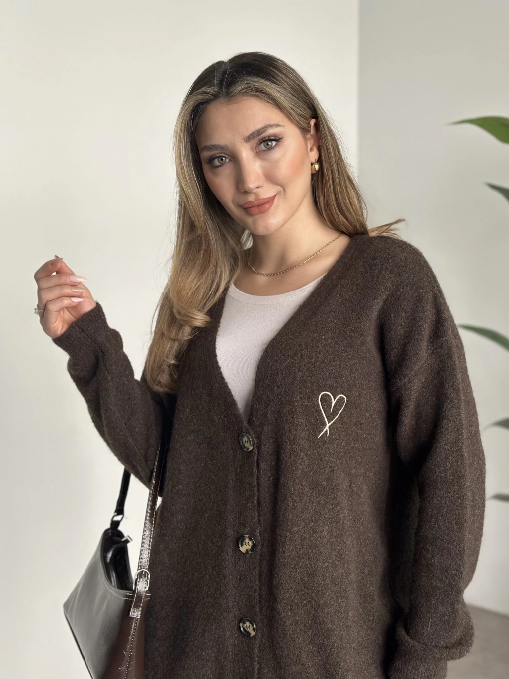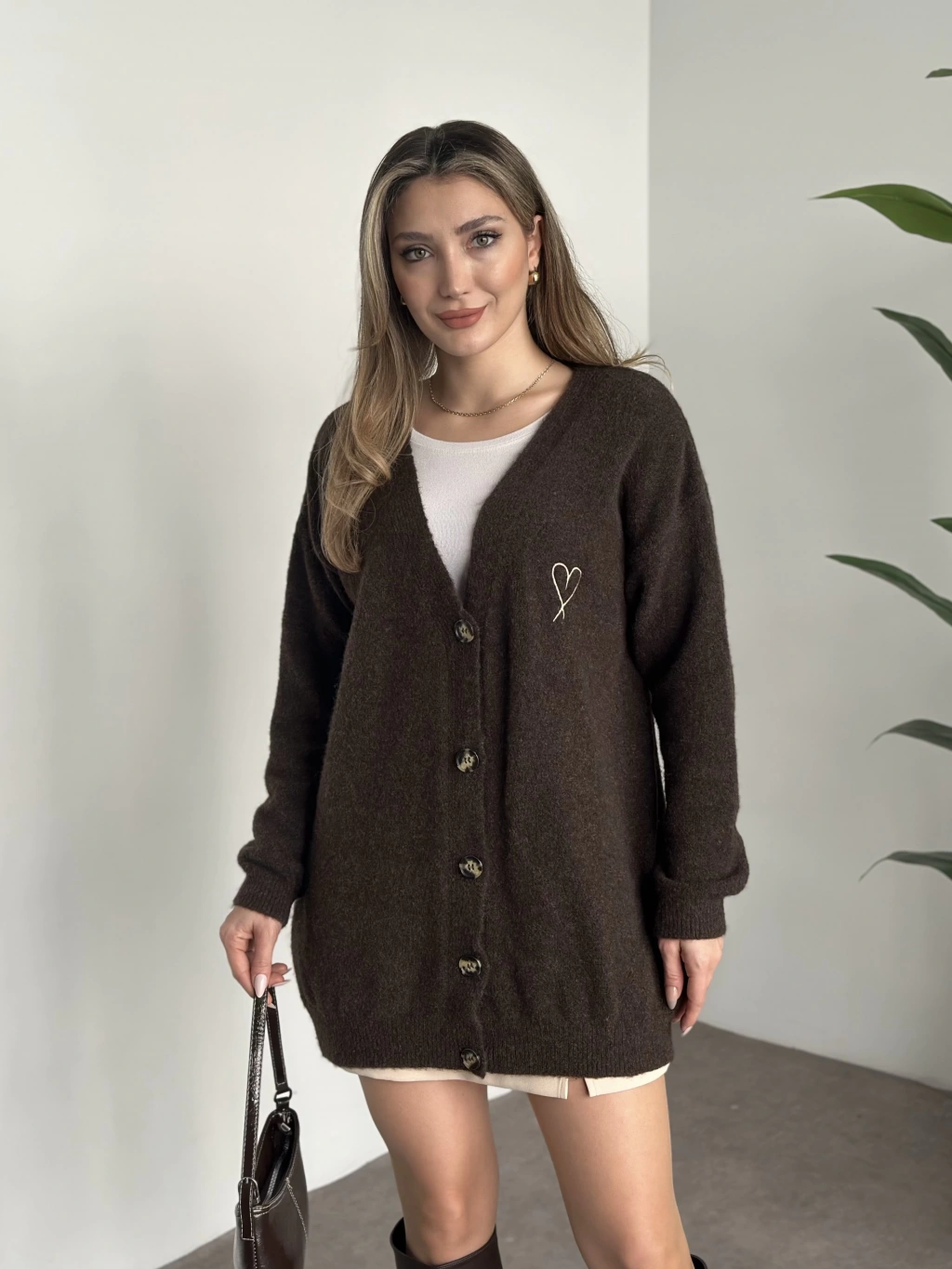 Ara boy kalp nakışlı yumuşak dokulu triko hırka kahve