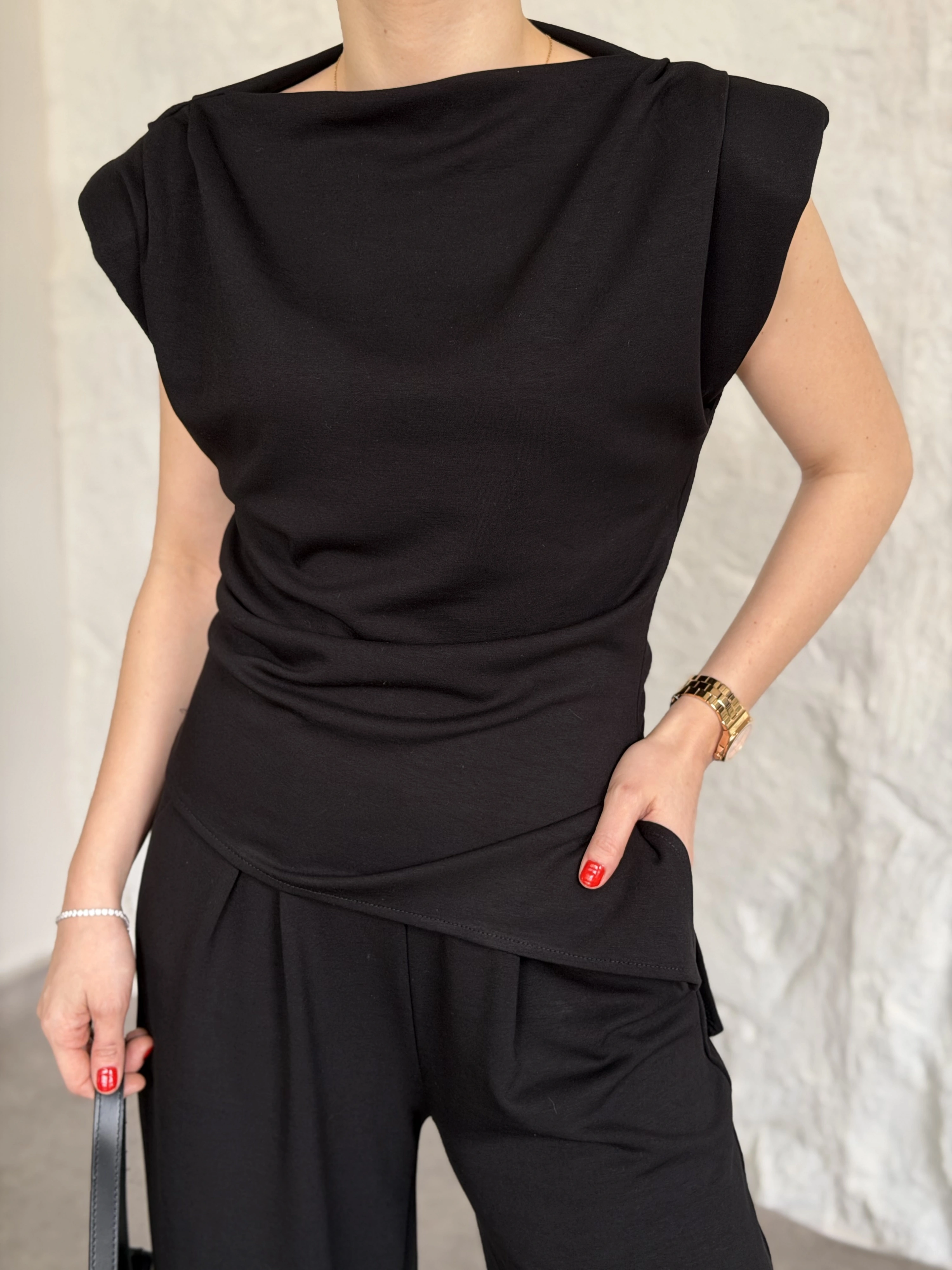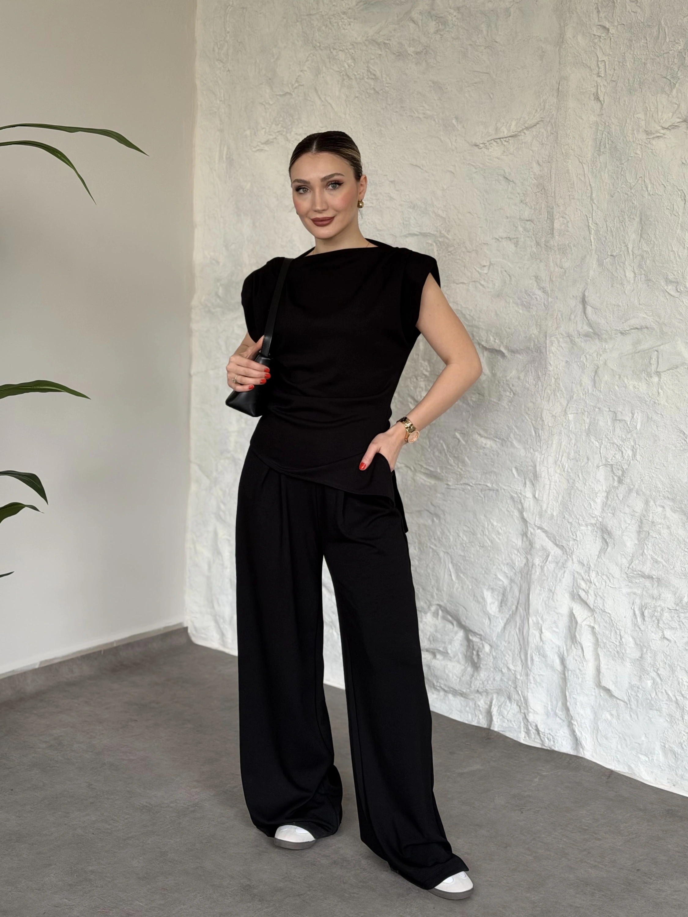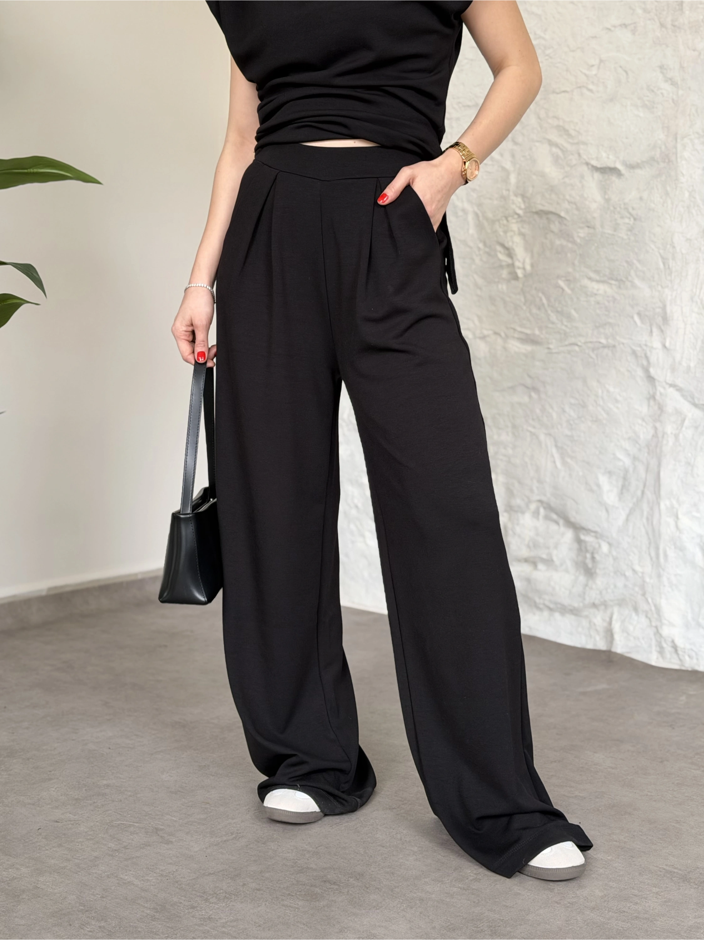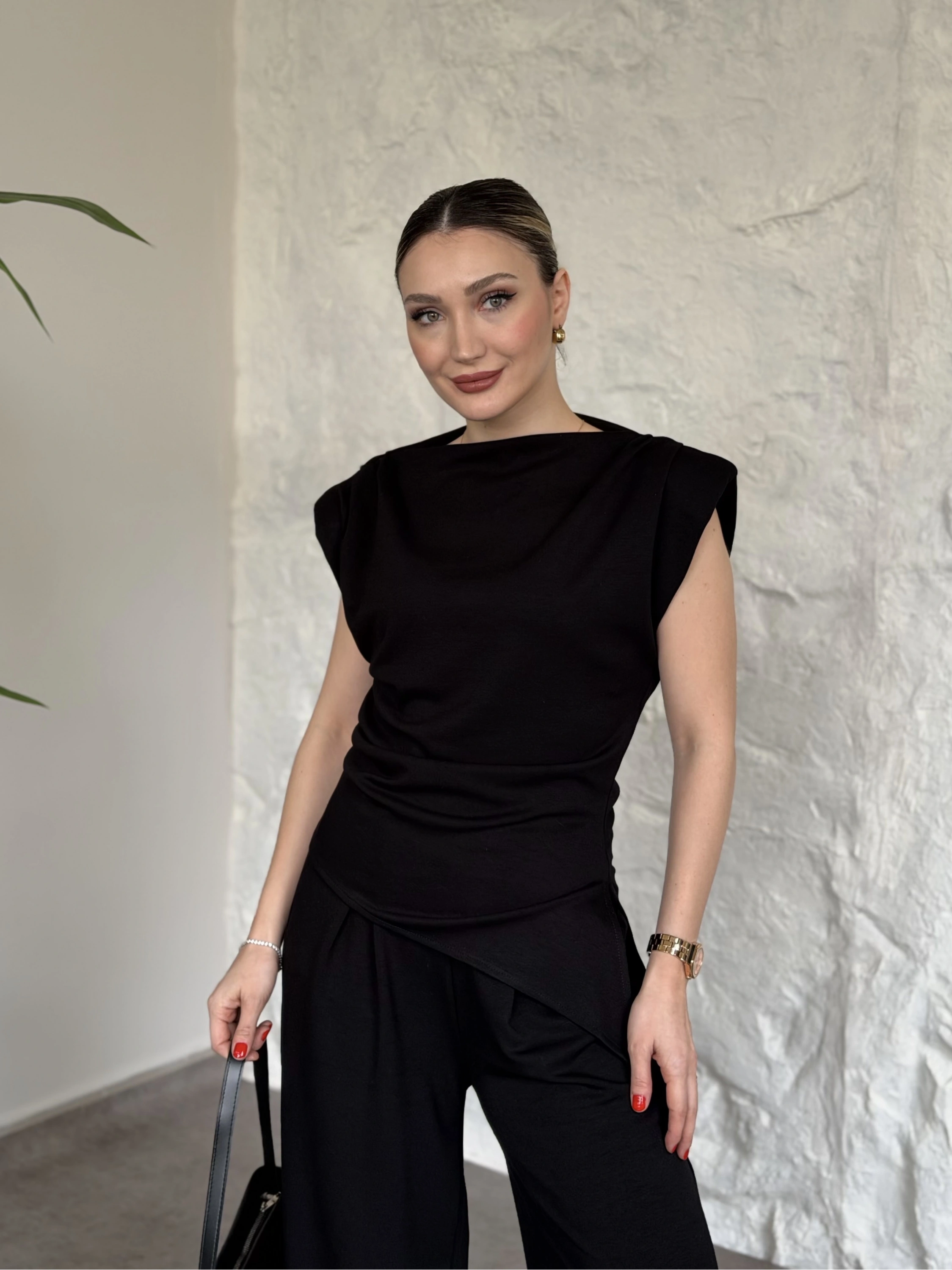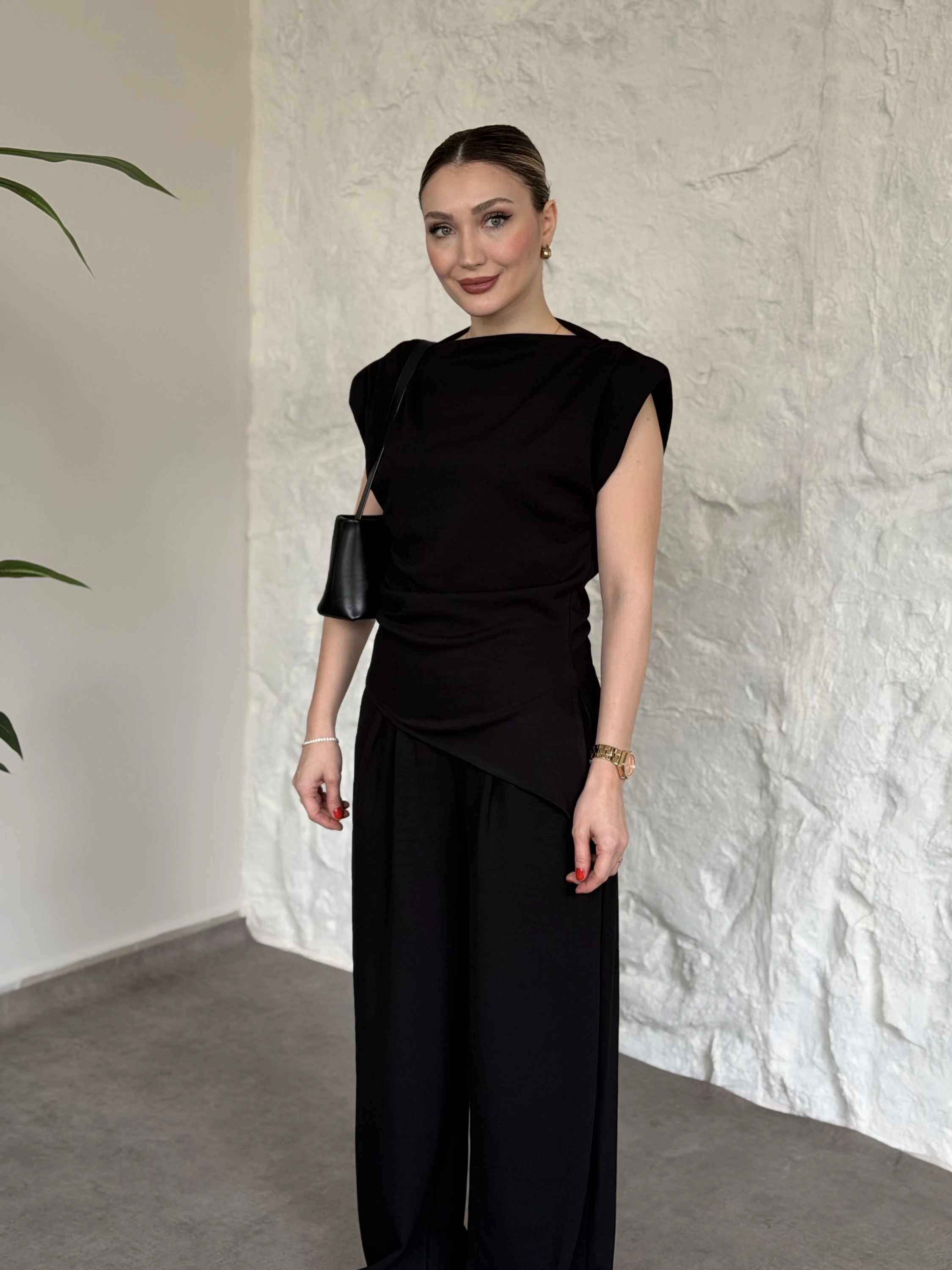 Sıfır kol belden bağlamalı kumaş takım siyah