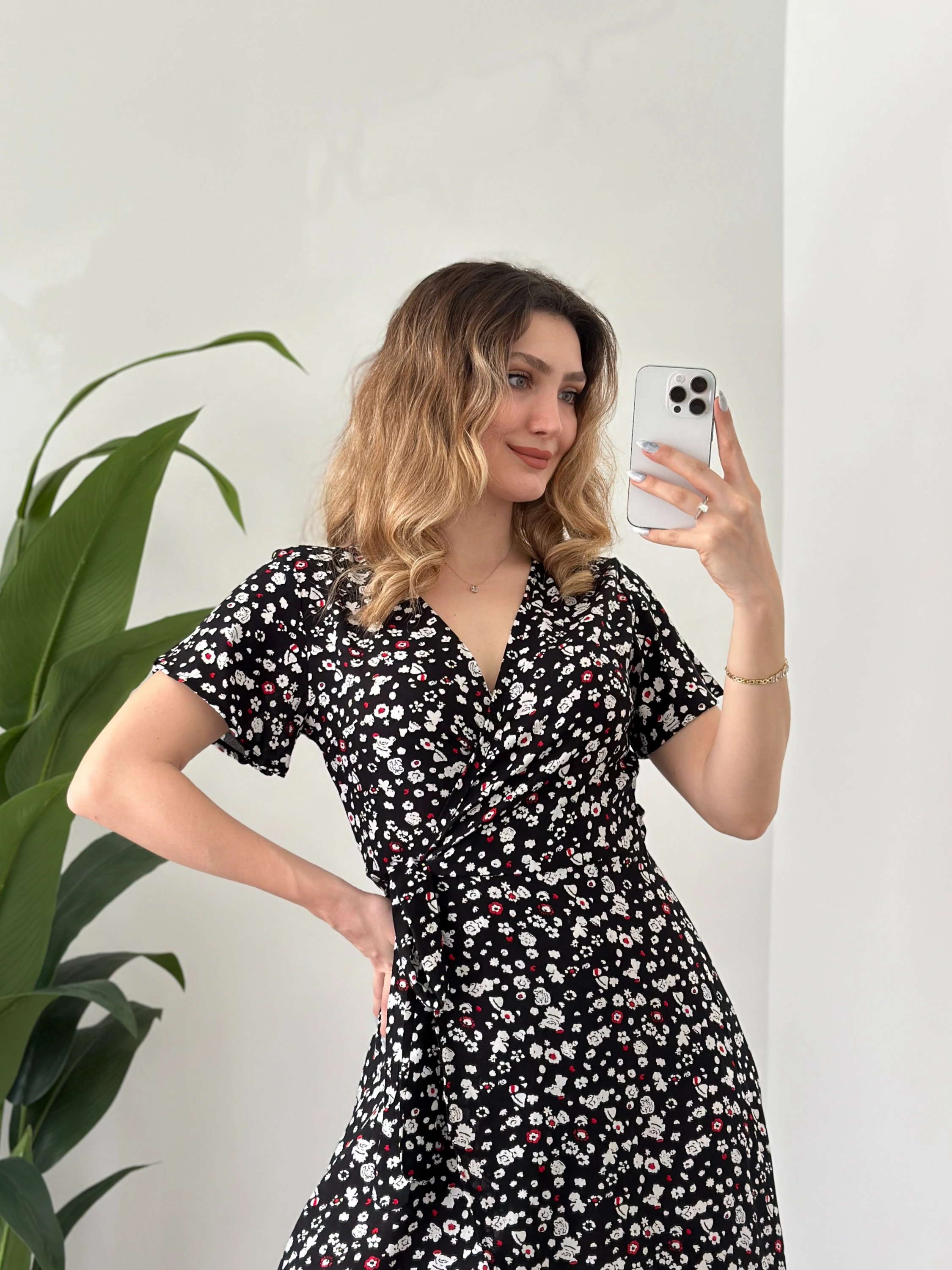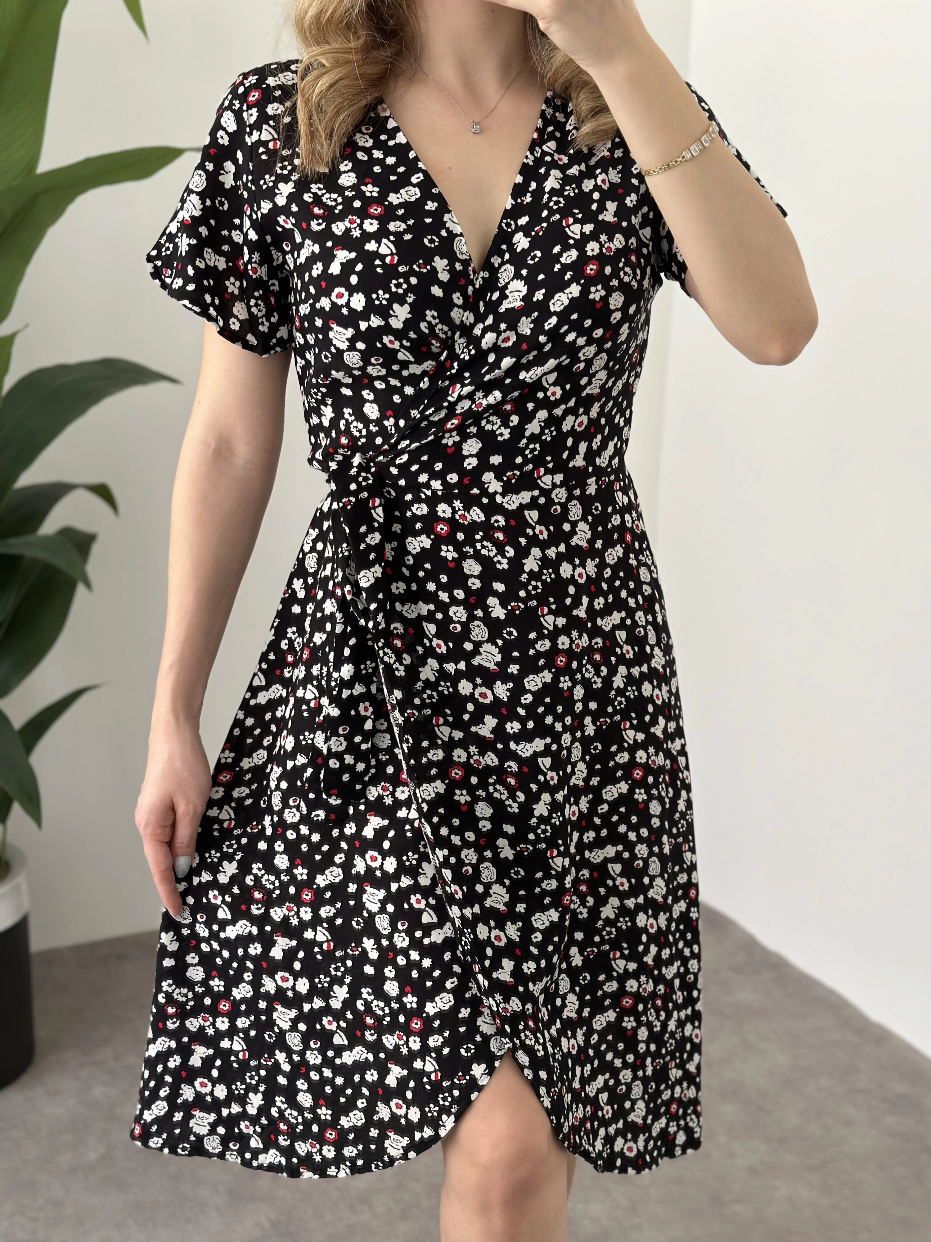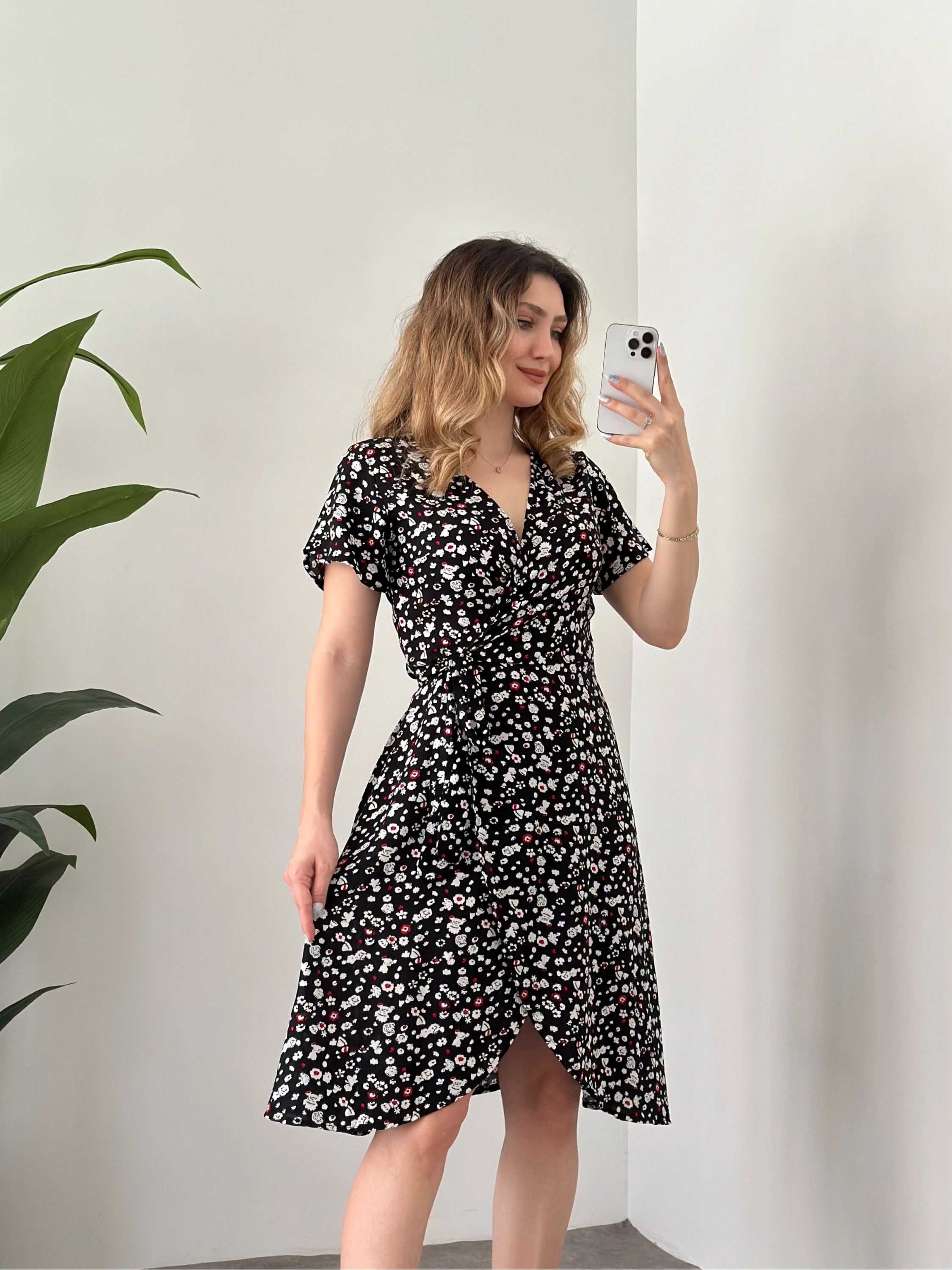 Asimetrik Kesim Önden Bağlamalı Viskon Elbise Siyah Beyaz