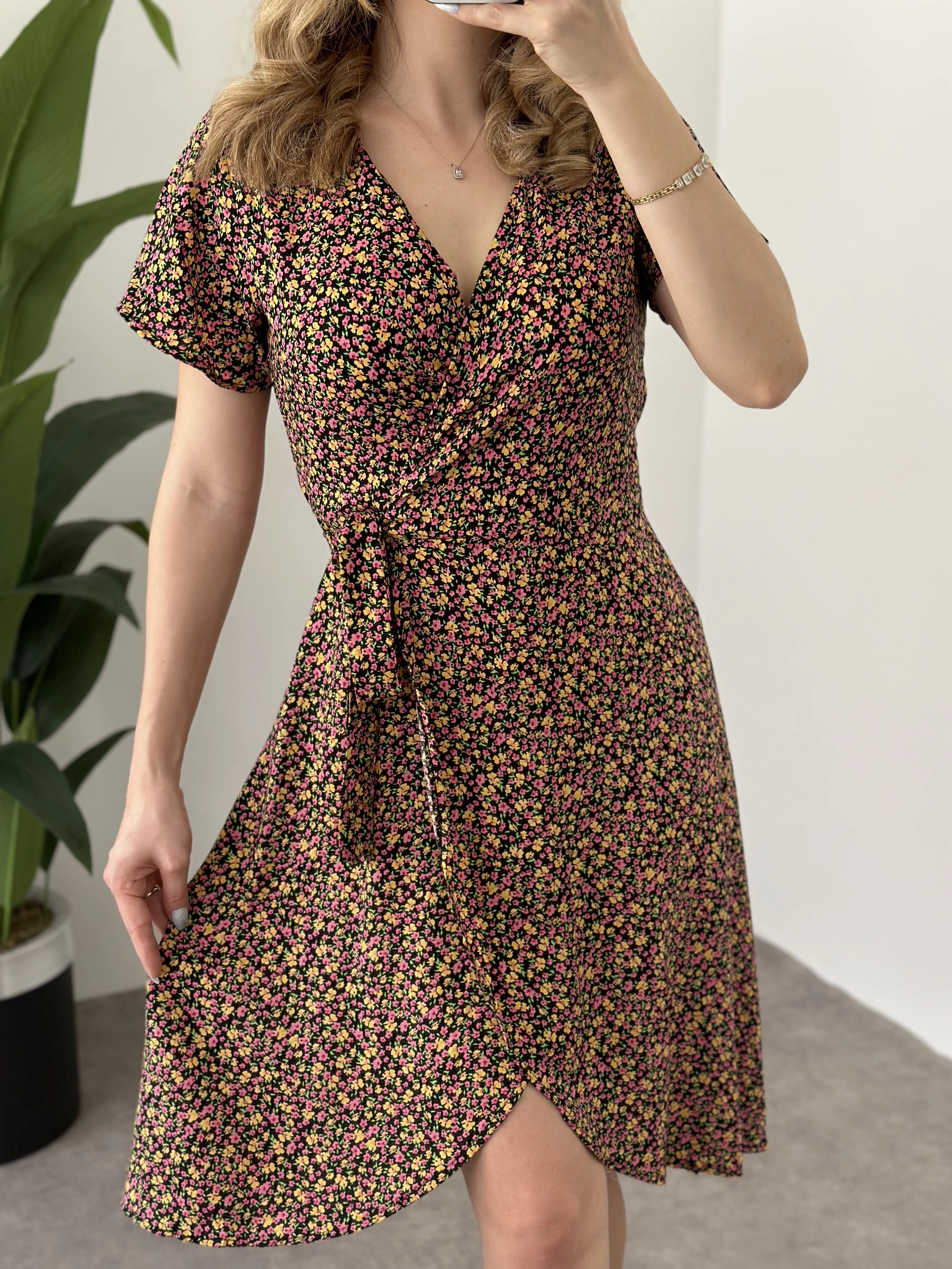 Asimetrik Kesim Önden Bağlamalı Viskon Elbise Siyah Pembe