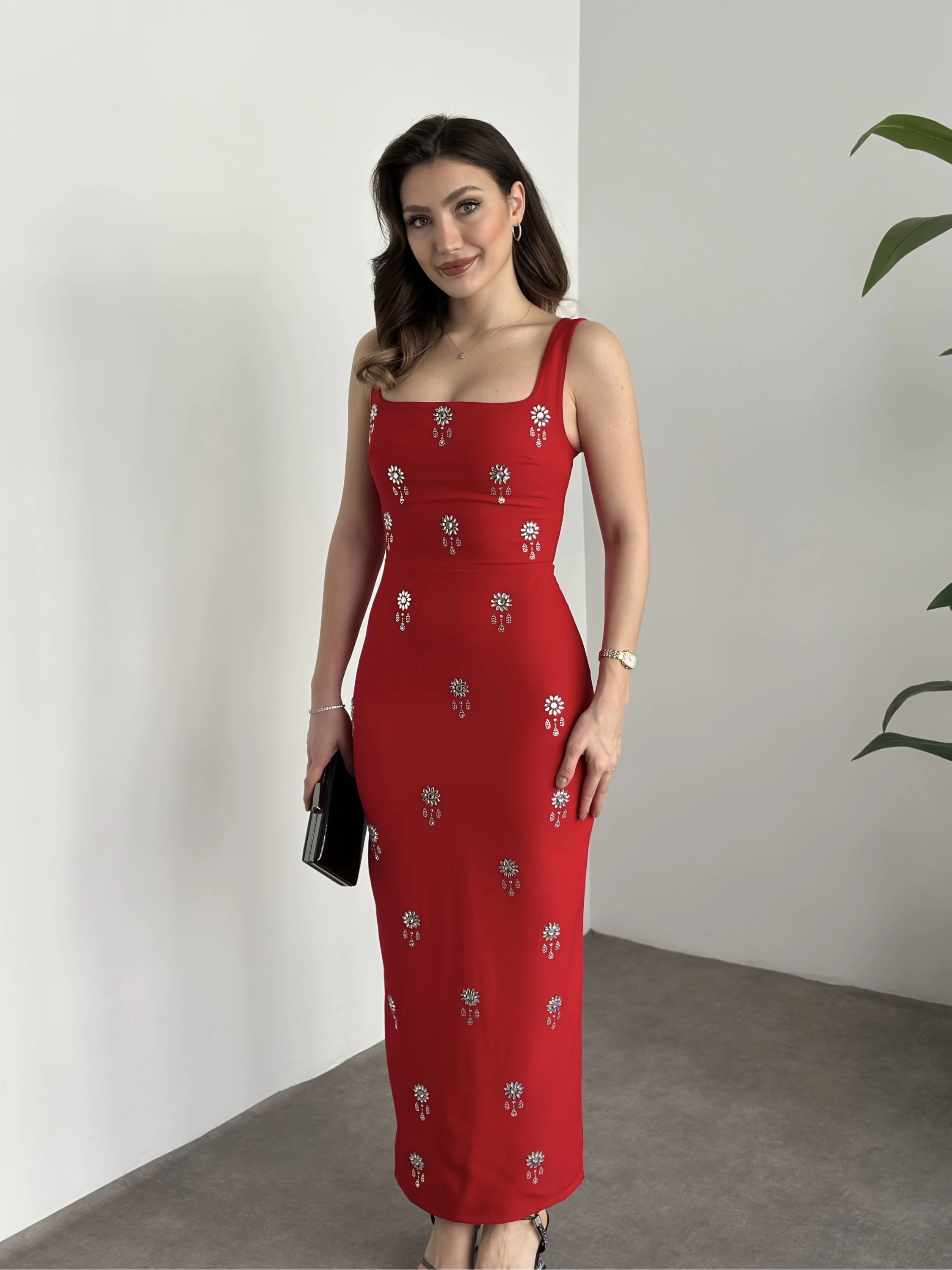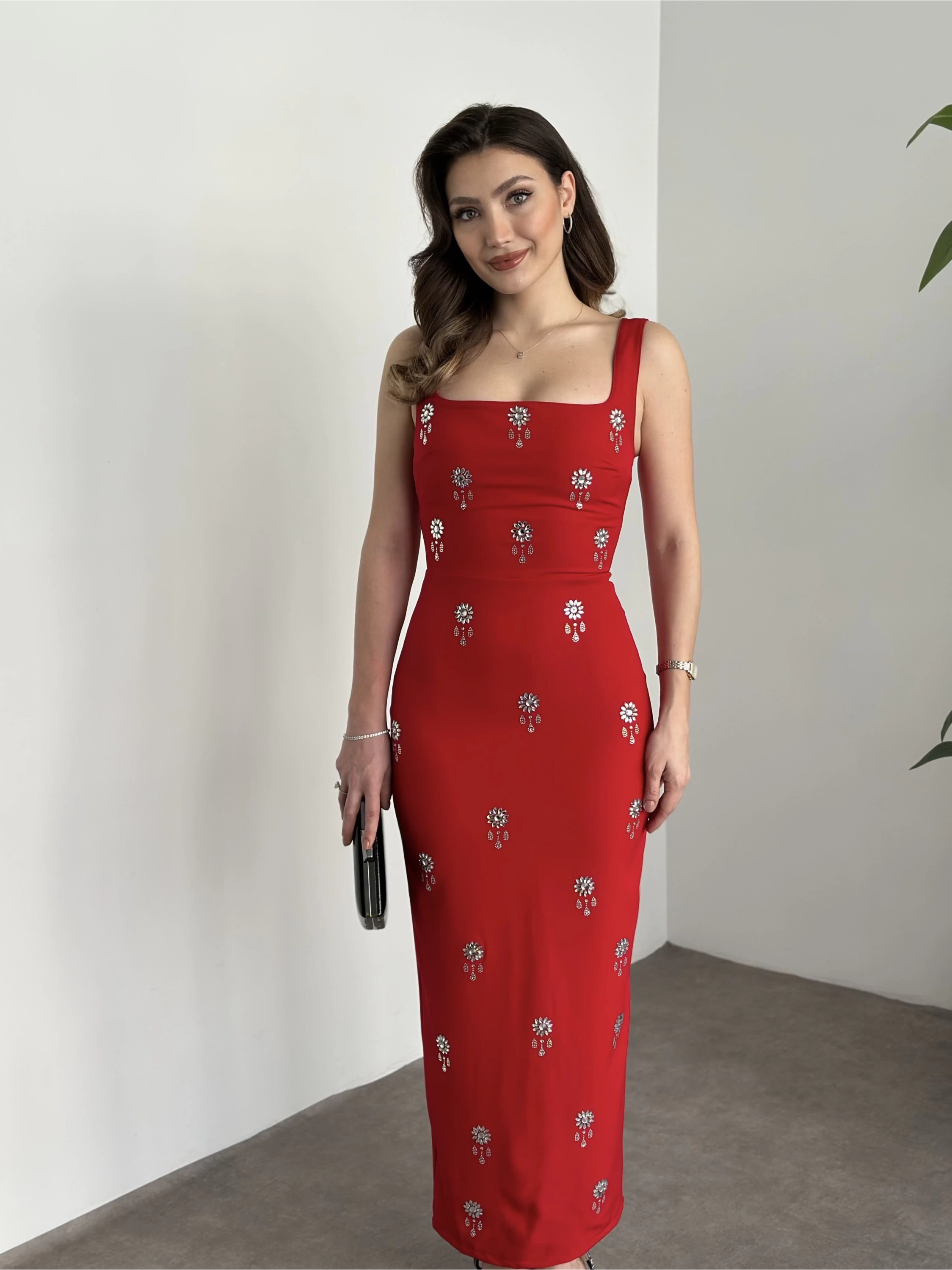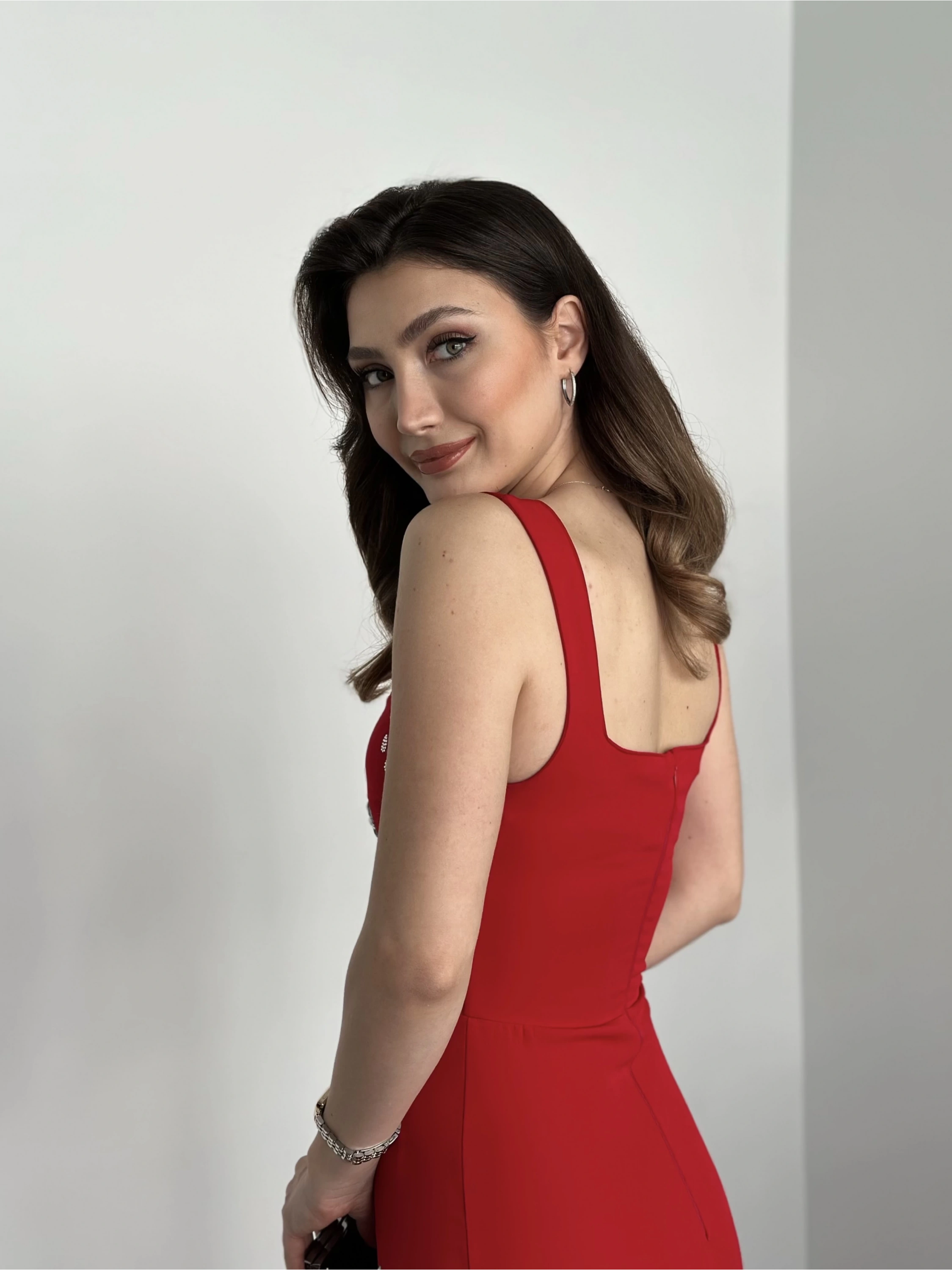 Yanları büzgülü aksesuar detaylı mini elbise kırmızı