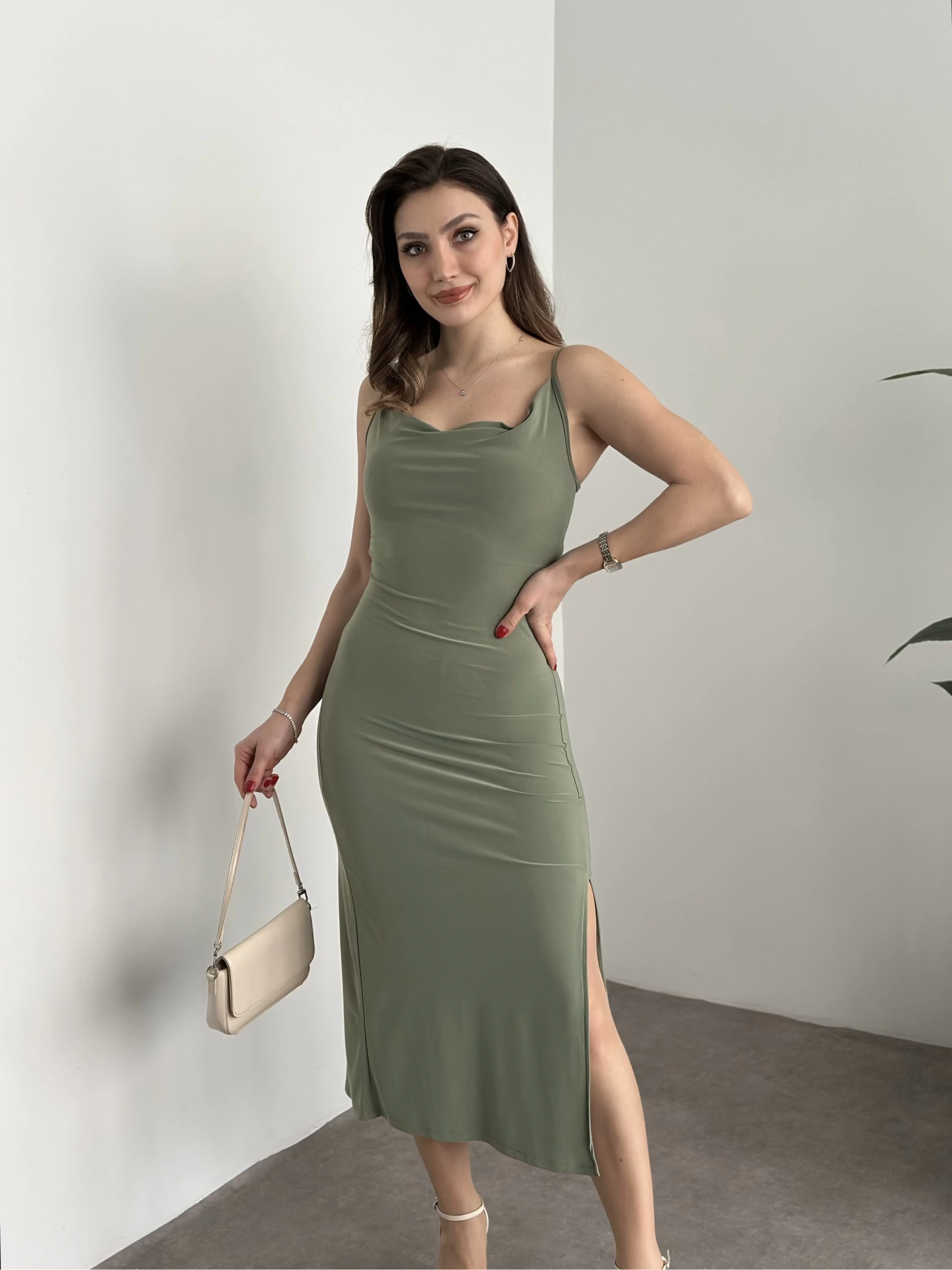 Askılı yırtmaç detaylı ithal sandy kumaş elbise yeşil