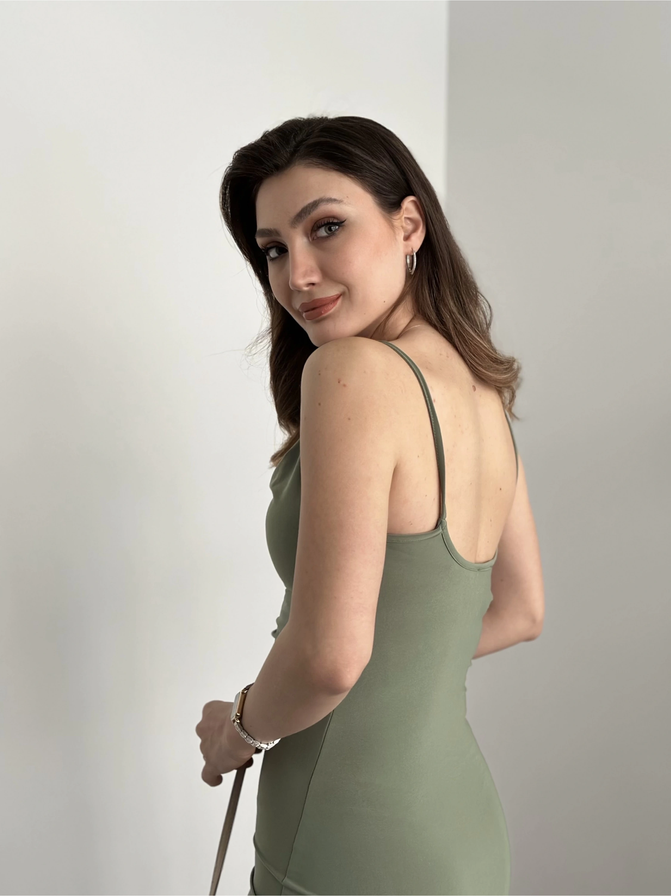 Sırtı bağlama dekolte detaylı tensel kumaş takım haki