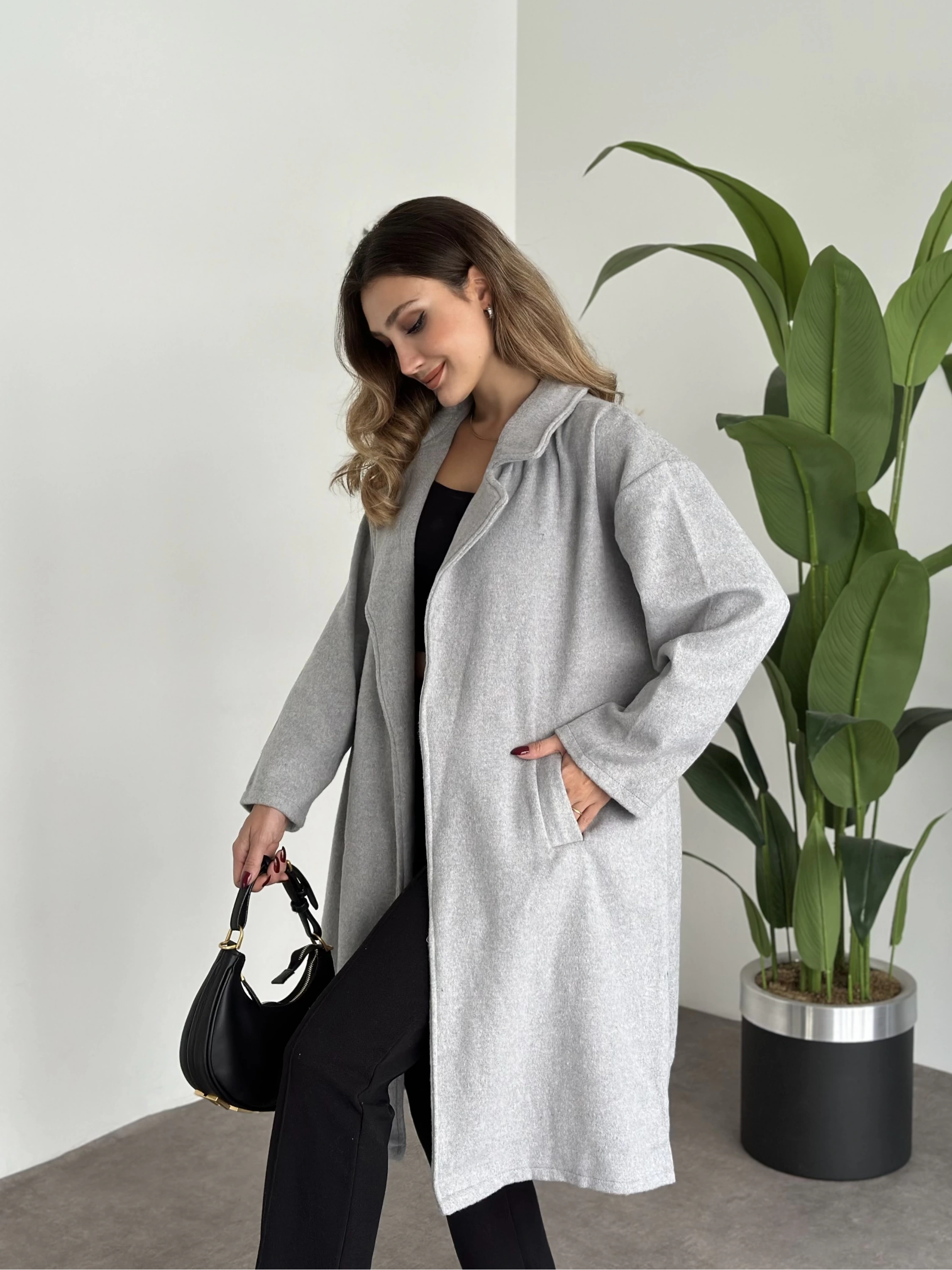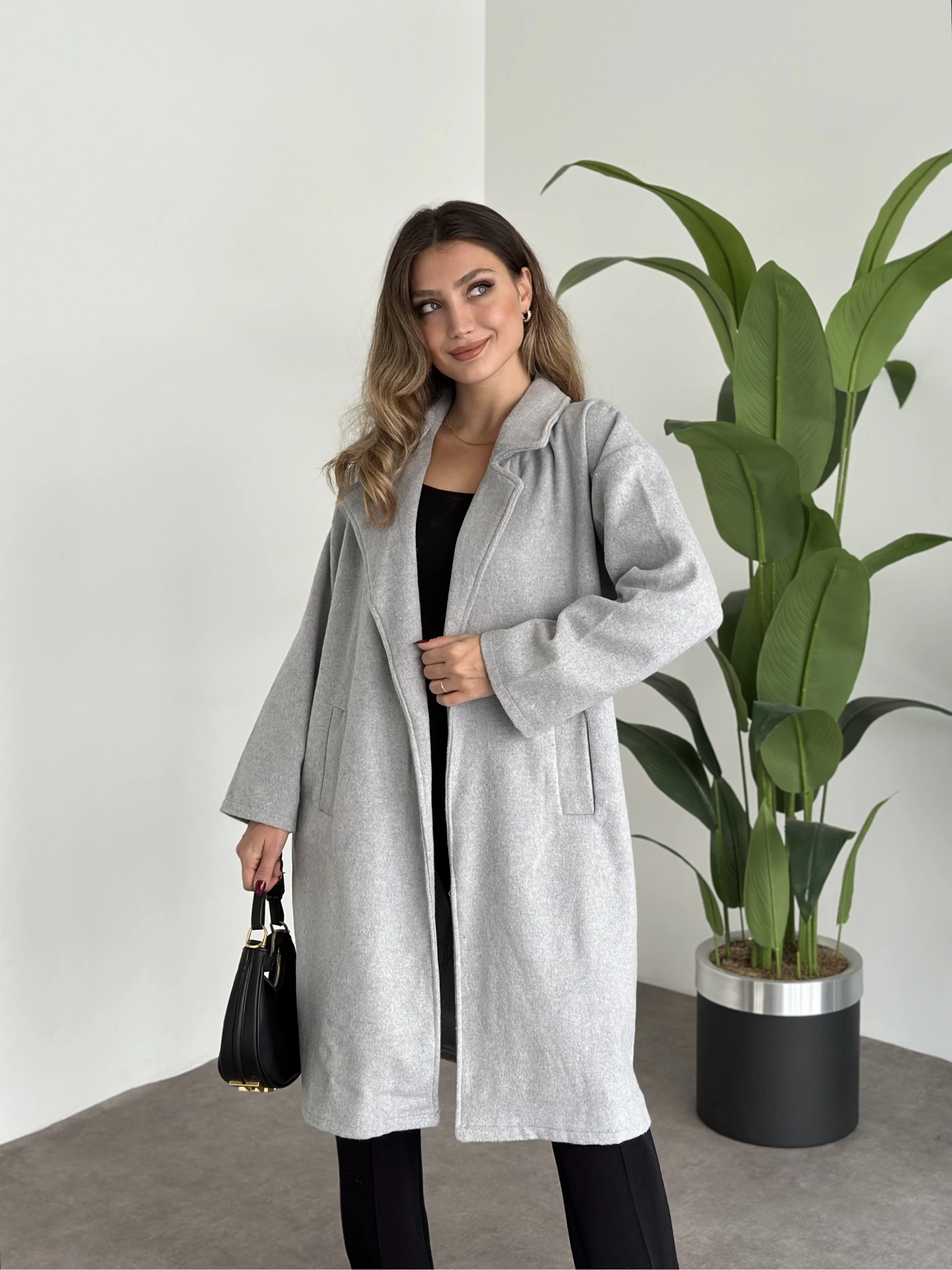 Oversize düğmeli astarlı bağlamalı kaşe kaban antrasit