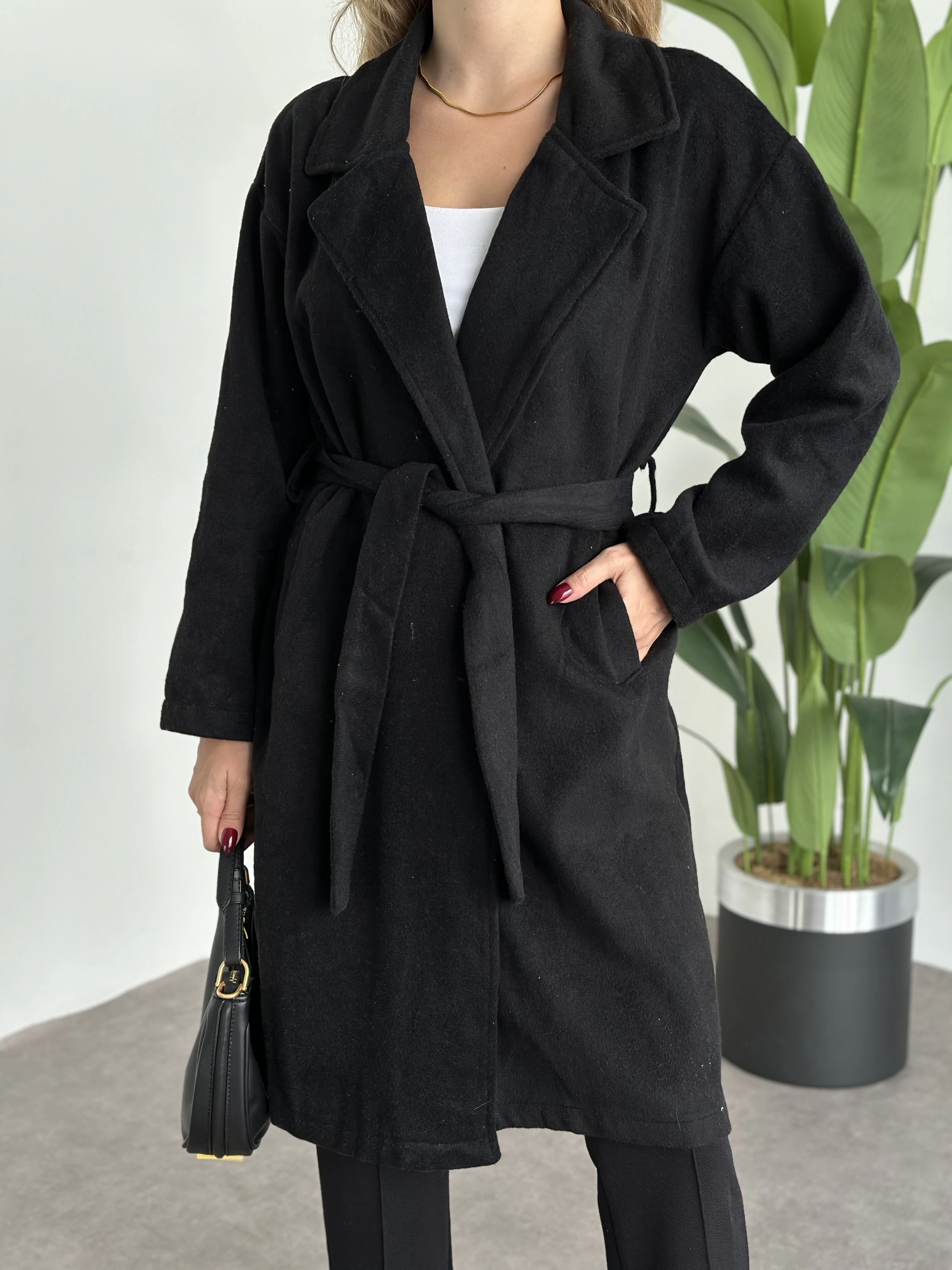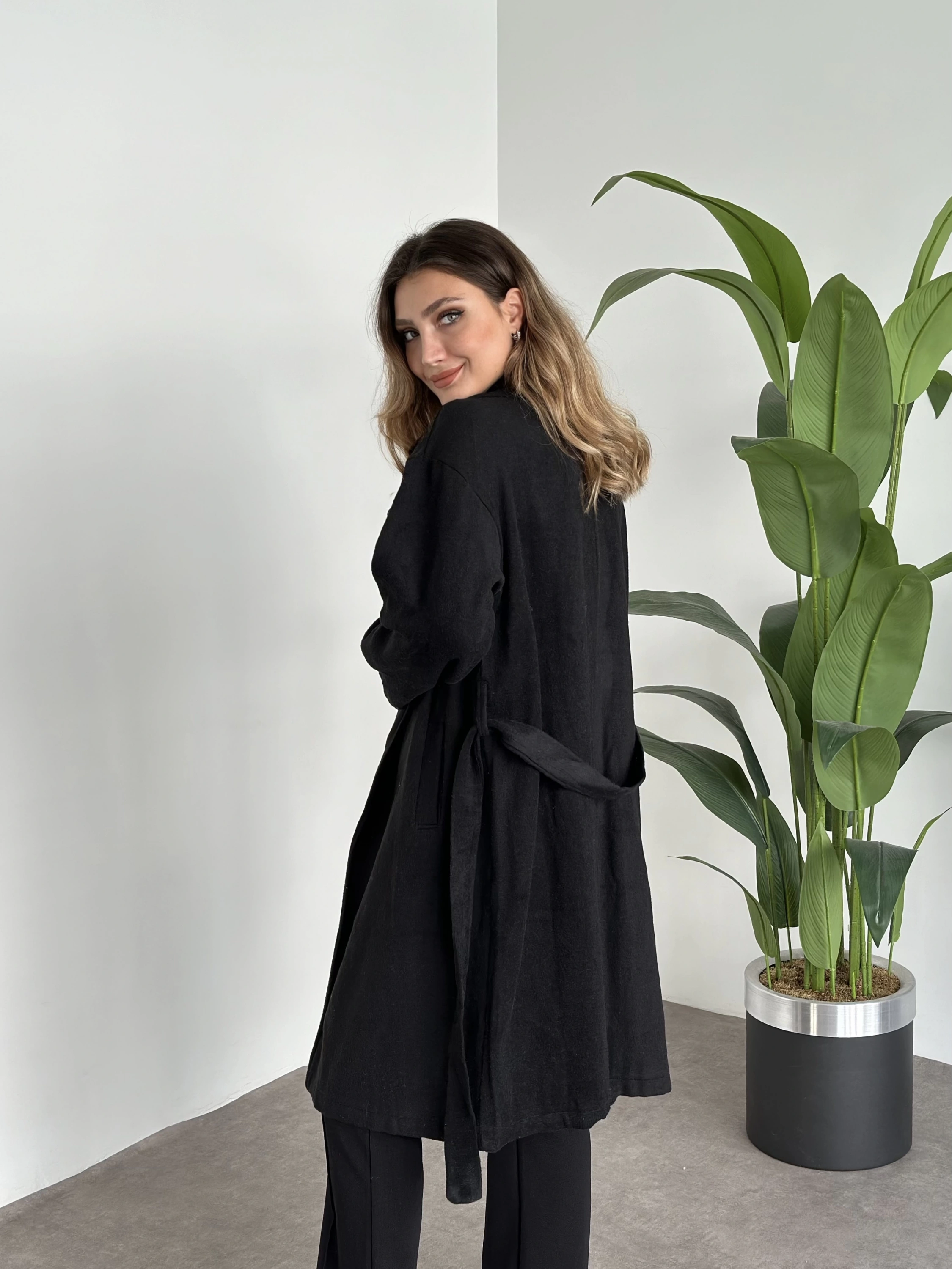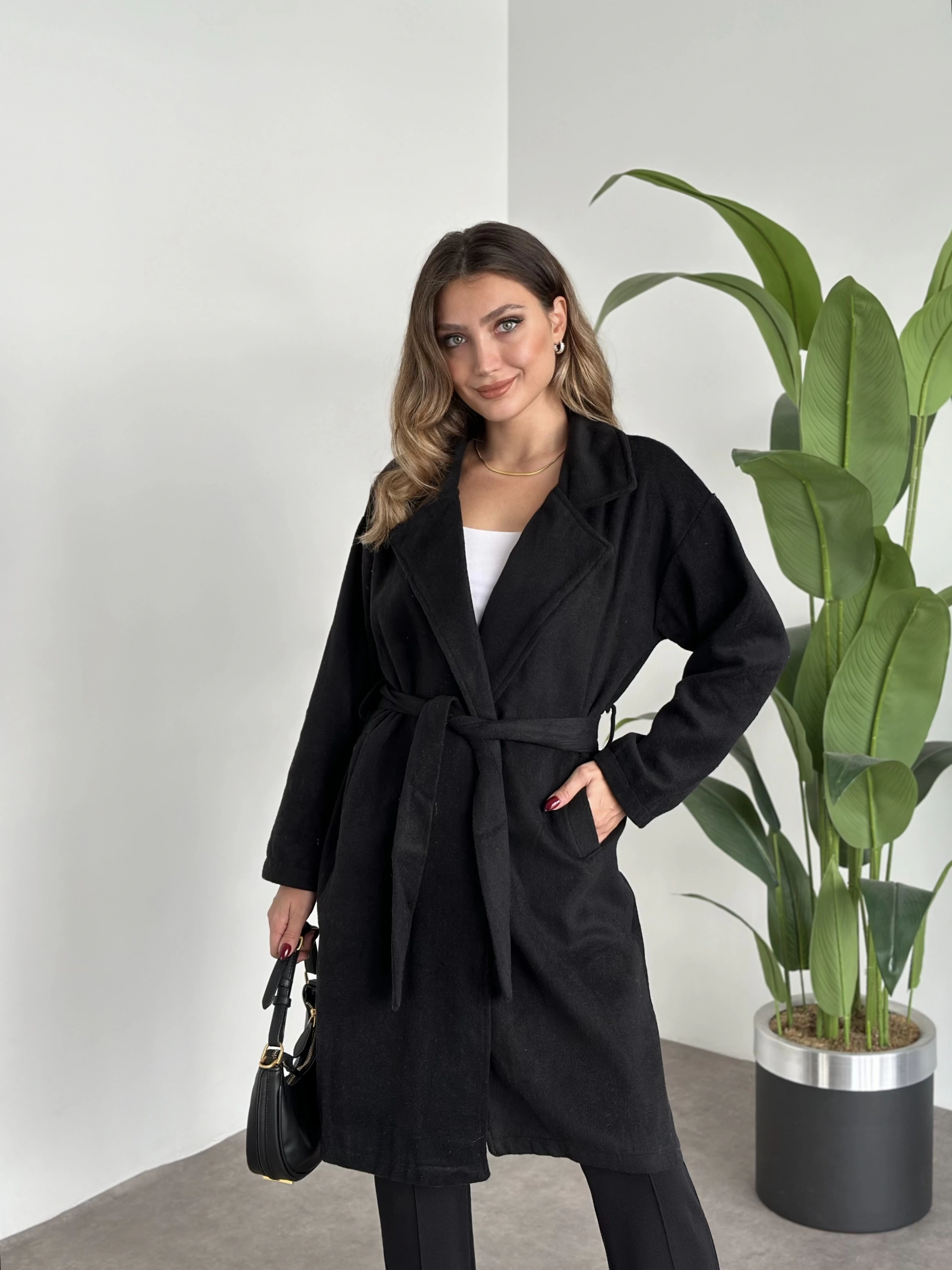Astarsiz kaşe uzun trenç siyah