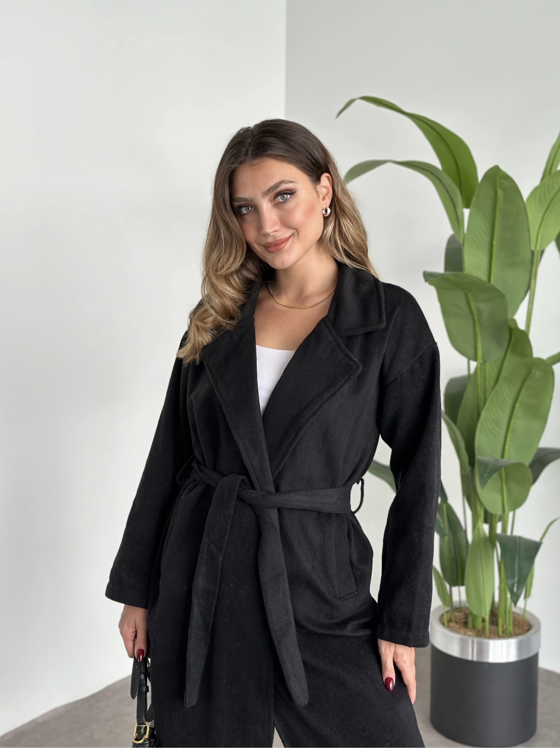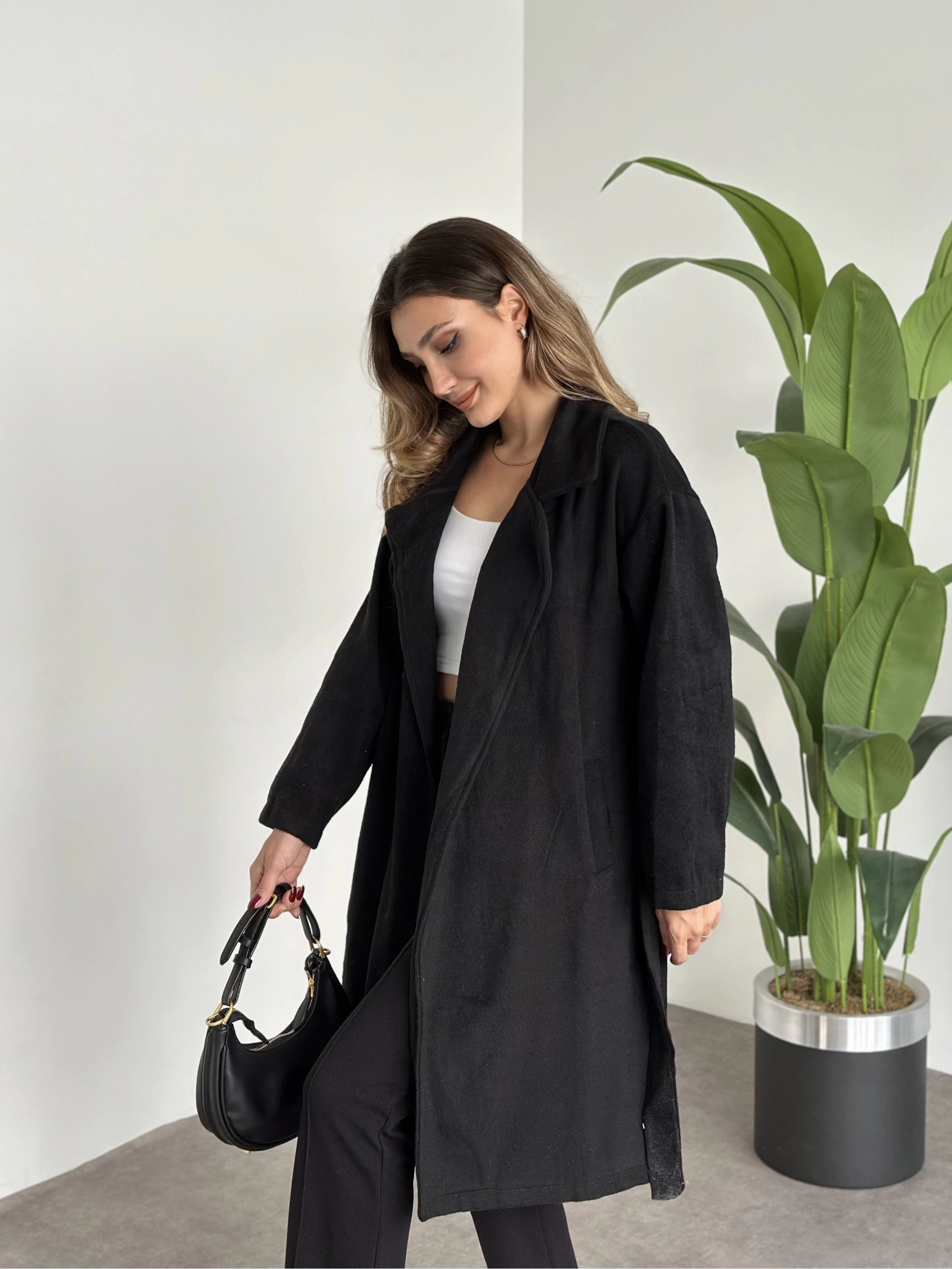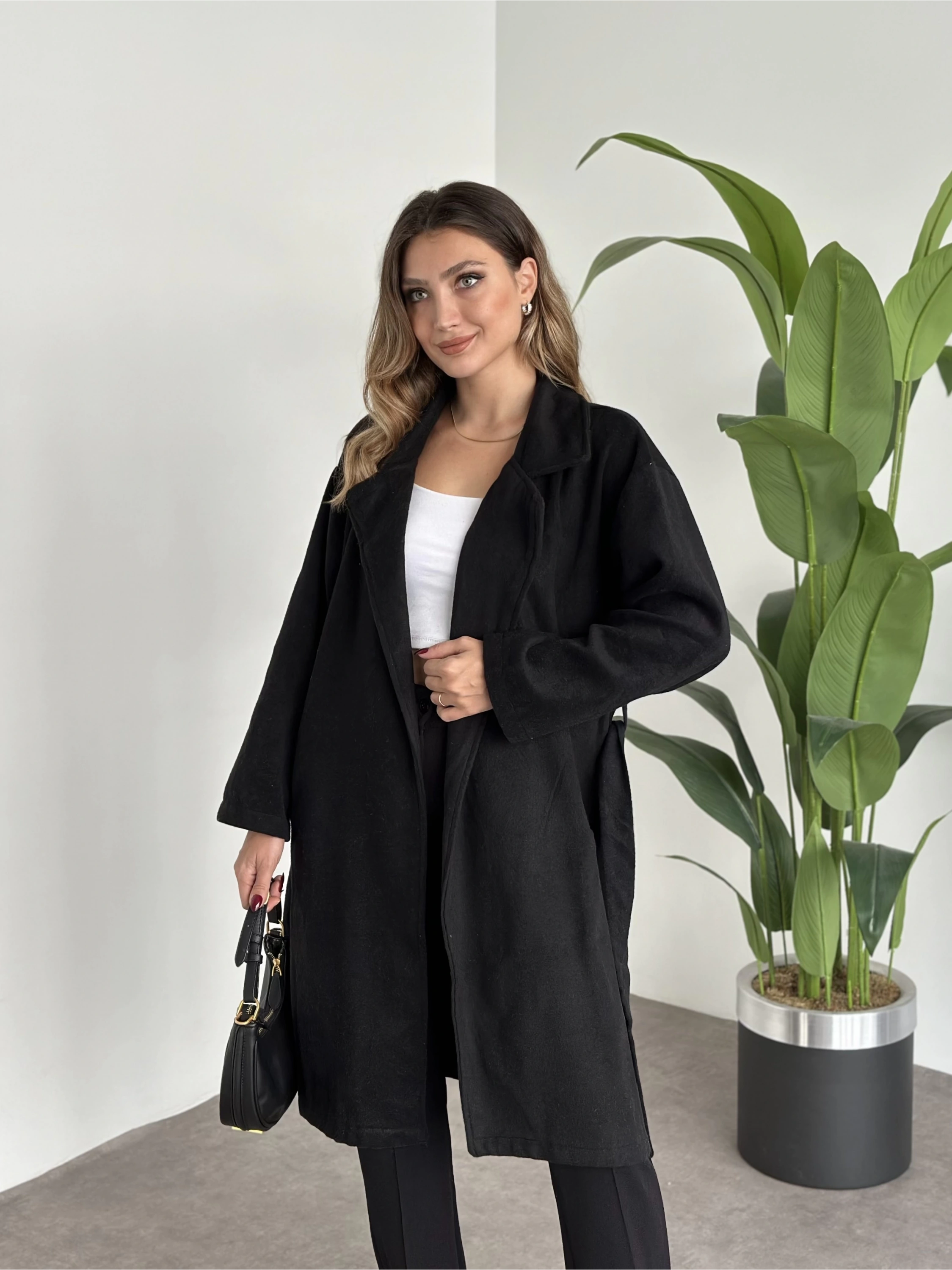 Astarsiz kaşe uzun trenç siyah