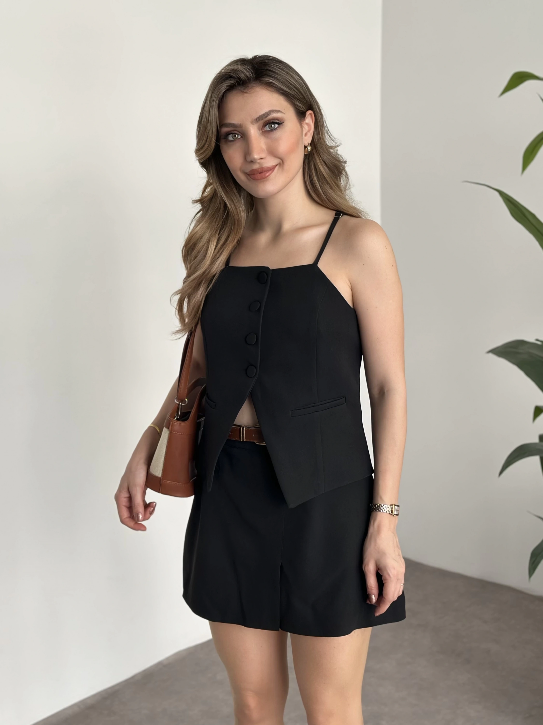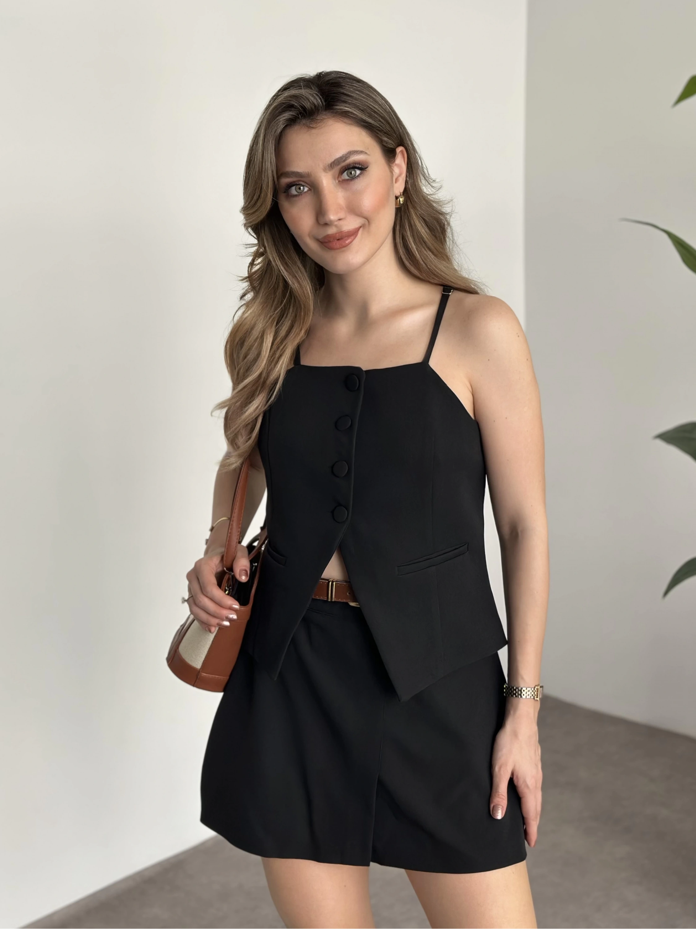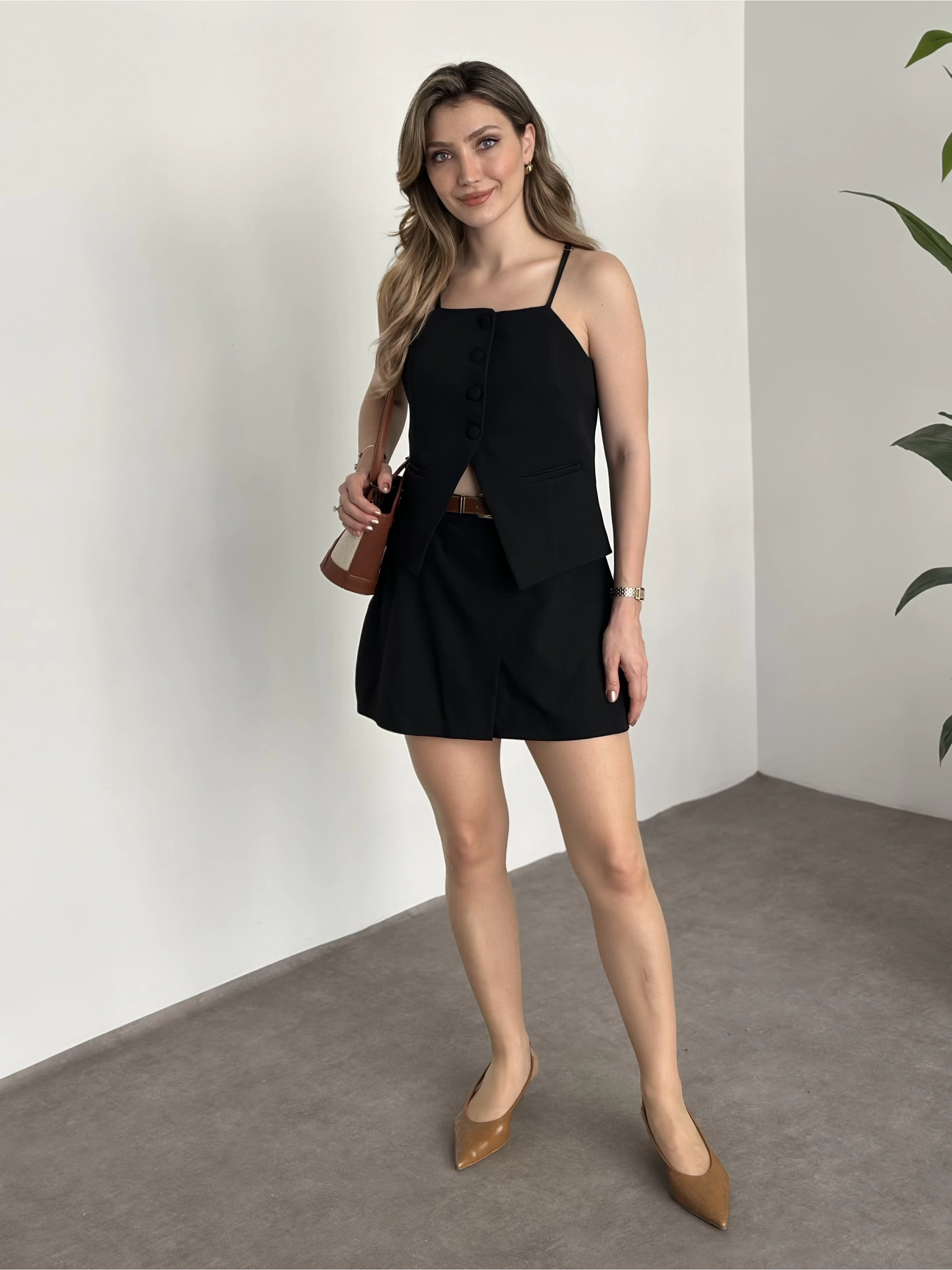 Ayarlanabilir askılı şort etekli mini takım siyah
