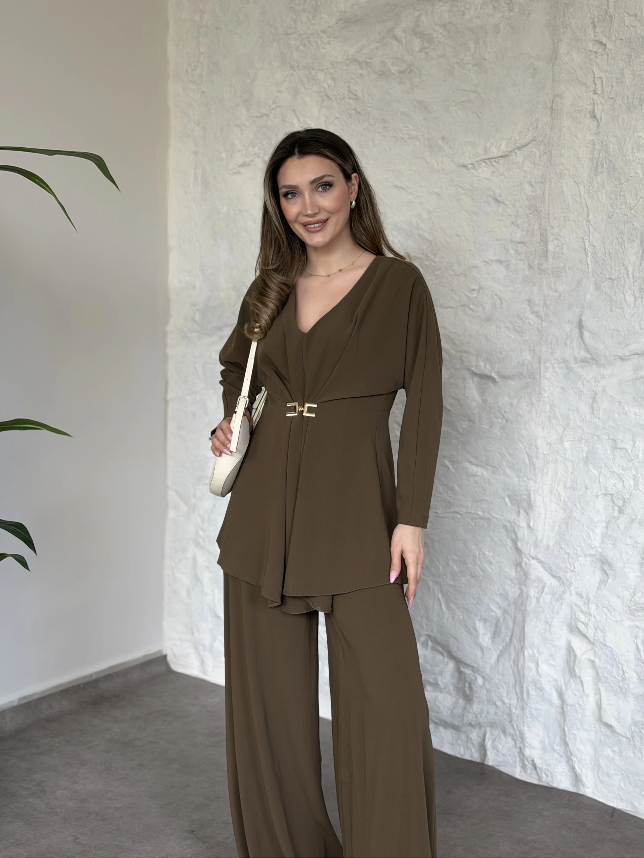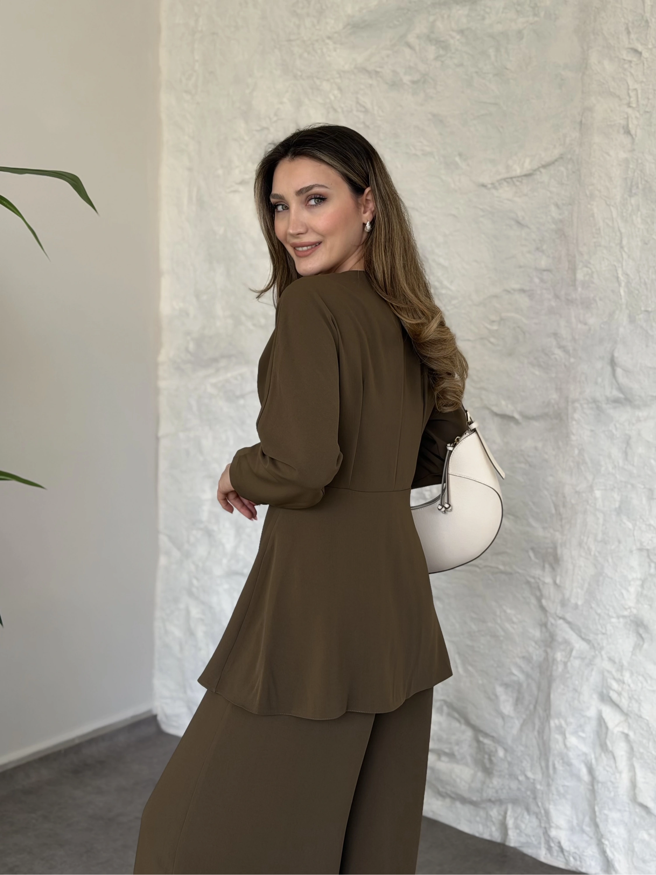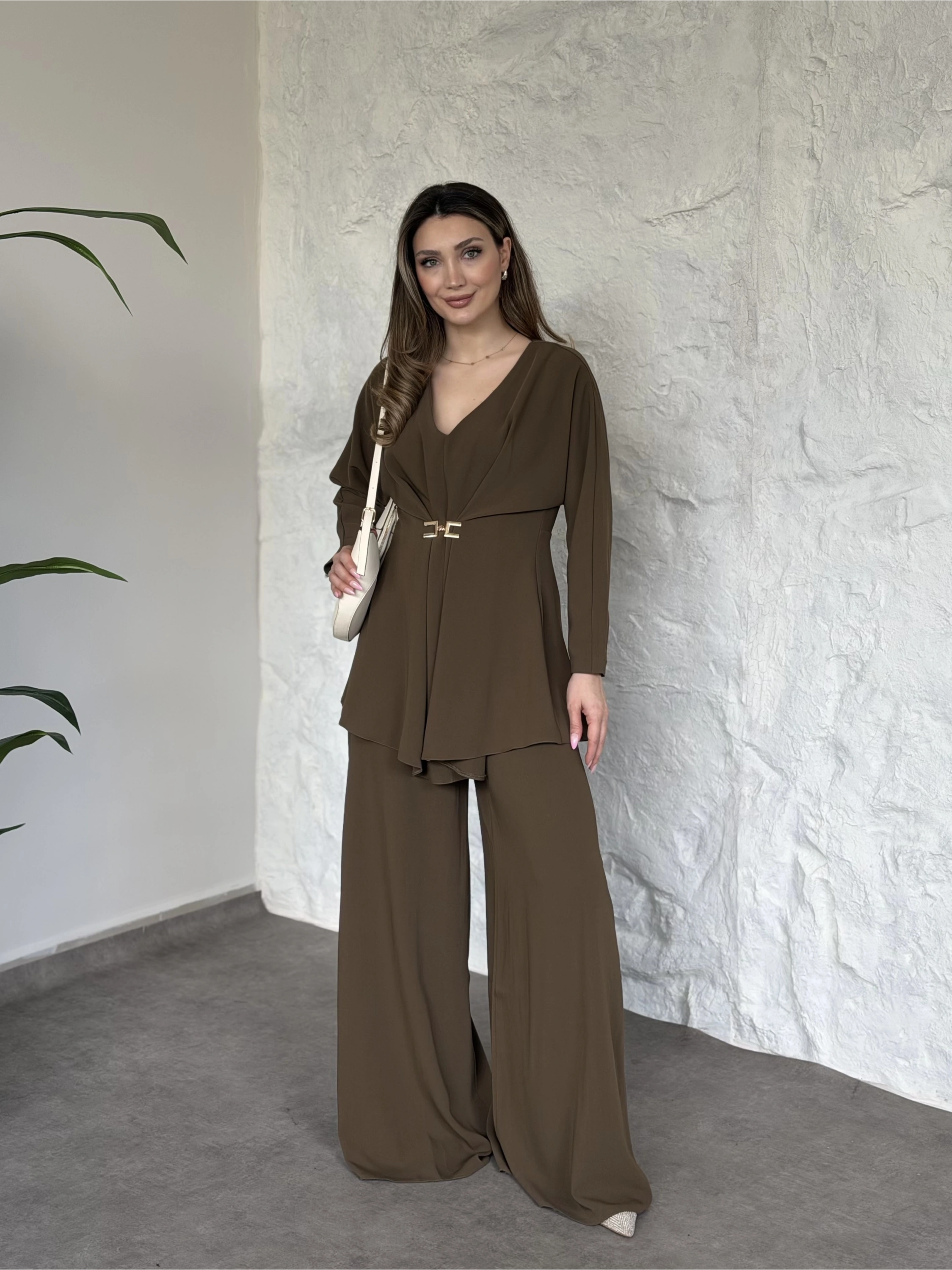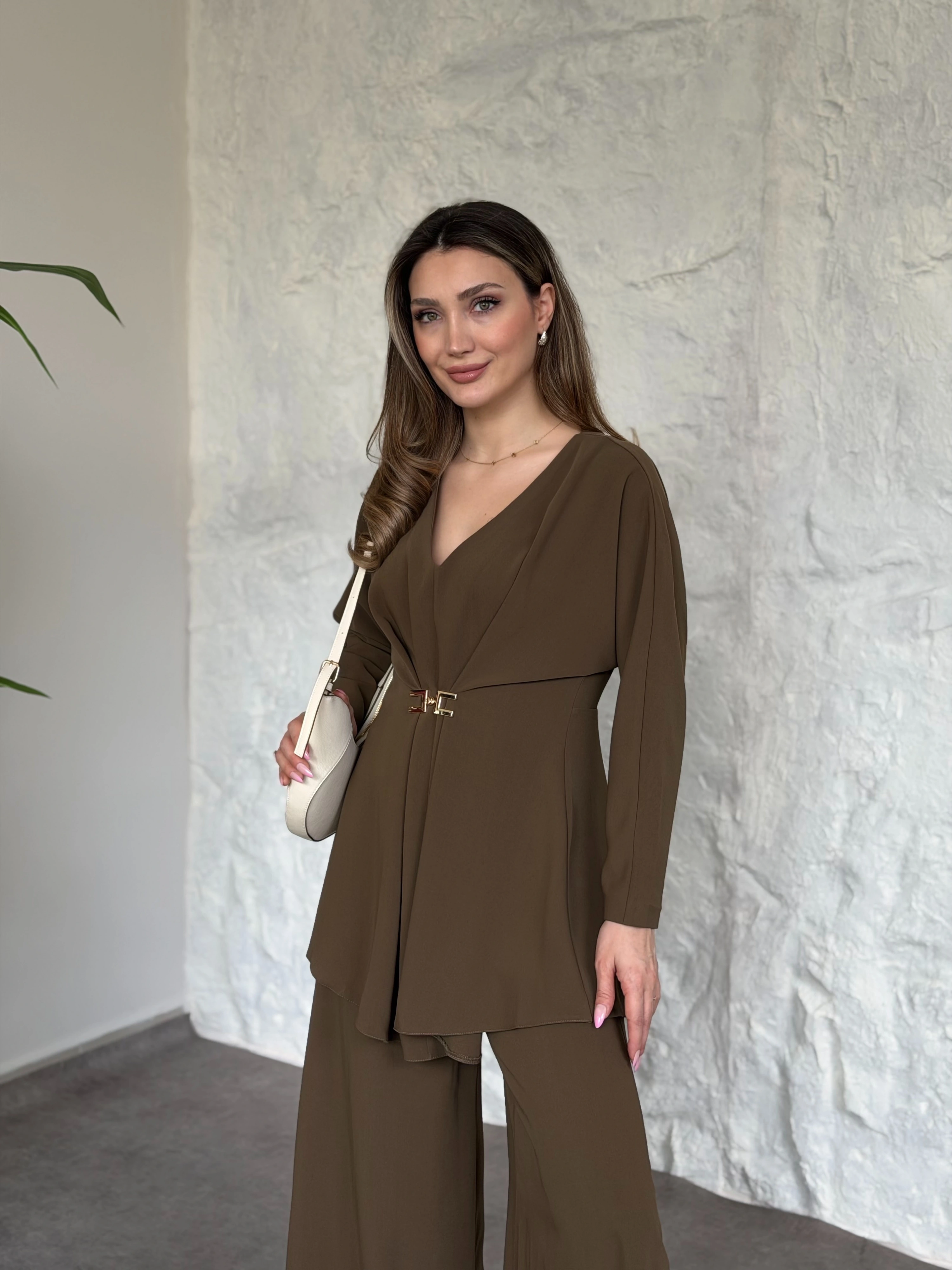 Düğme detaylı yelekli takım kahve