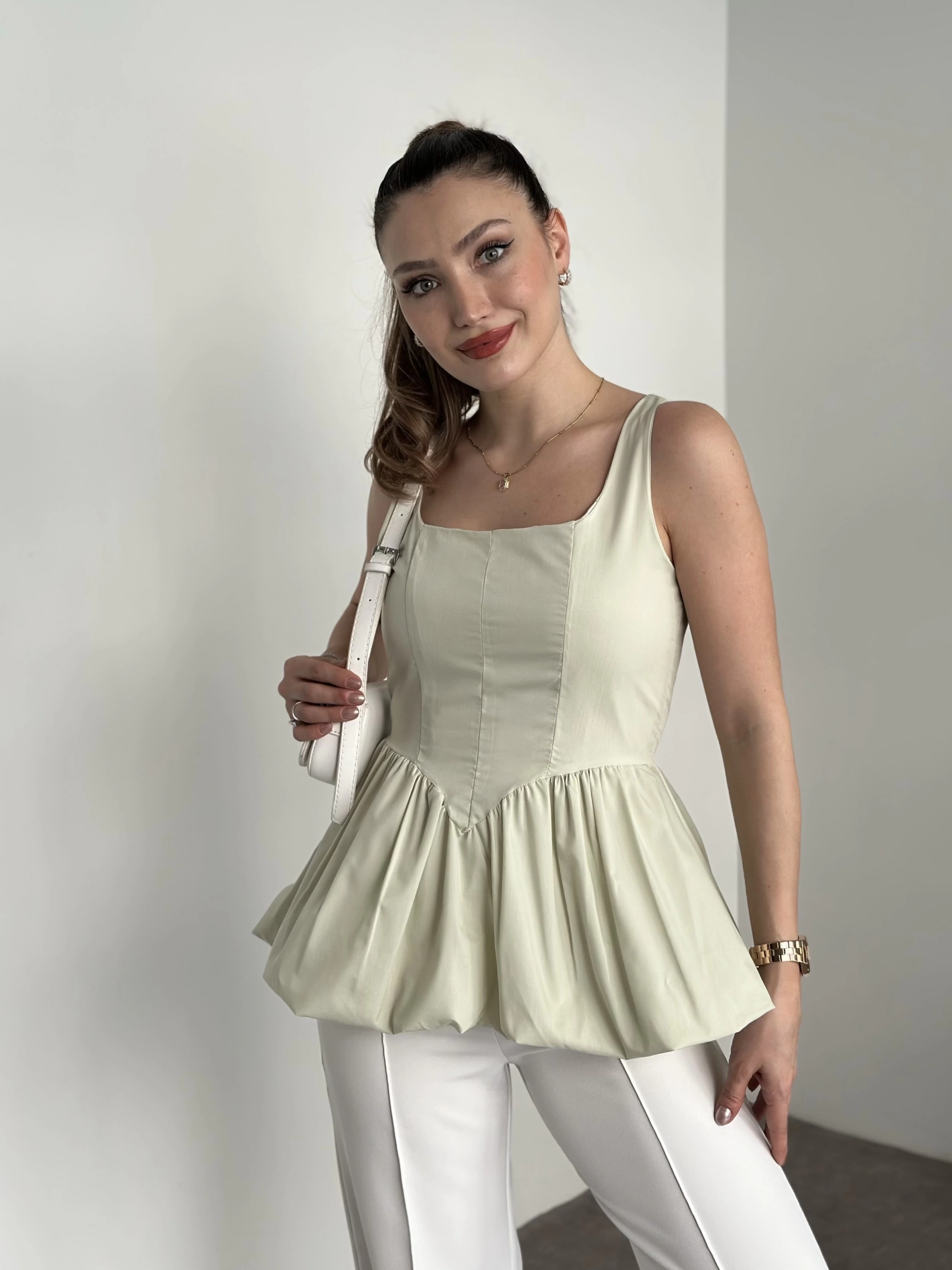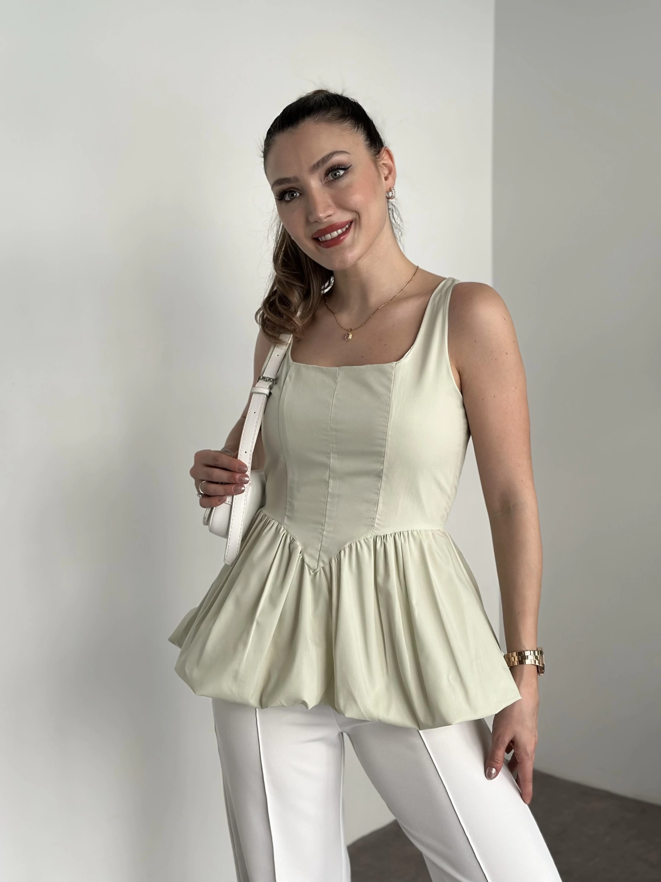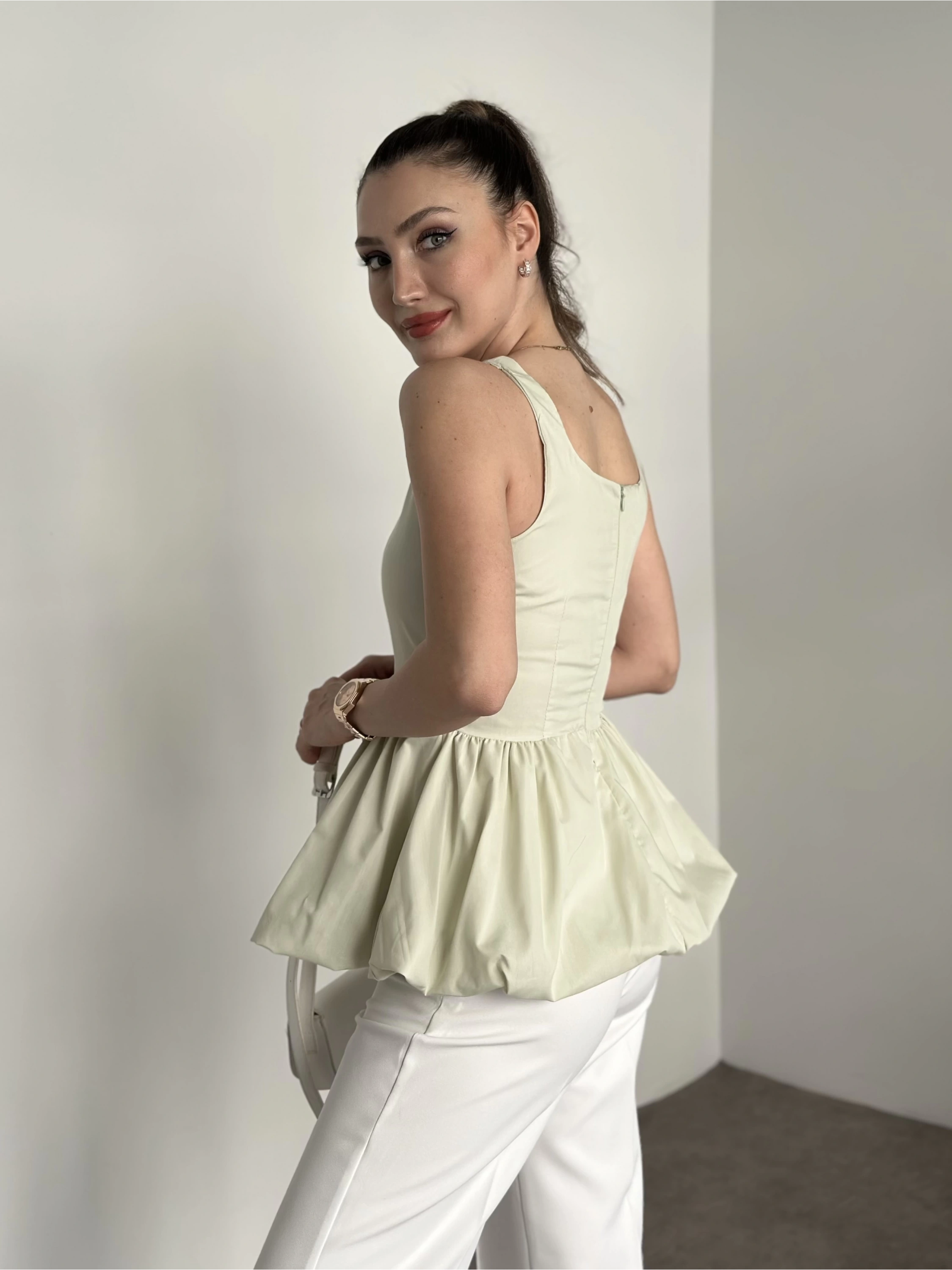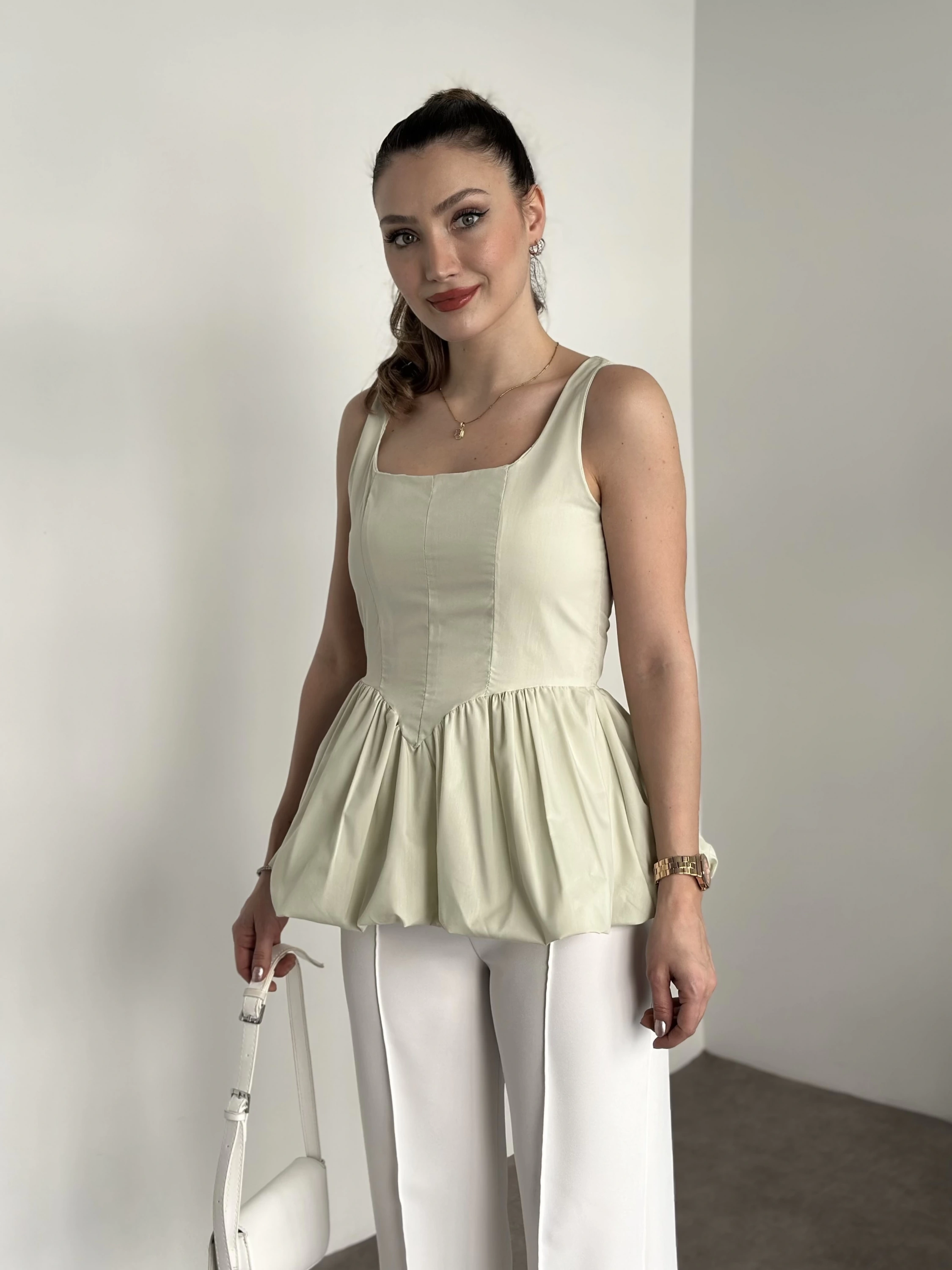 Belden oturtmalı balon etekli tasarim bluz yeşil
