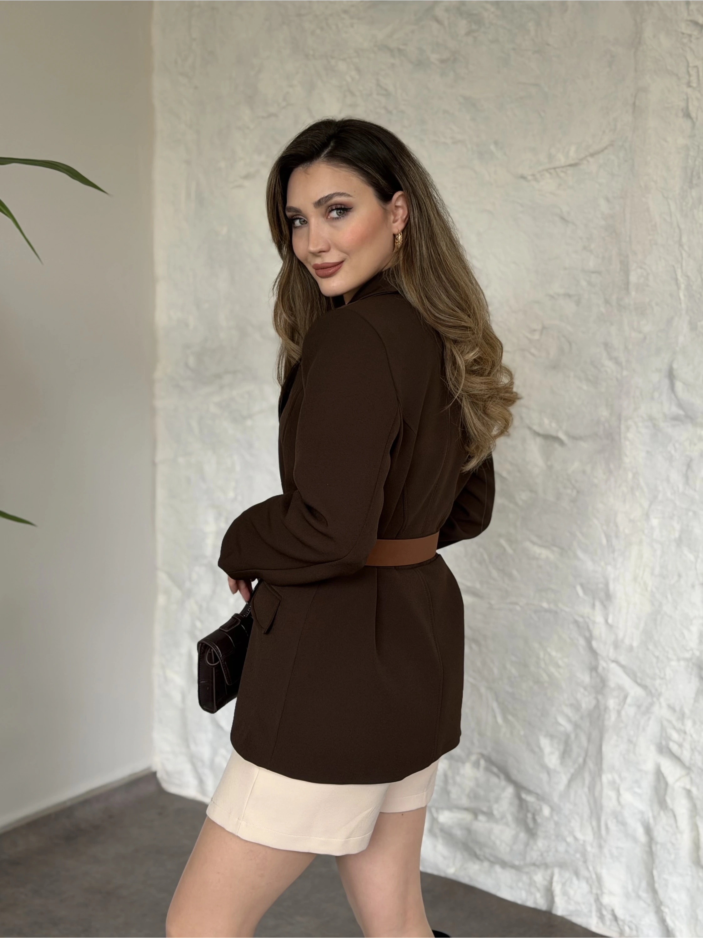 Beli kemer detaylı blazer ceket acı kahve