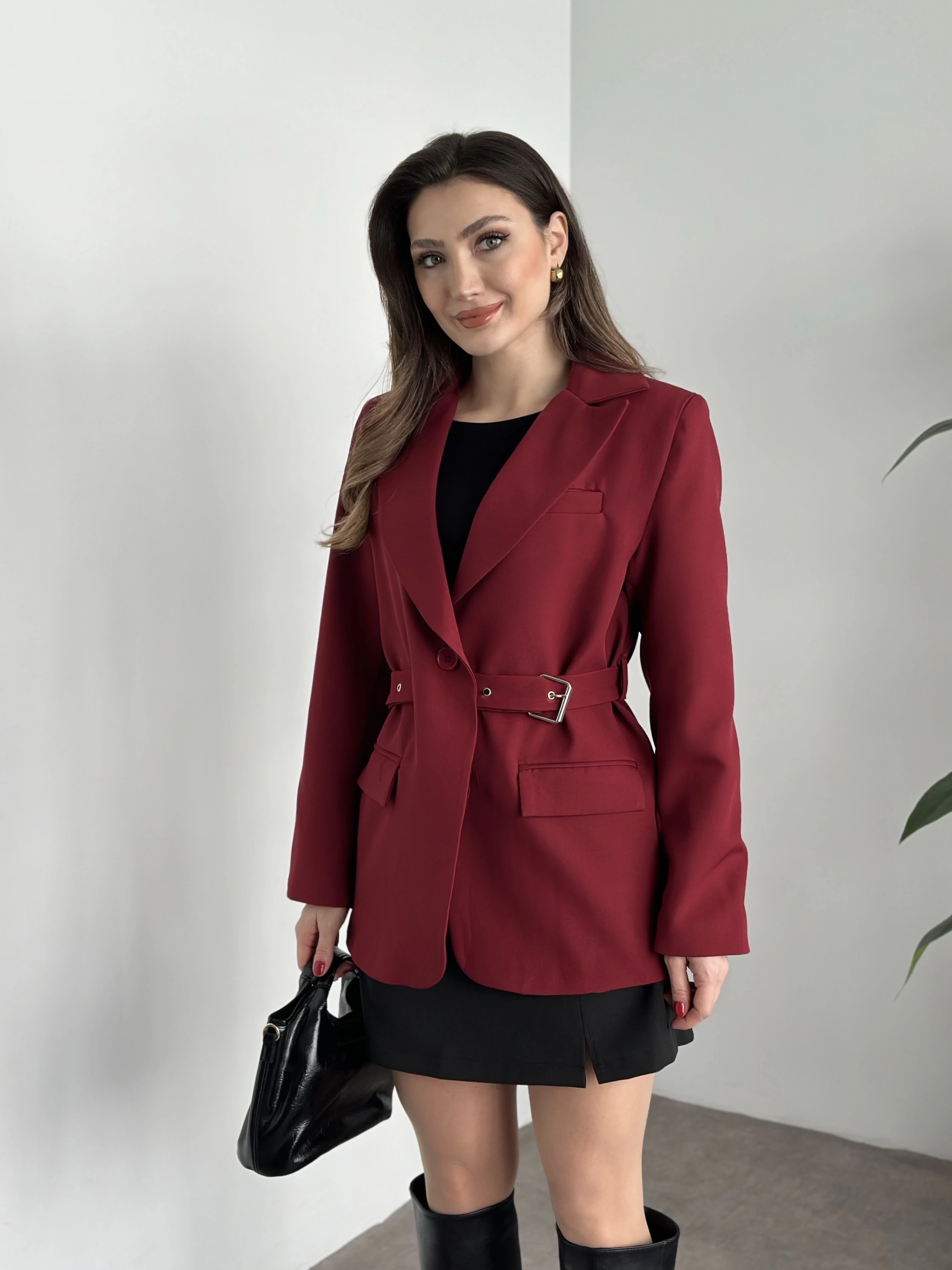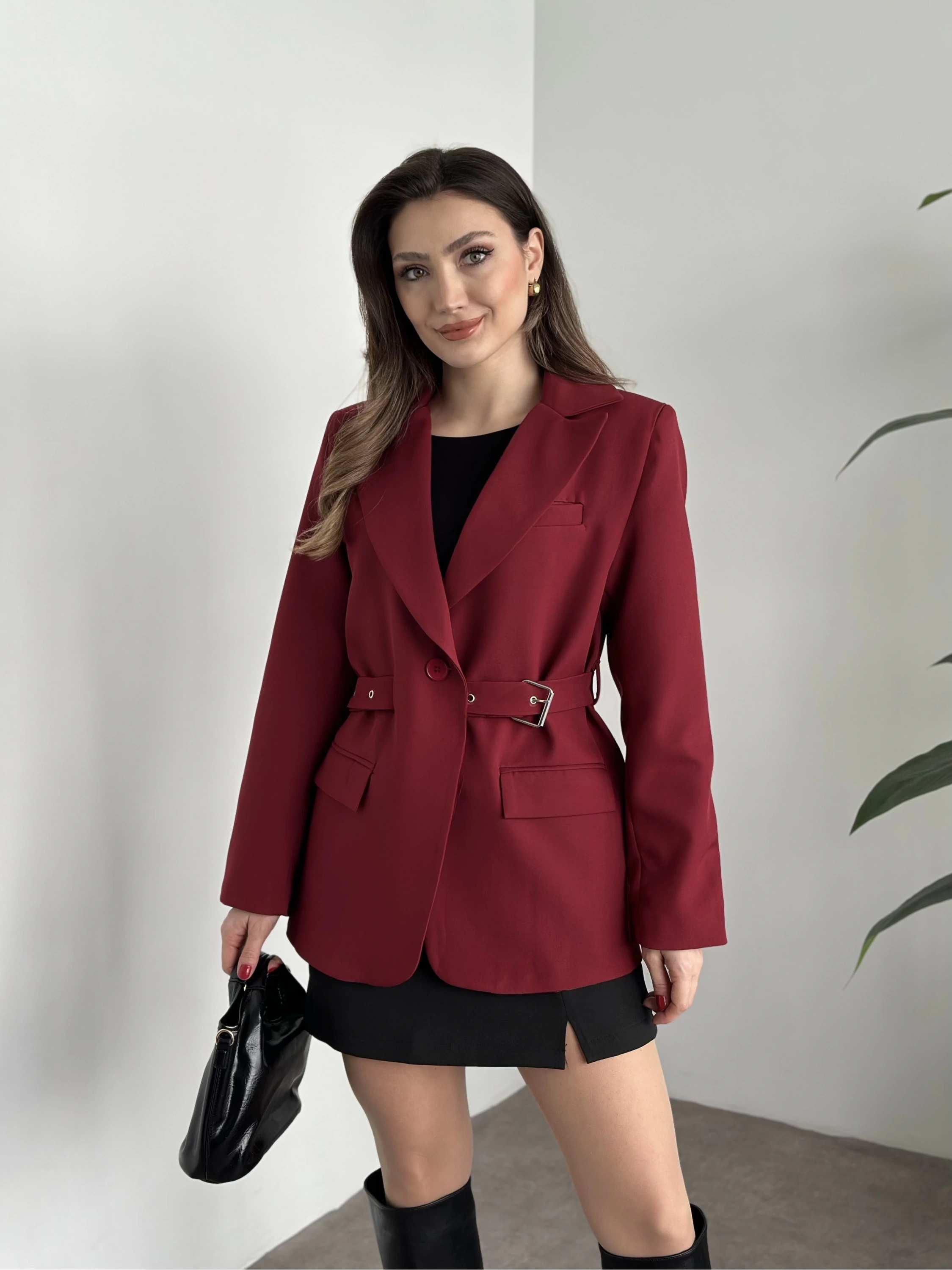 Beli kemer detaylı blazer ceket bordo