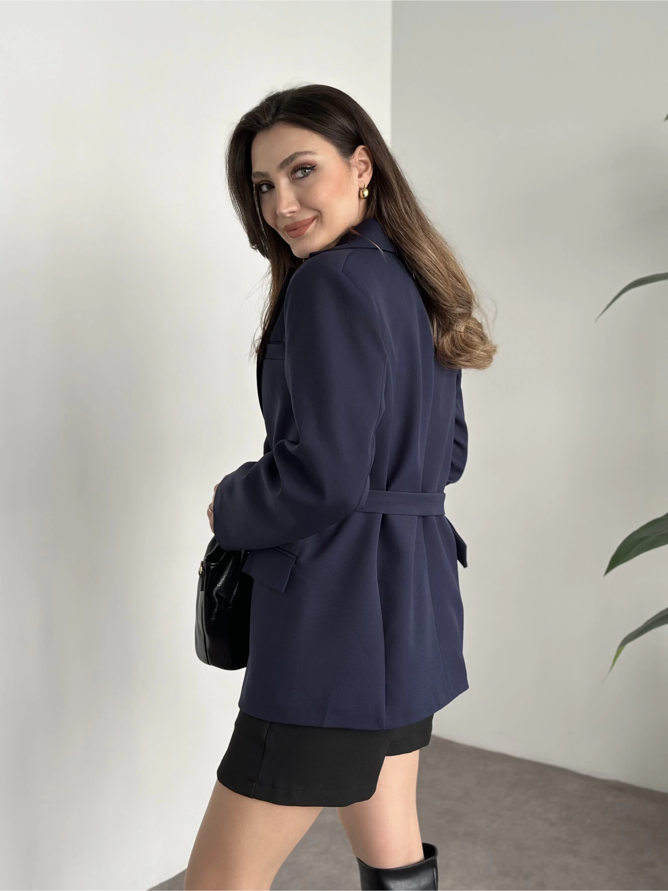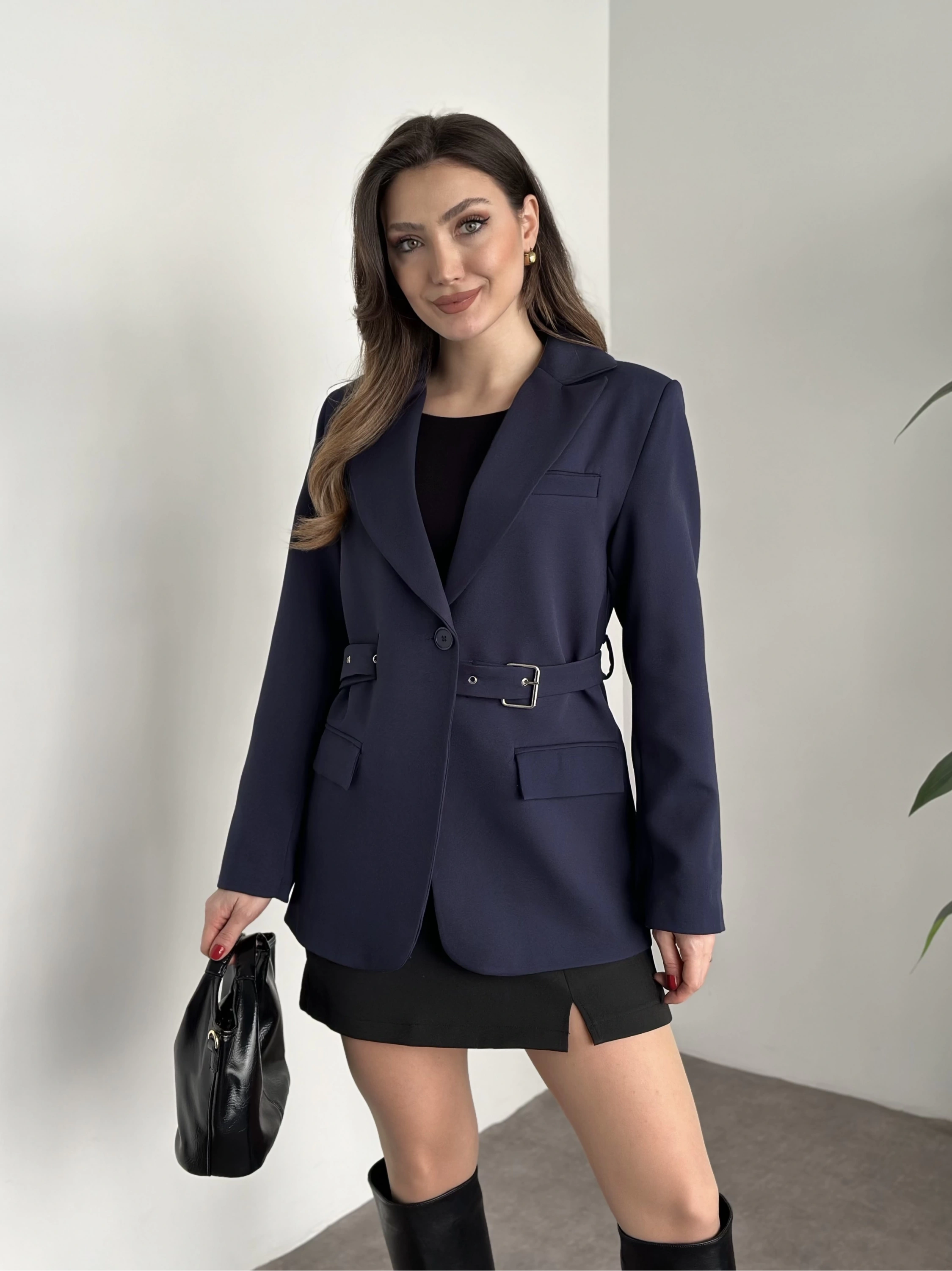 Beli kemer detaylı blazer ceket lacivert