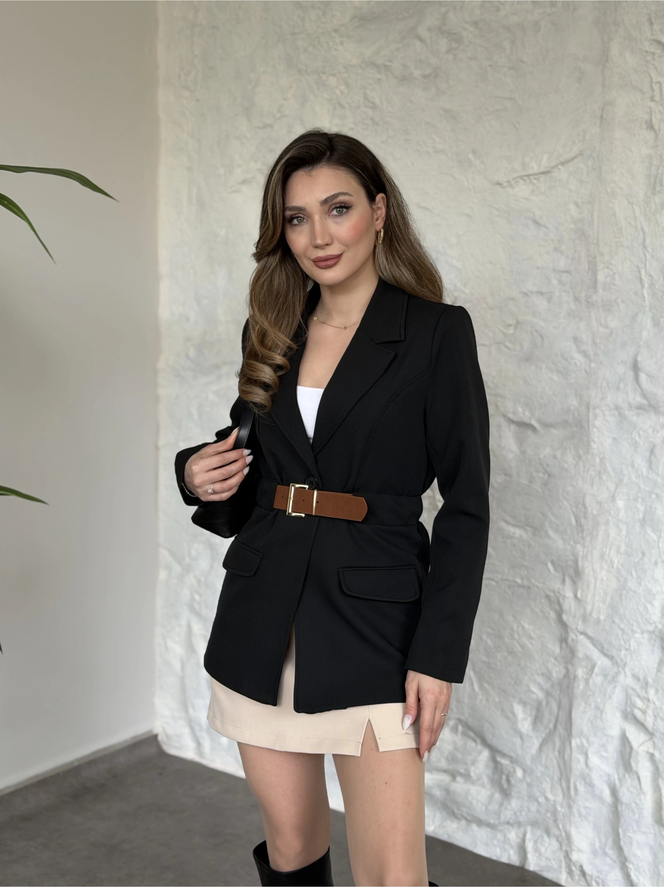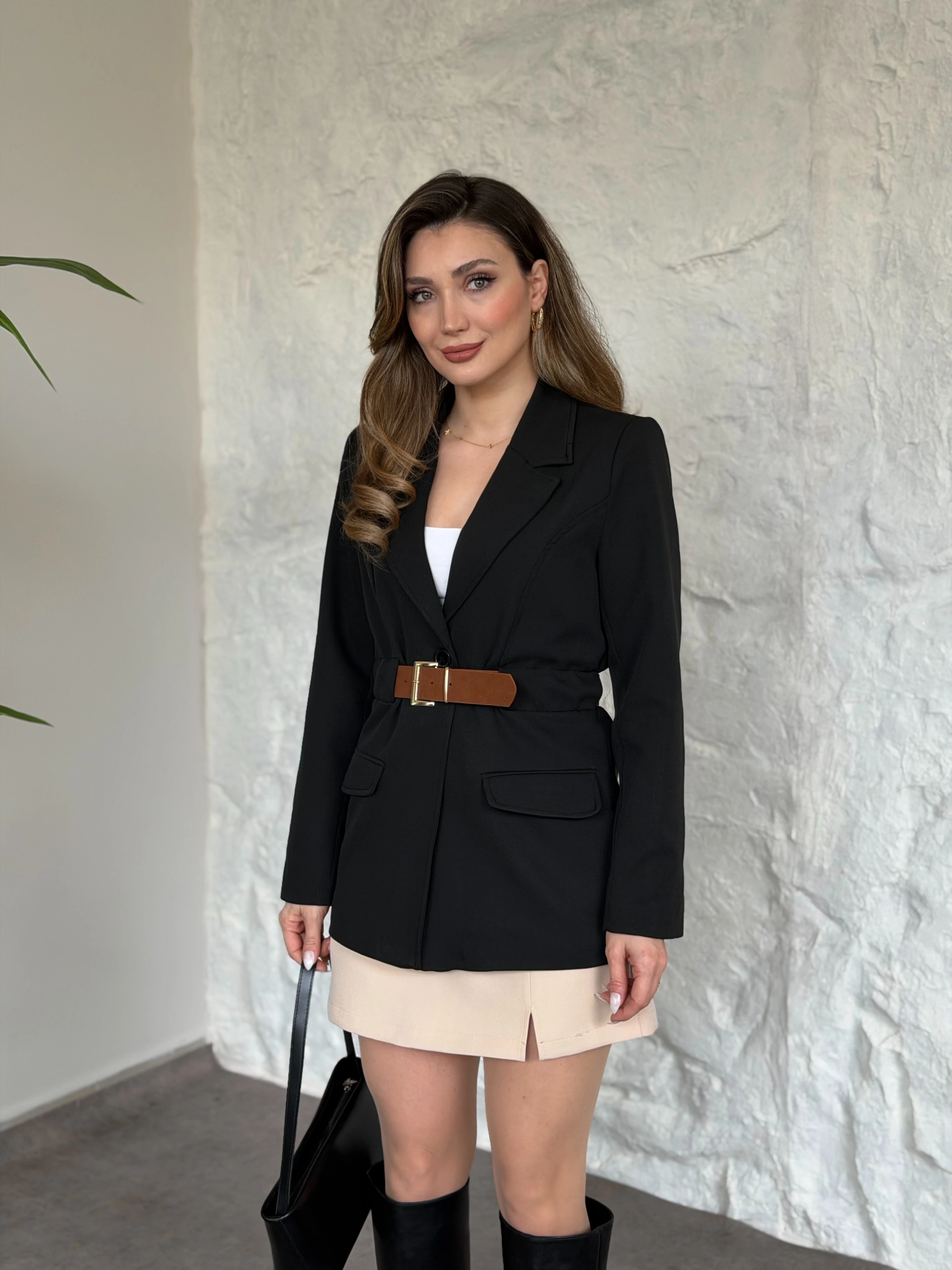 Beli kemer detaylı blazer ceket siyah
