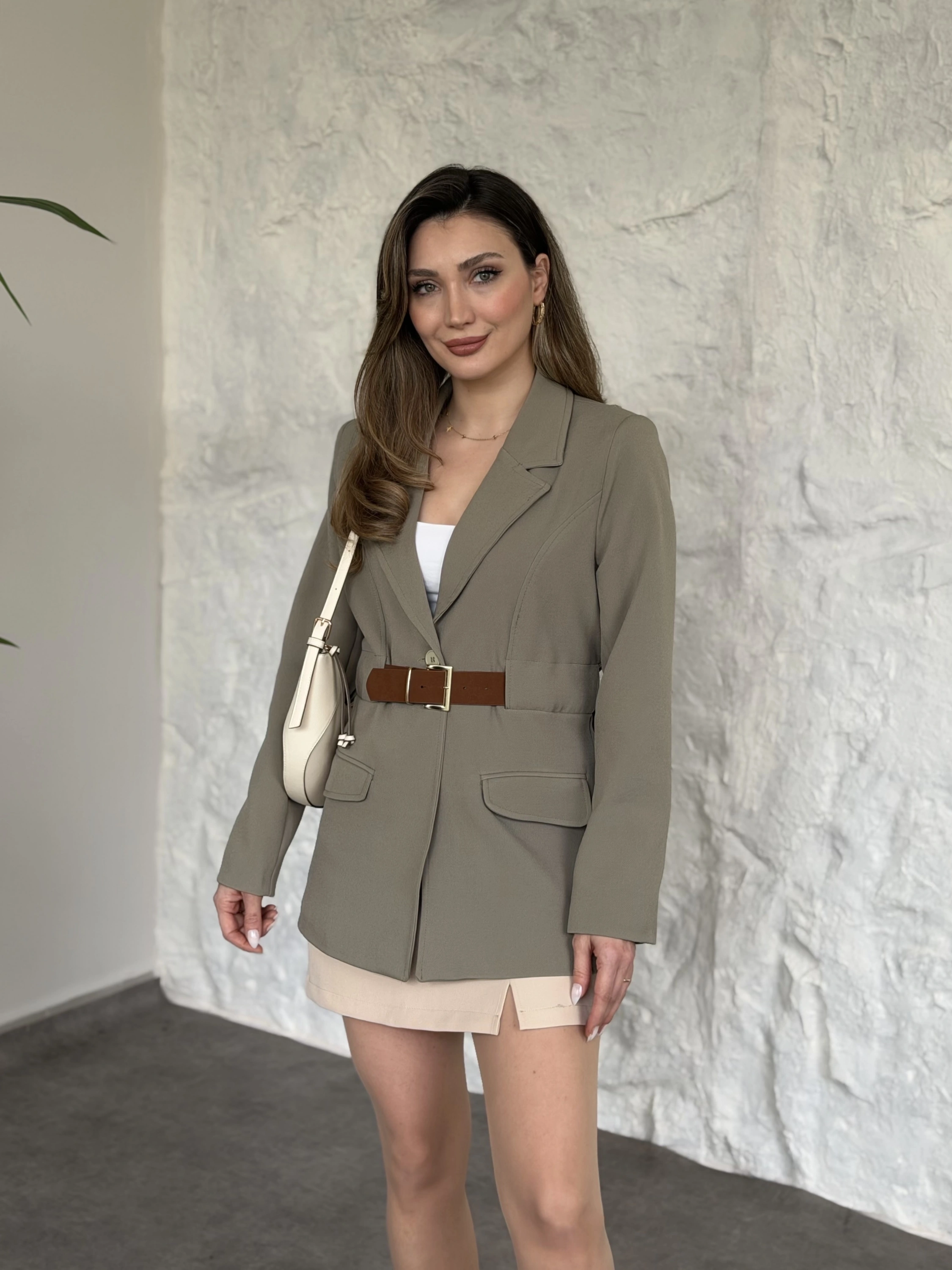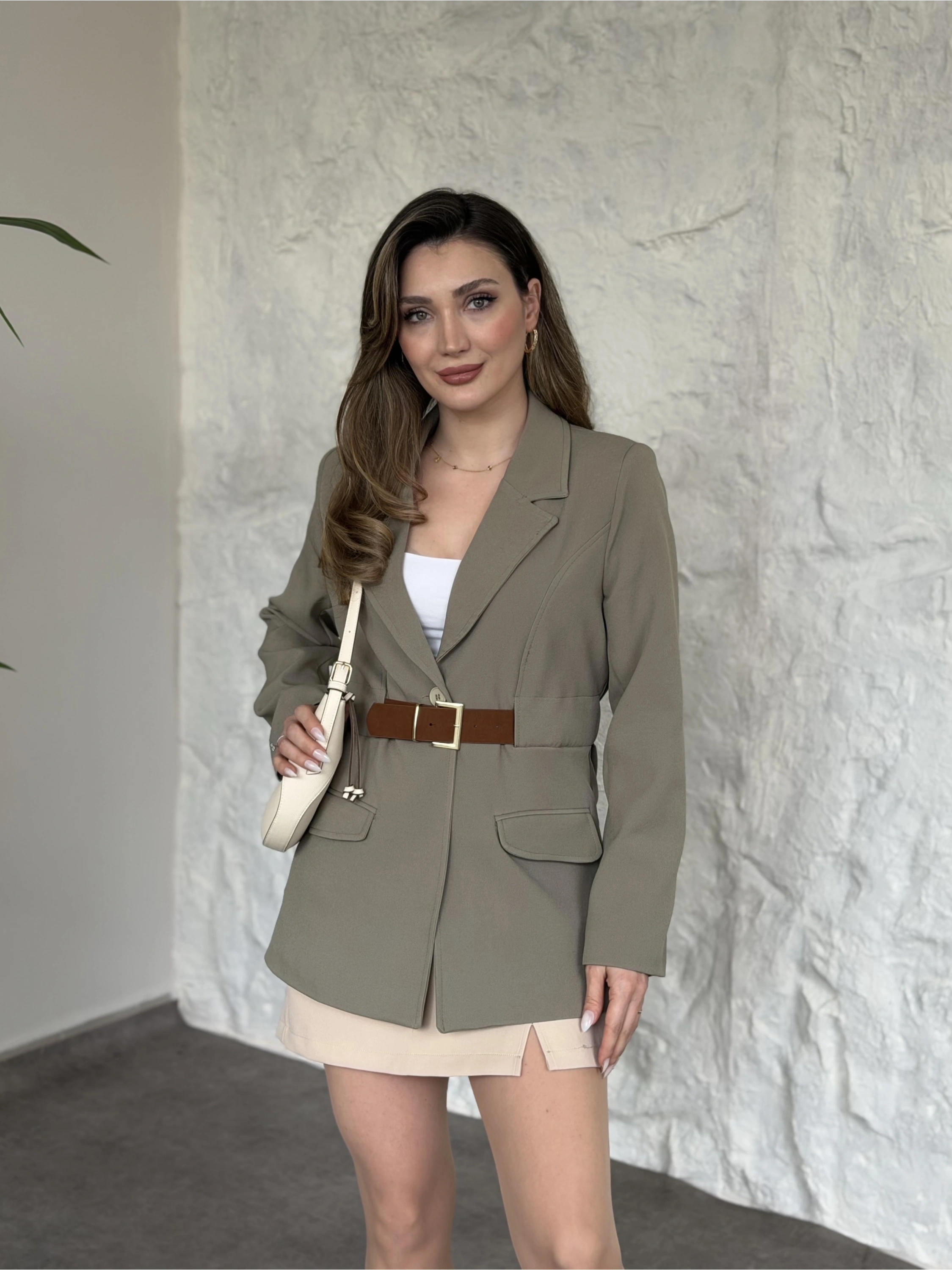Beli kemer detaylı blazer ceket acı kahve