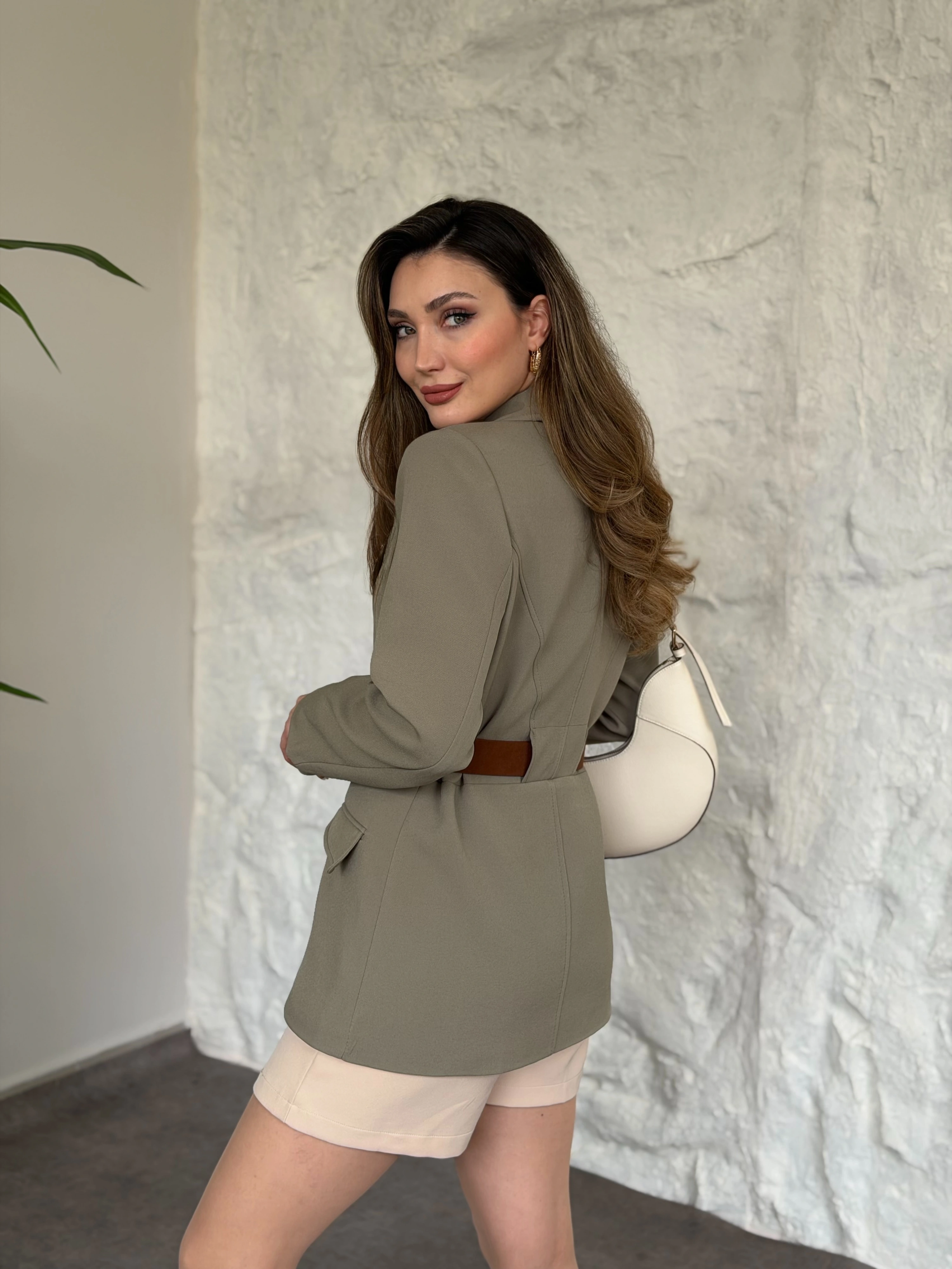 Beli kemer detaylı blazer ceket yeşil