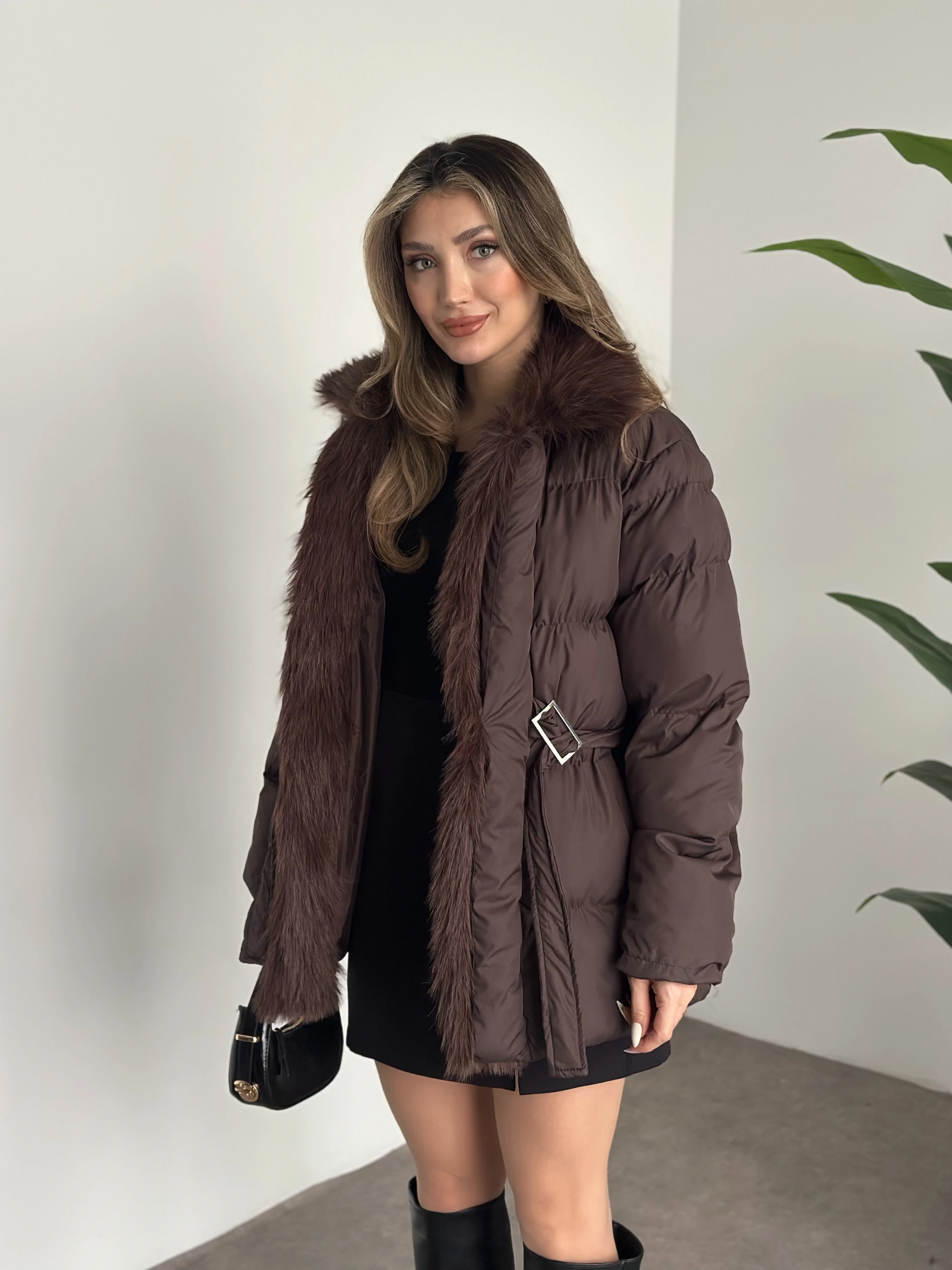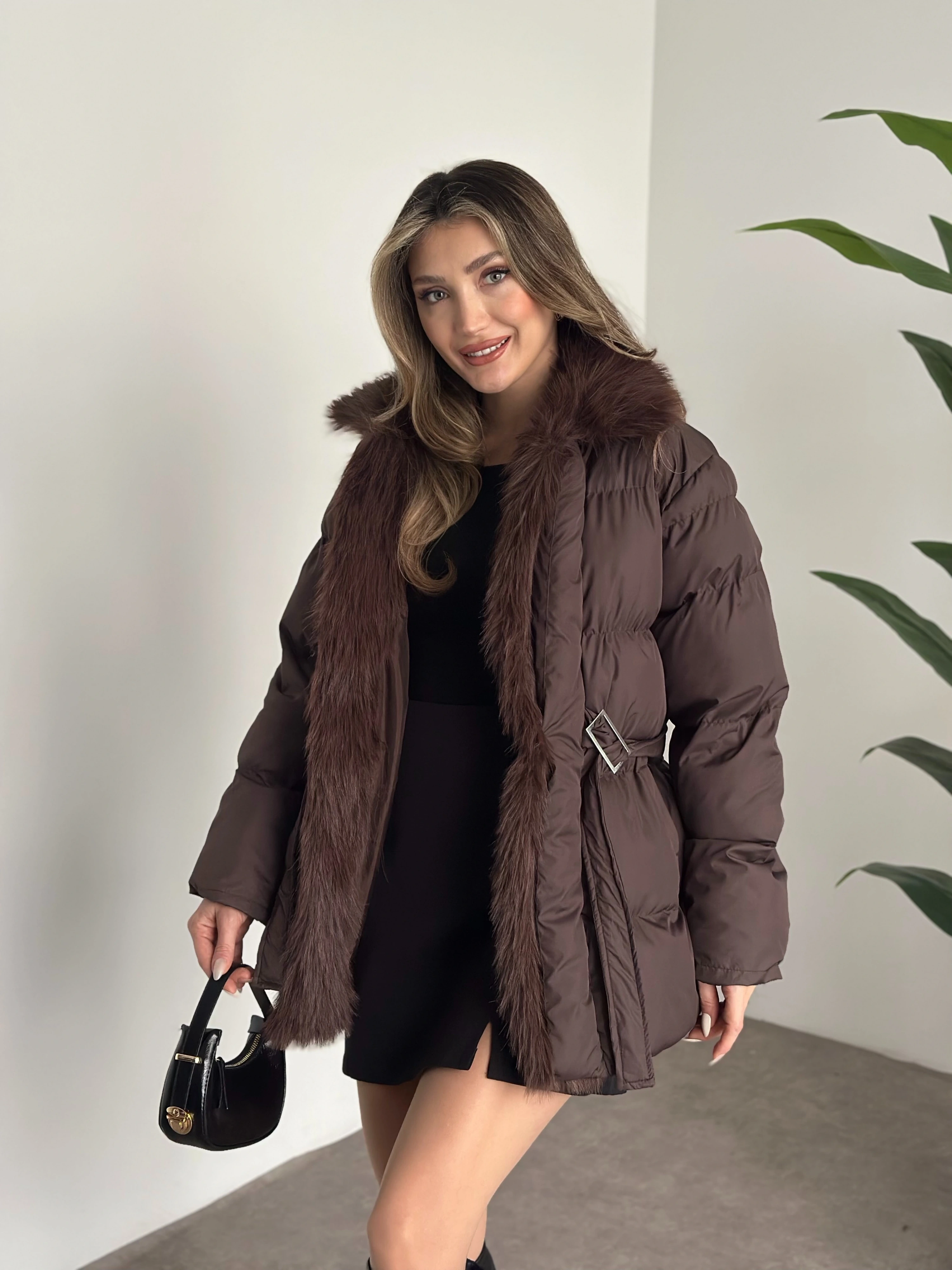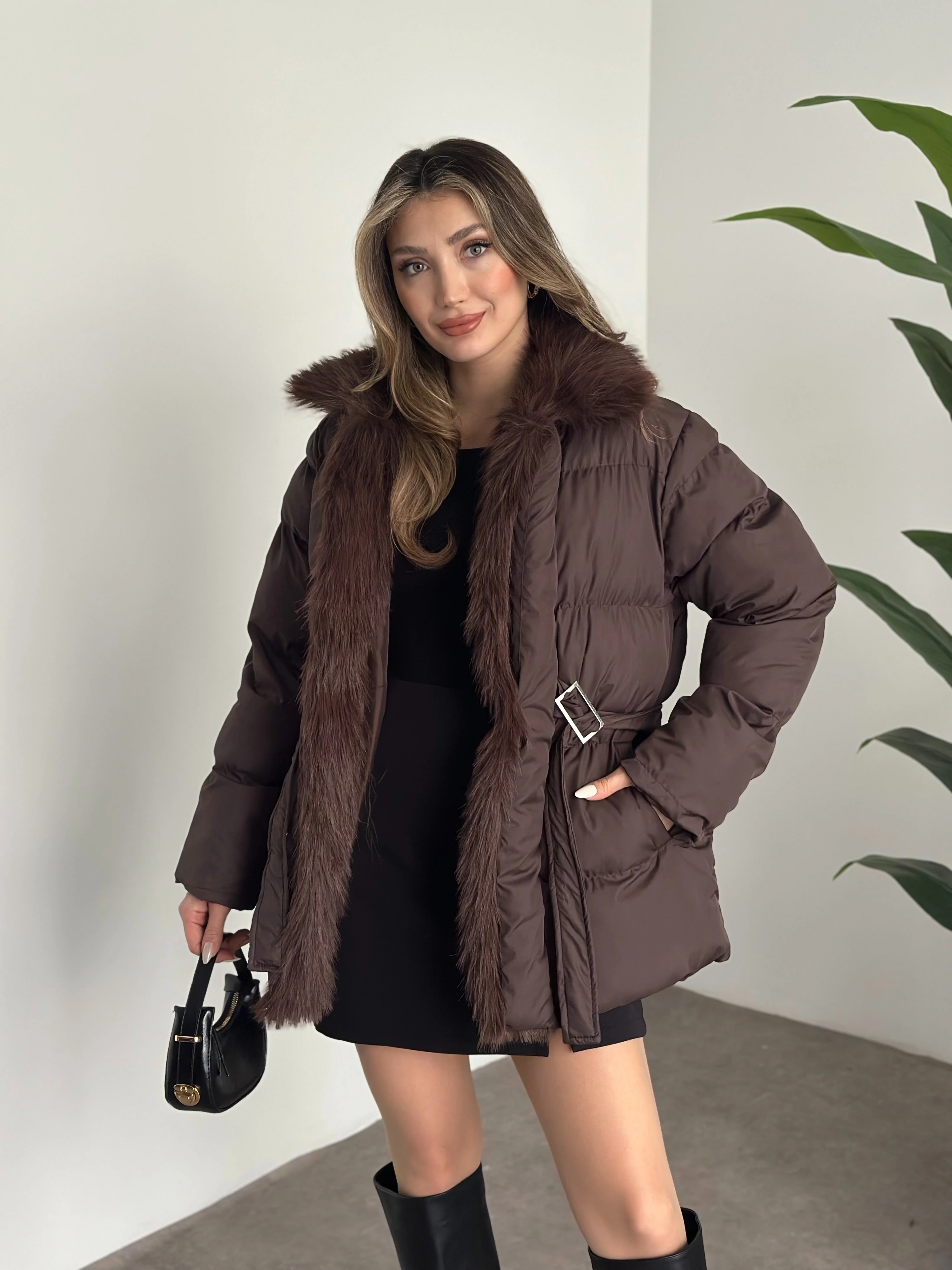 Beli kemerli önden kürk detaylı şişme mont kahve
