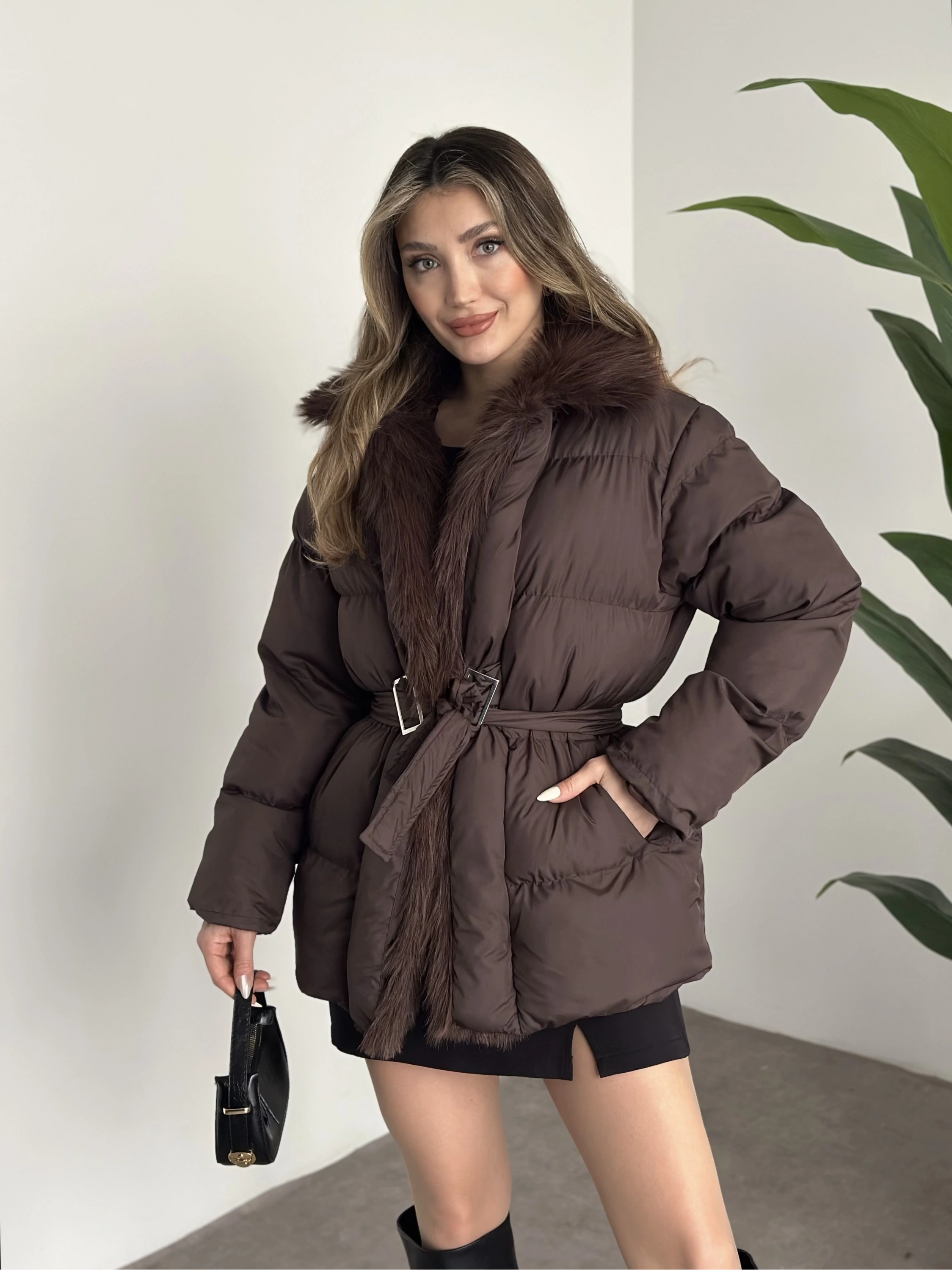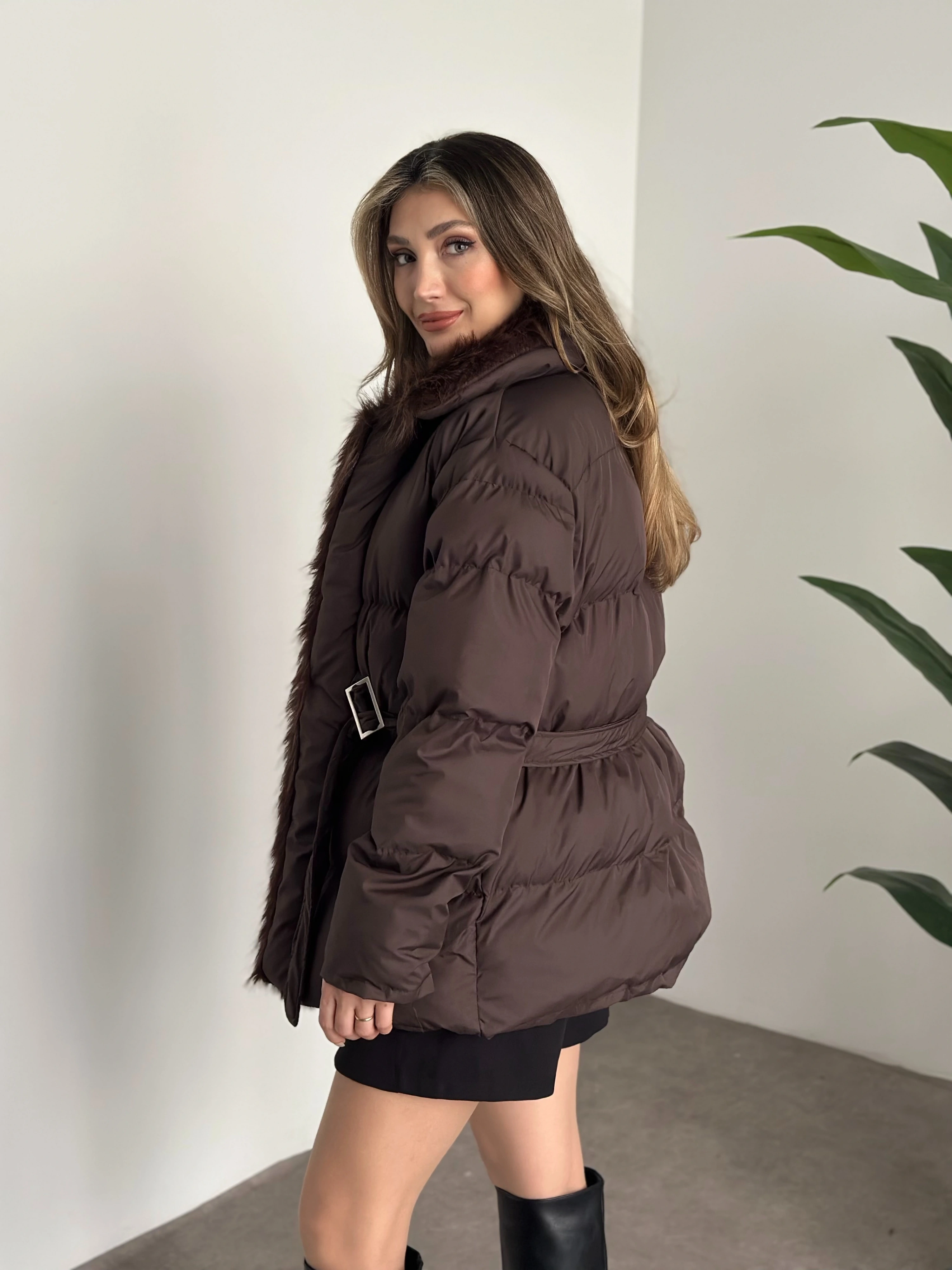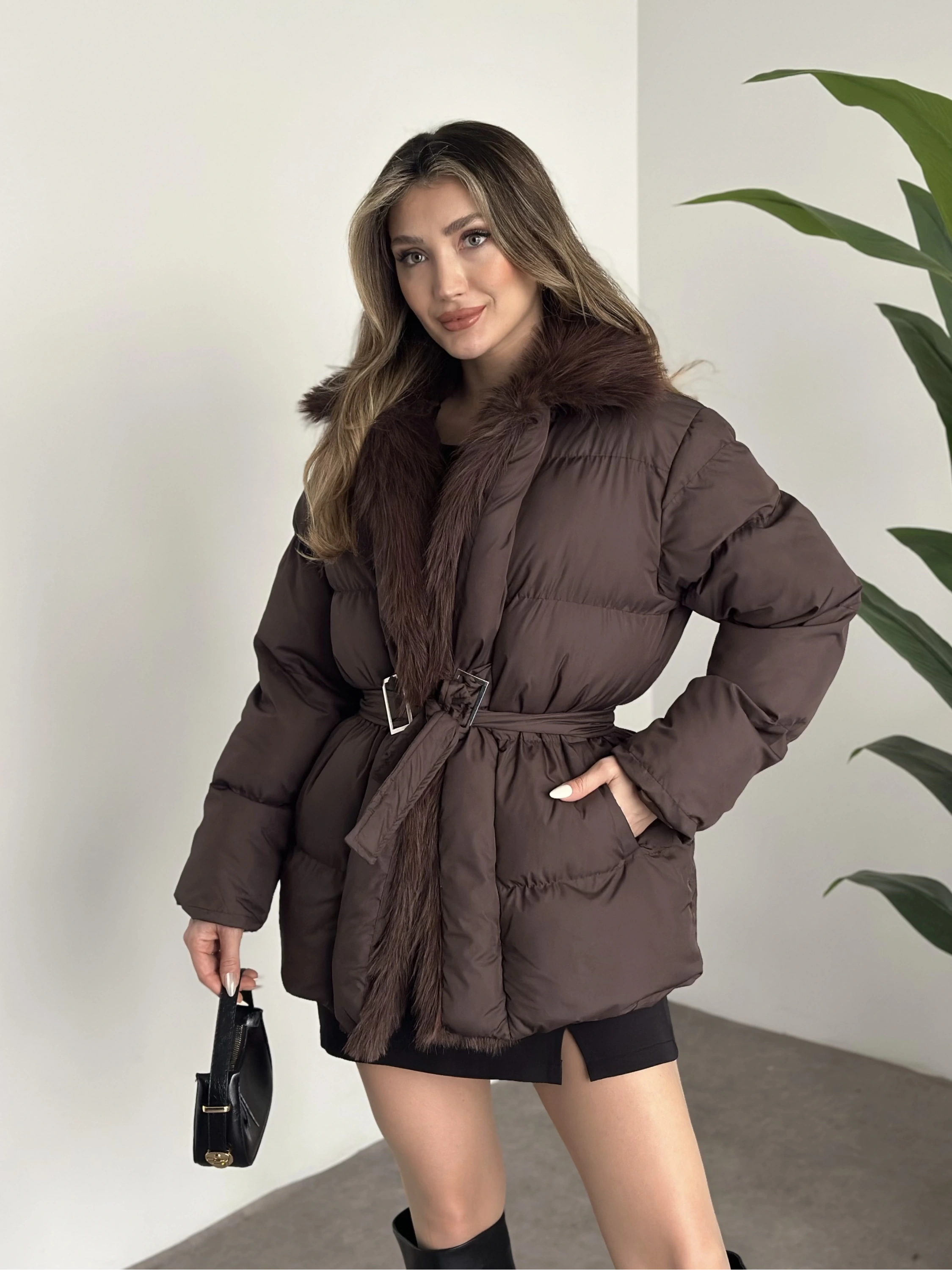 Beli kemerli önden kürk detaylı şişme mont kahve