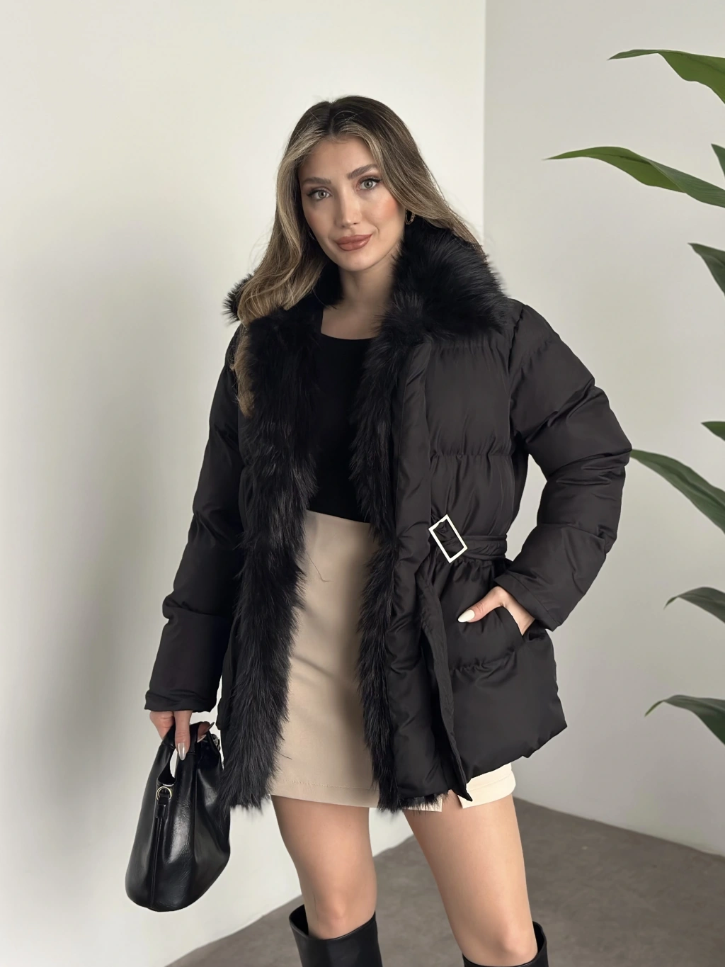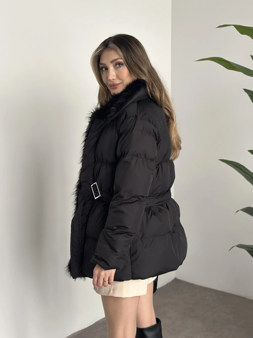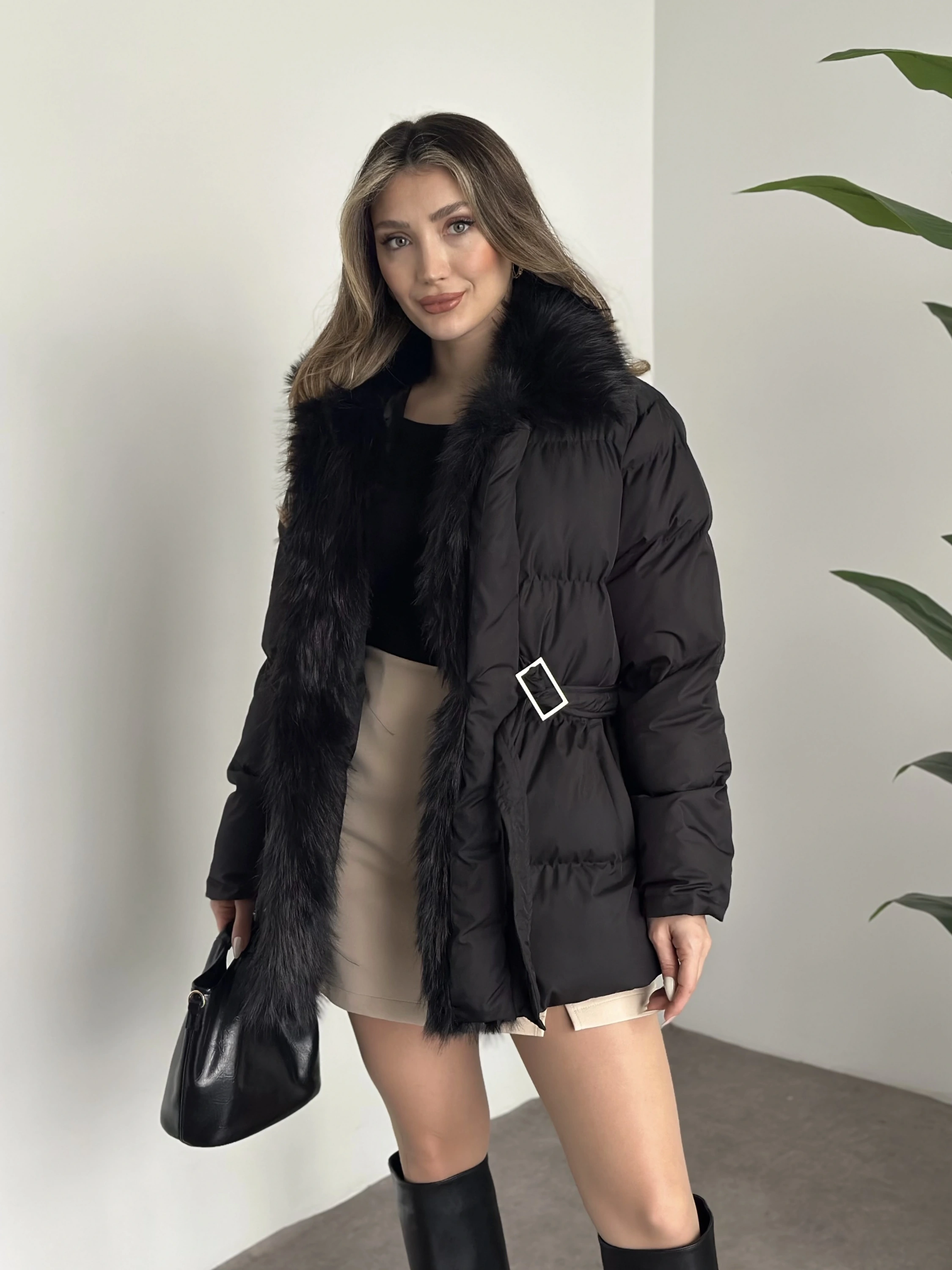 Beli kemerli önden kürk detaylı şişme mont siyah