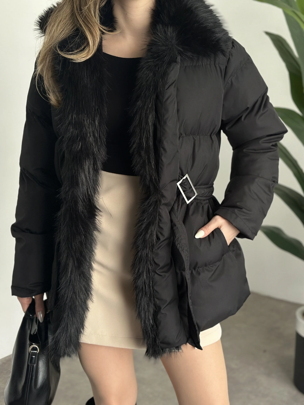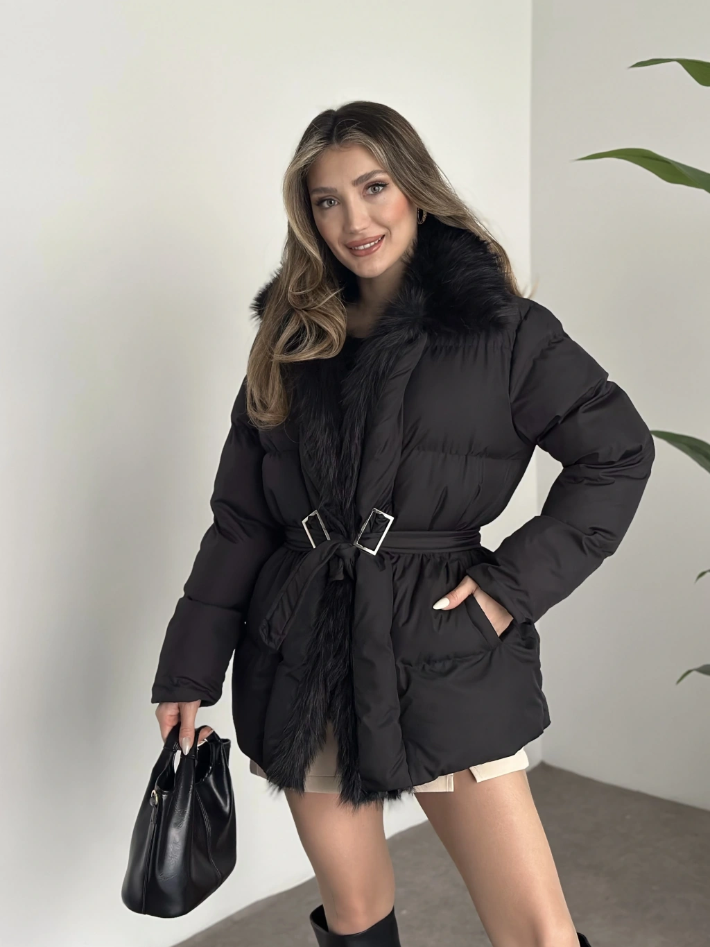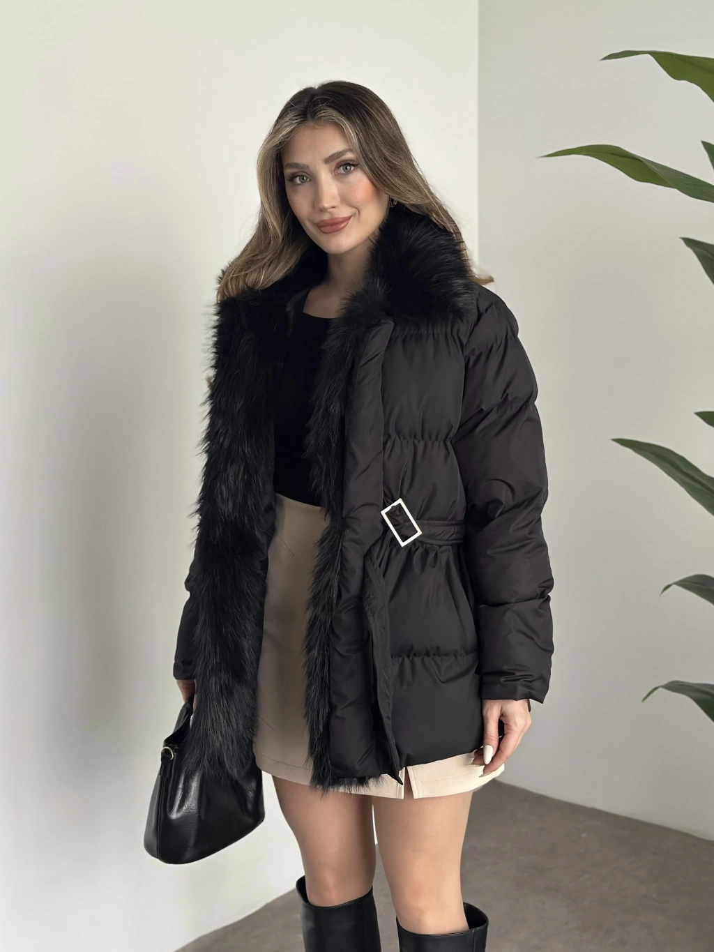 Beli kemerli önden kürk detaylı şişme mont siyah