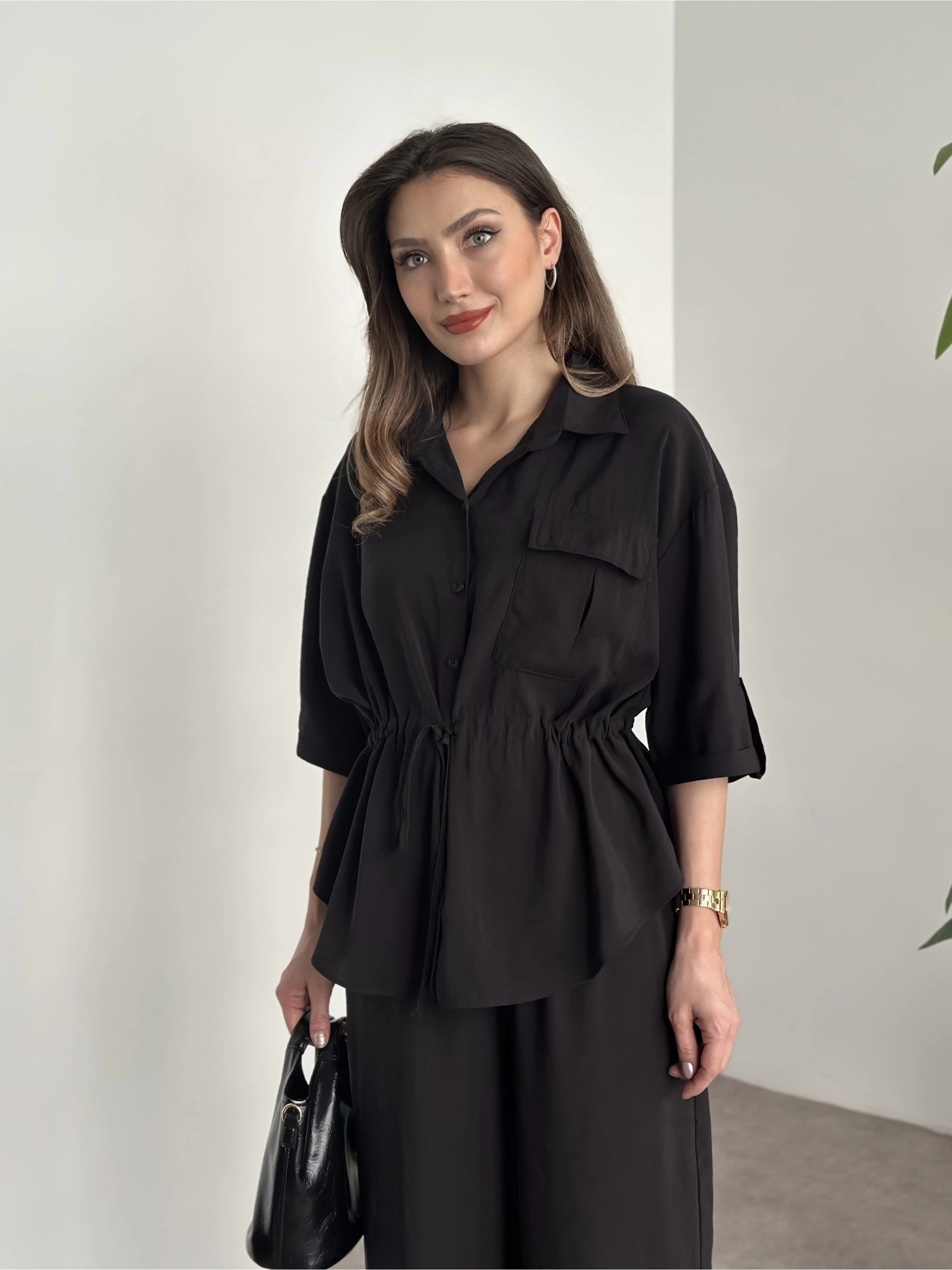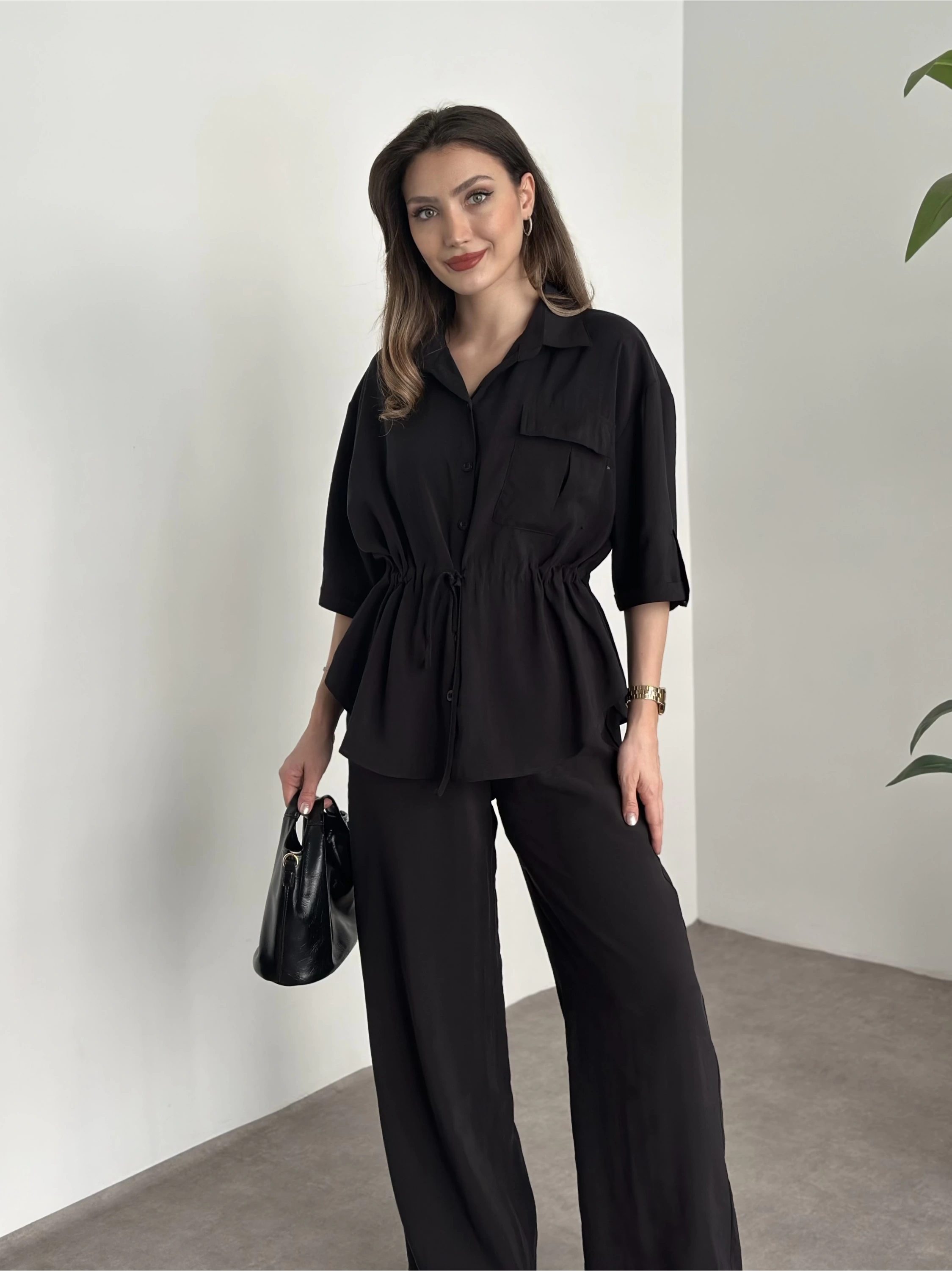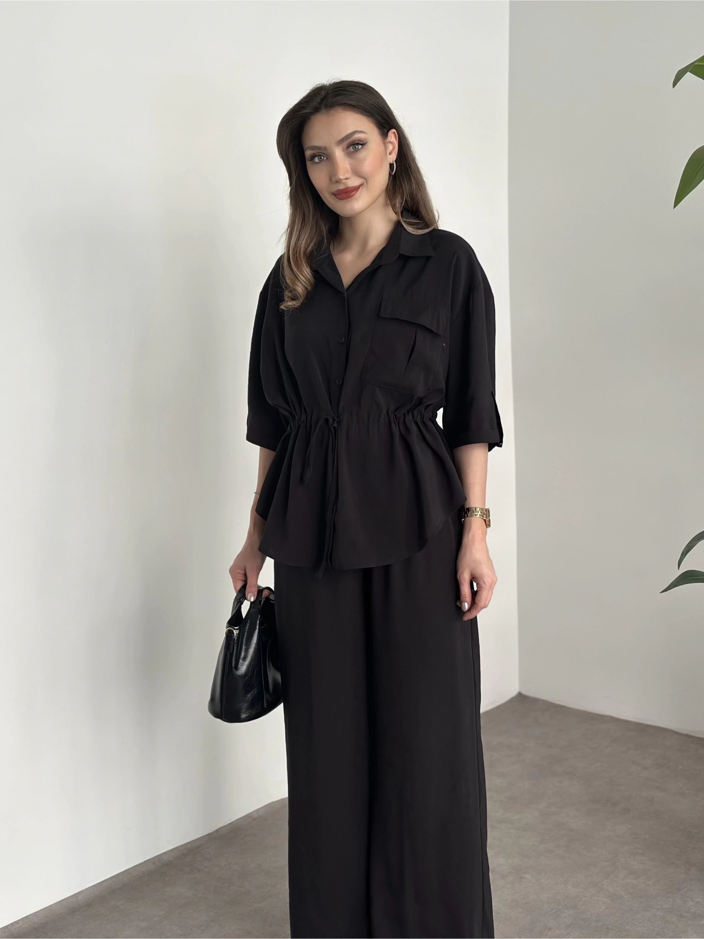 Sıfır kol belden bağlamalı kumaş takım siyah