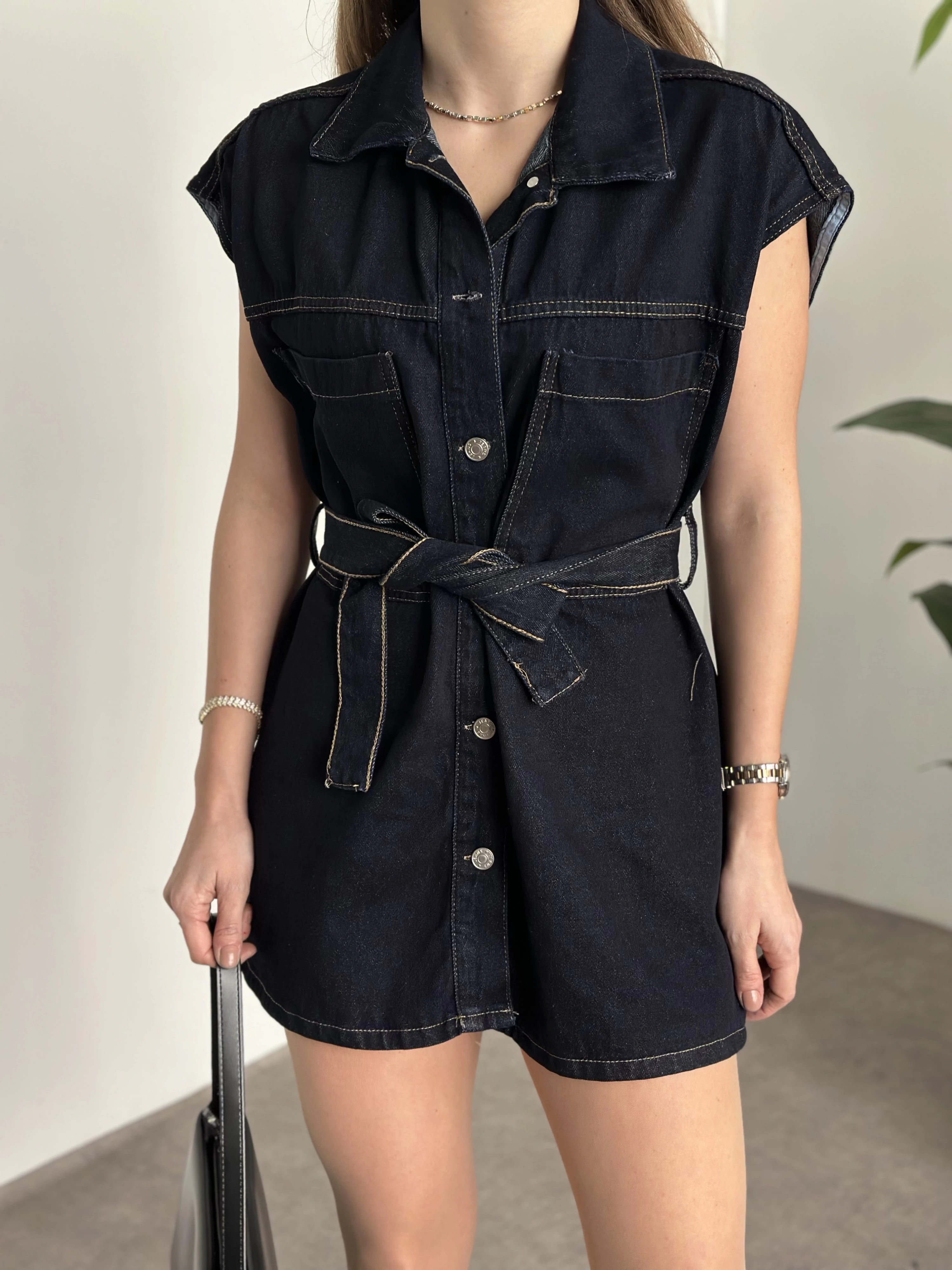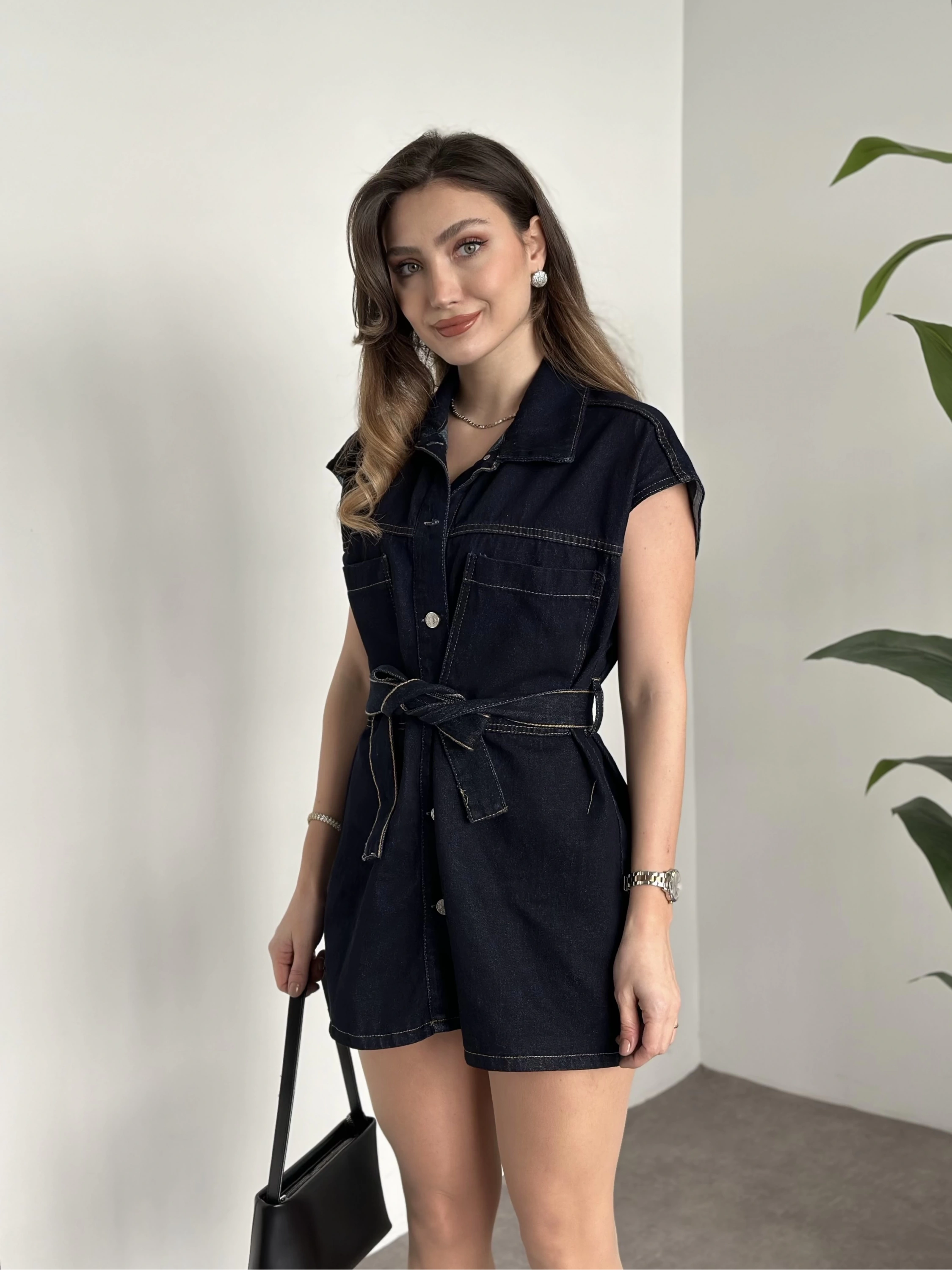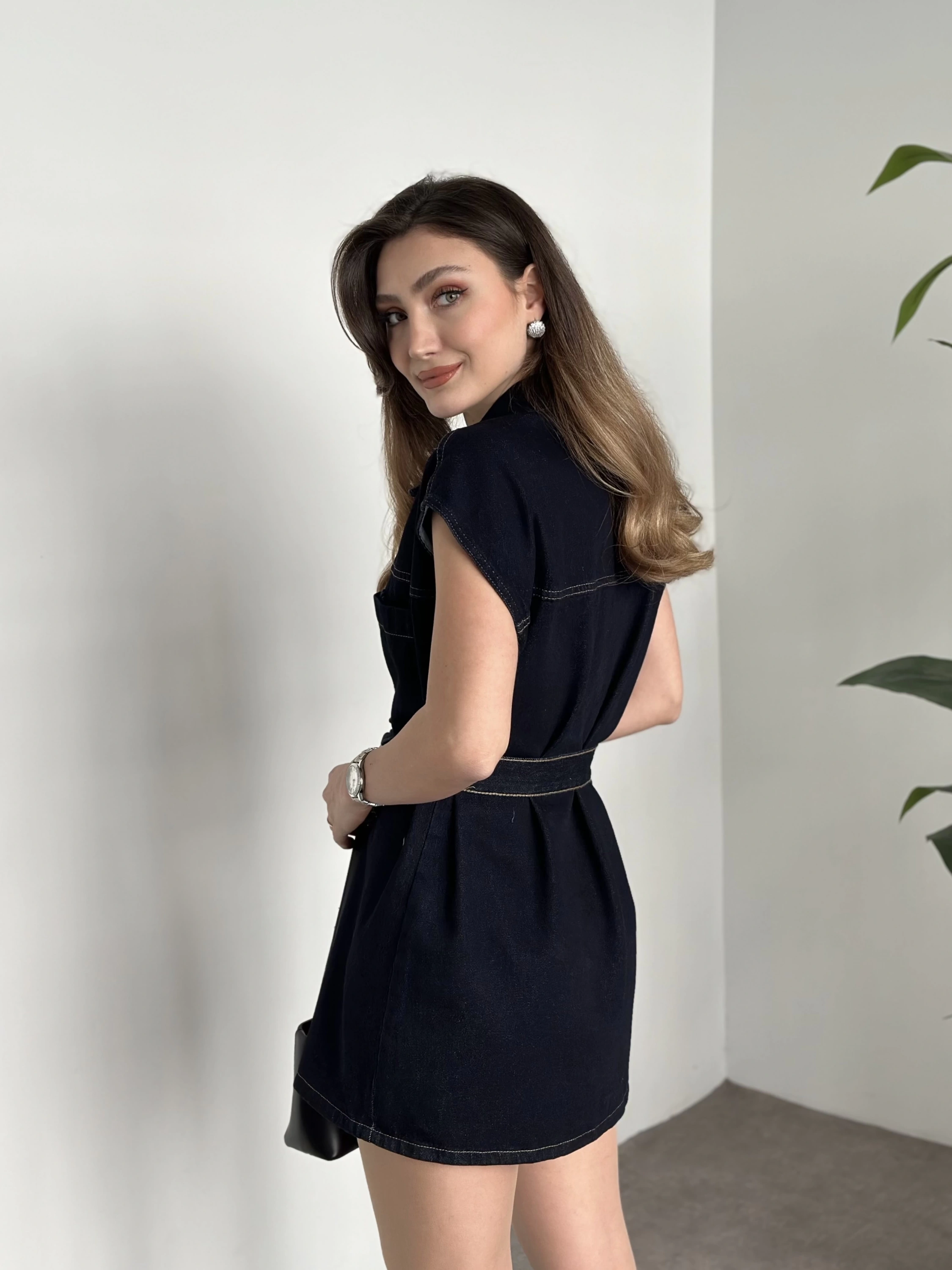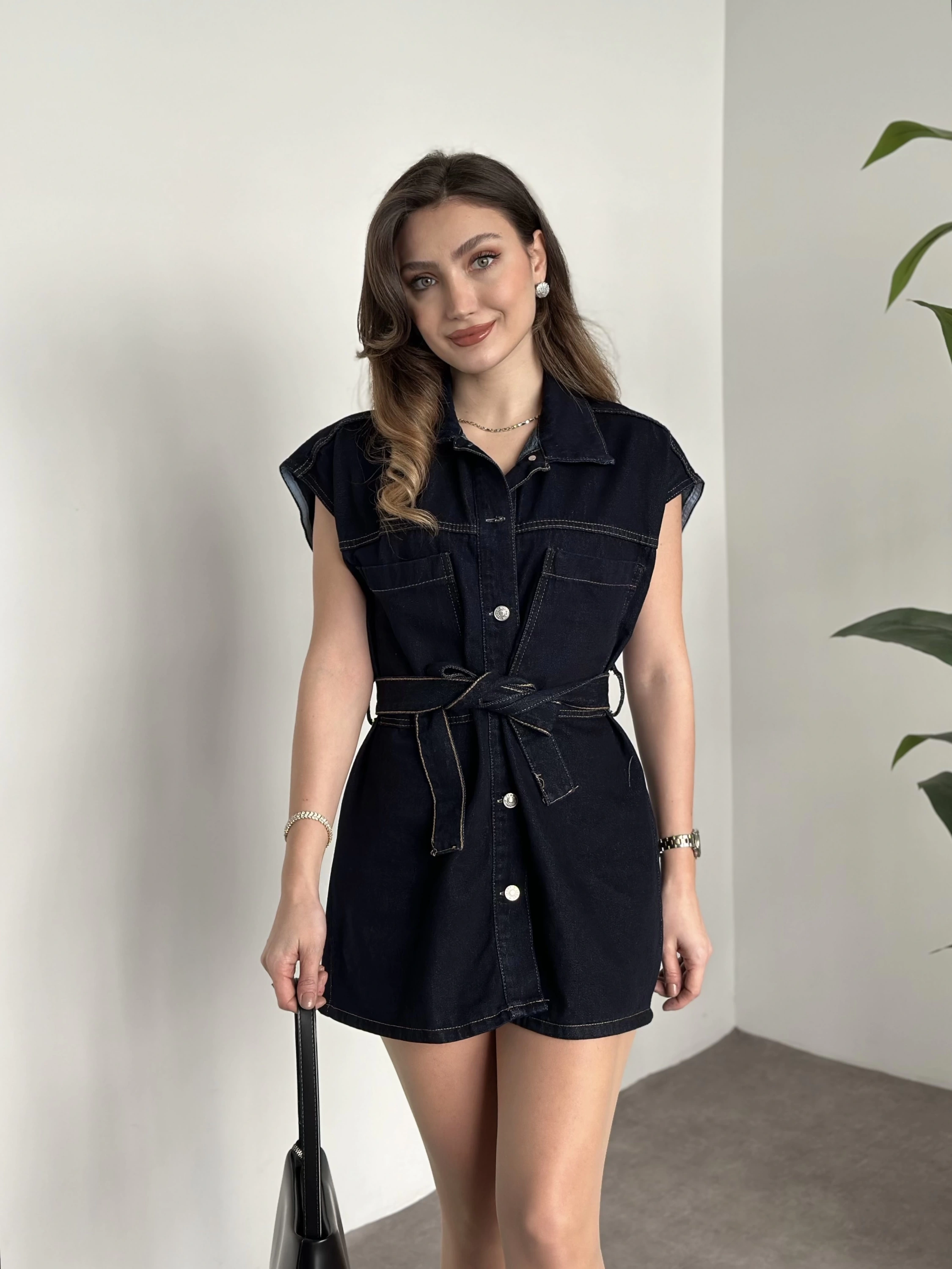 Belinden kuşaklı mini denim elbise