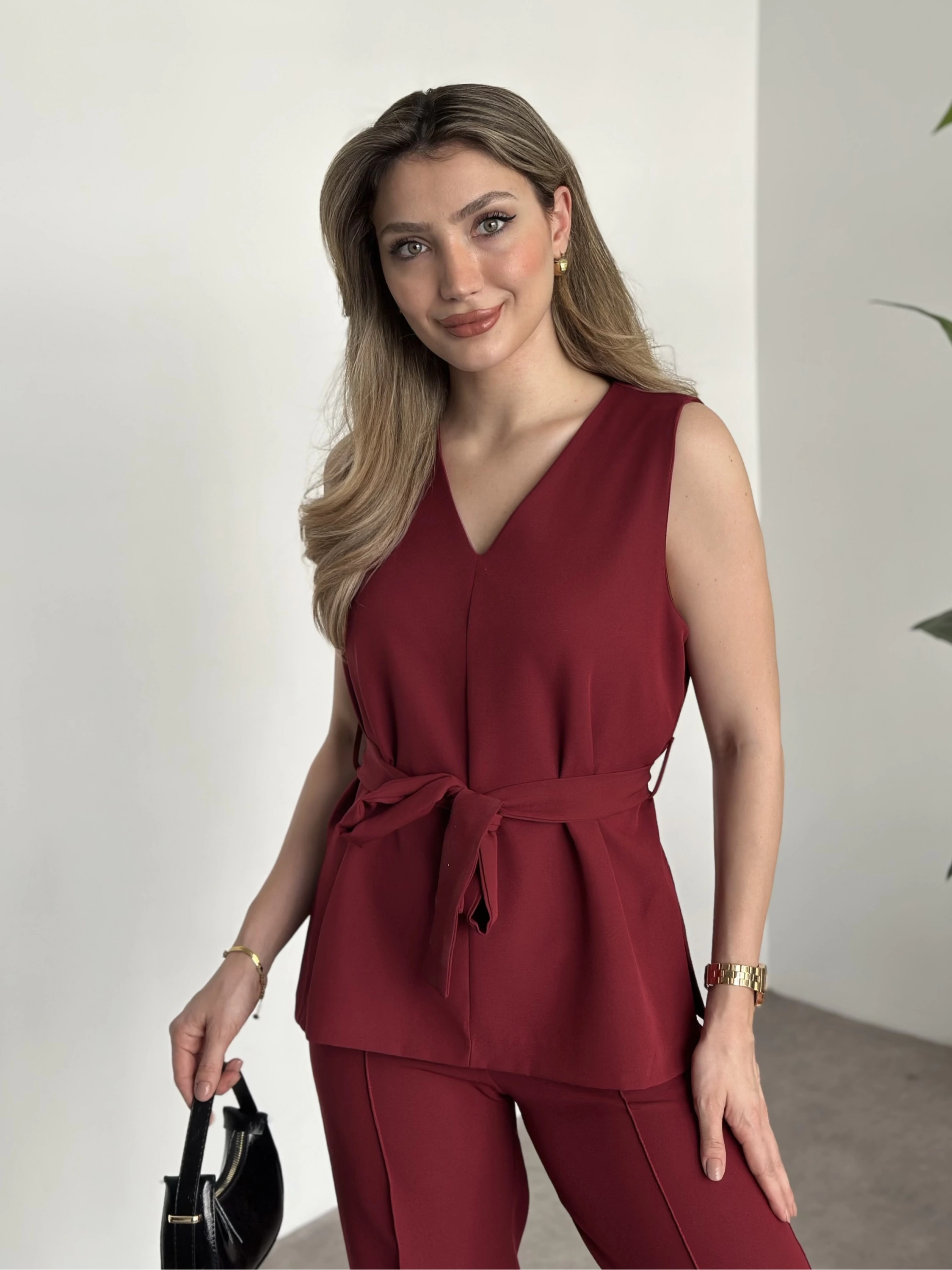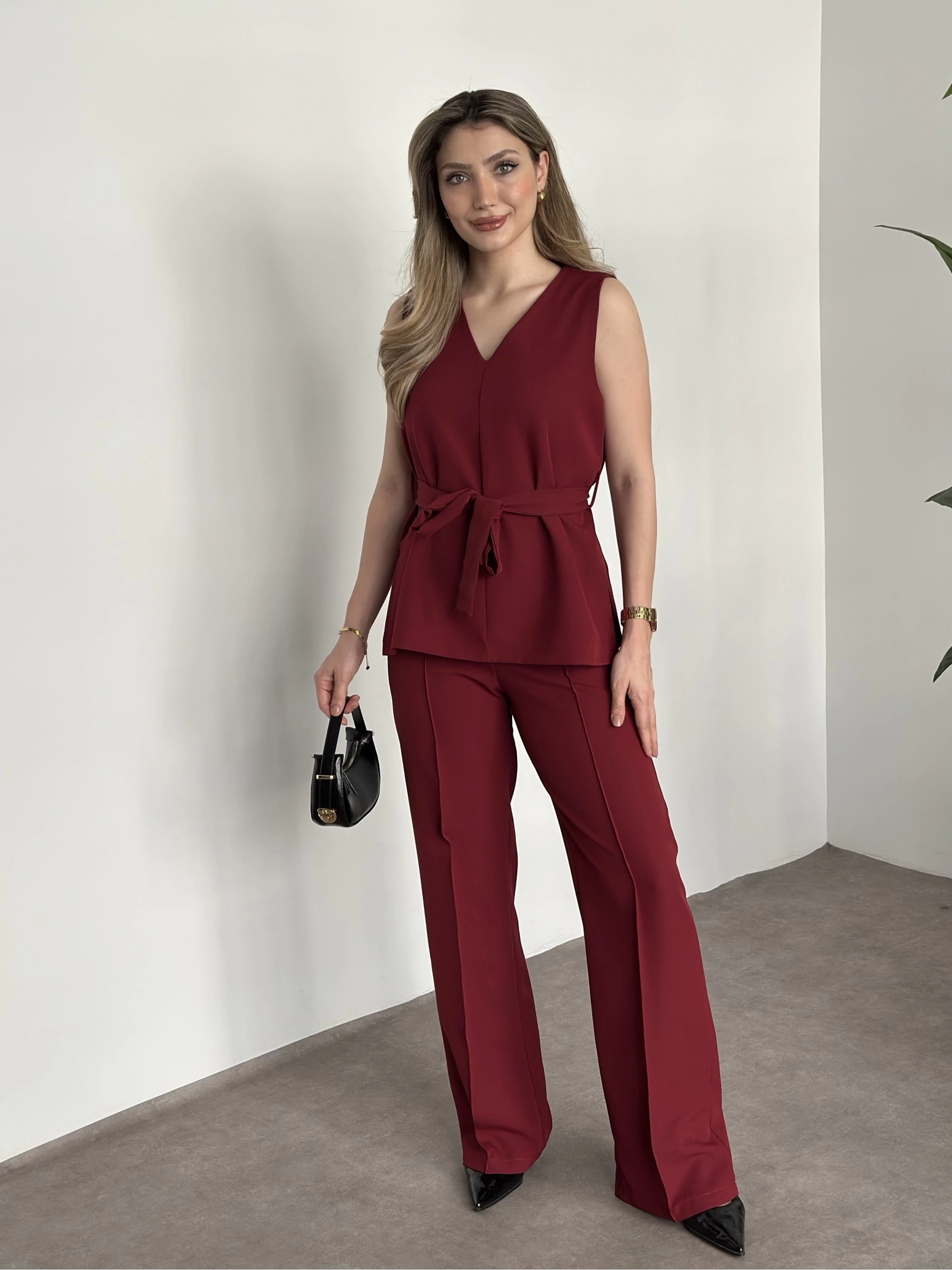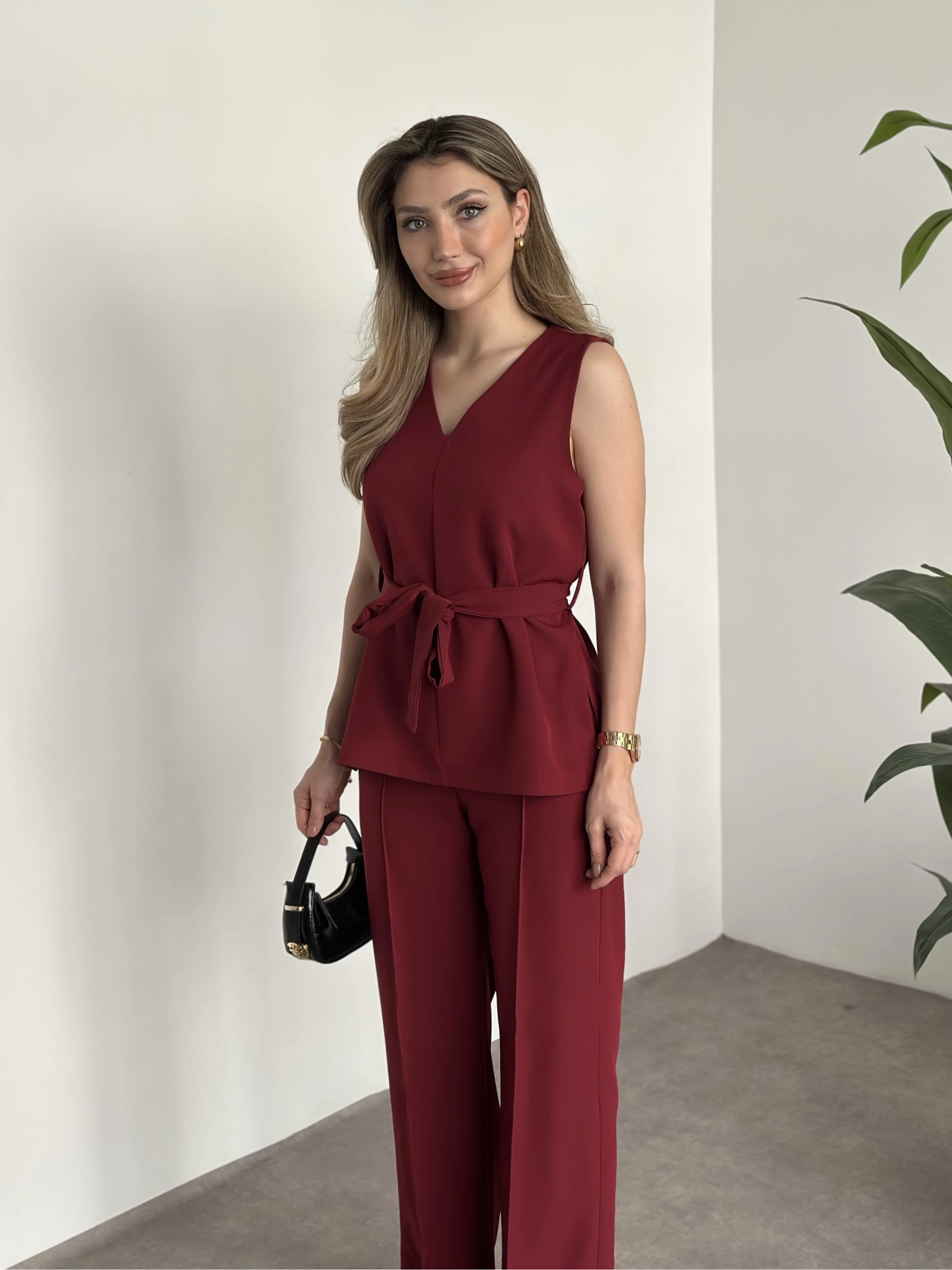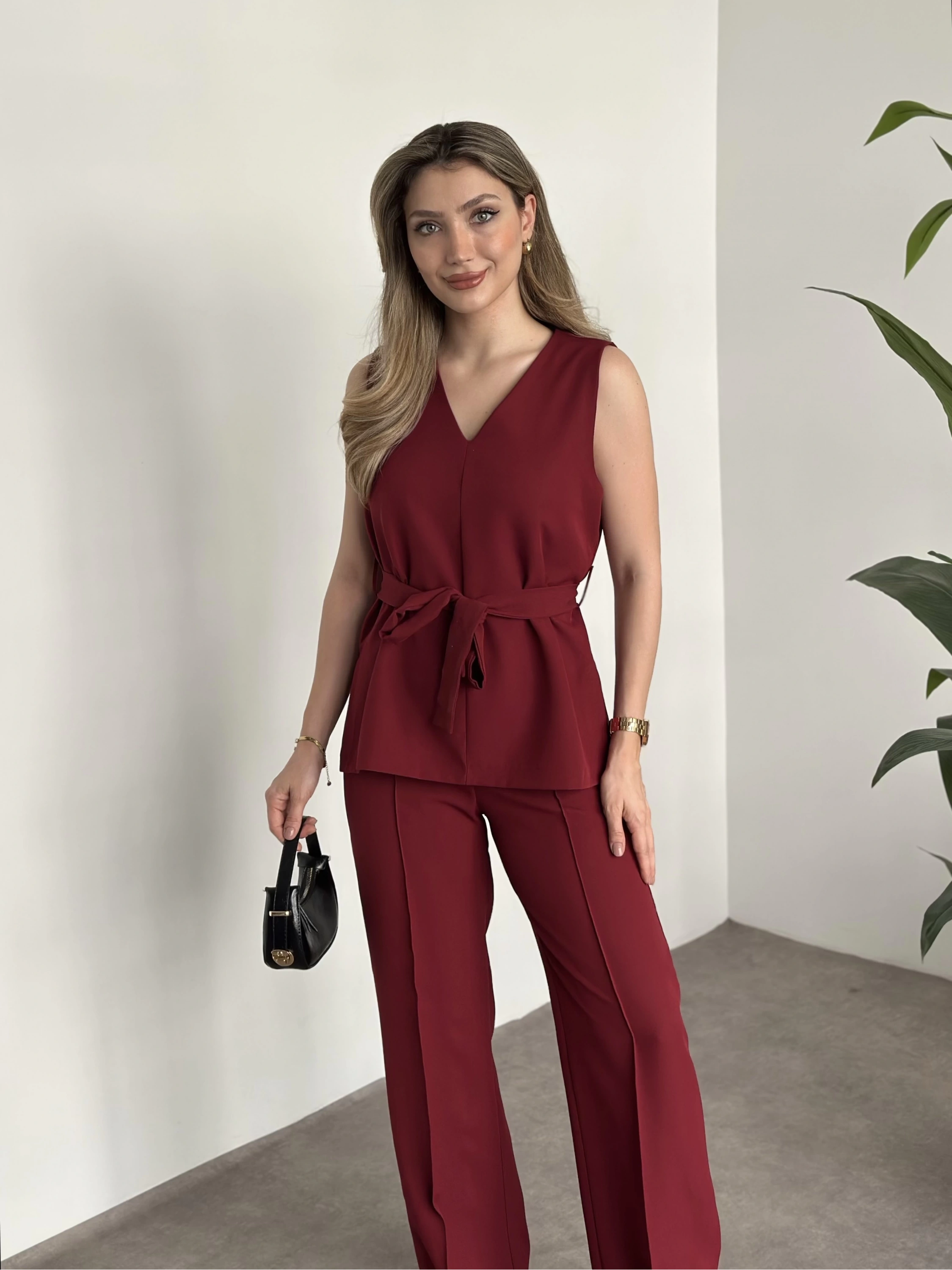 Sıfır kol belden bağlamalı kumaş takım siyah