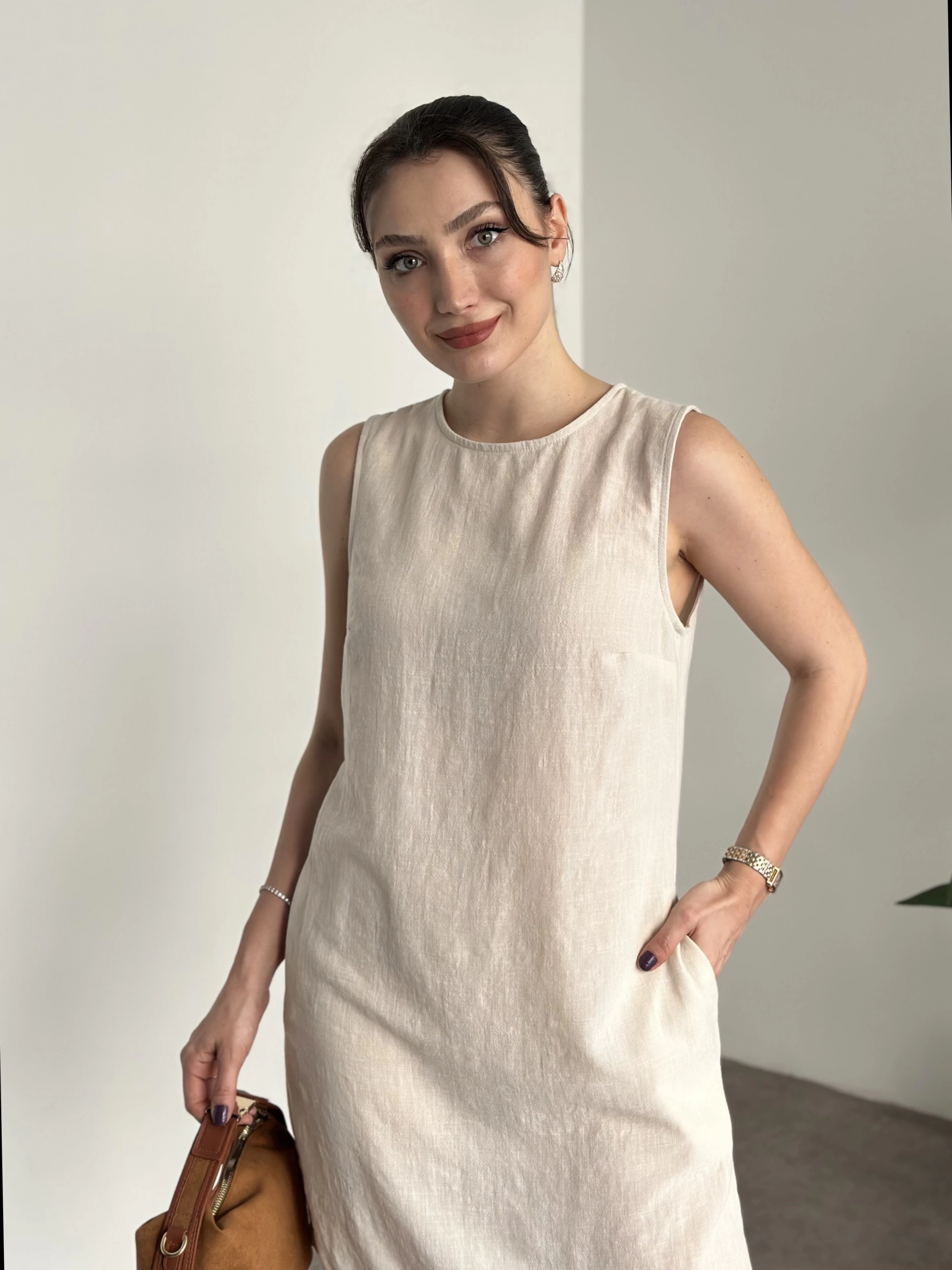 Sırt dekolteli askılı keten elbise yağ yeşili