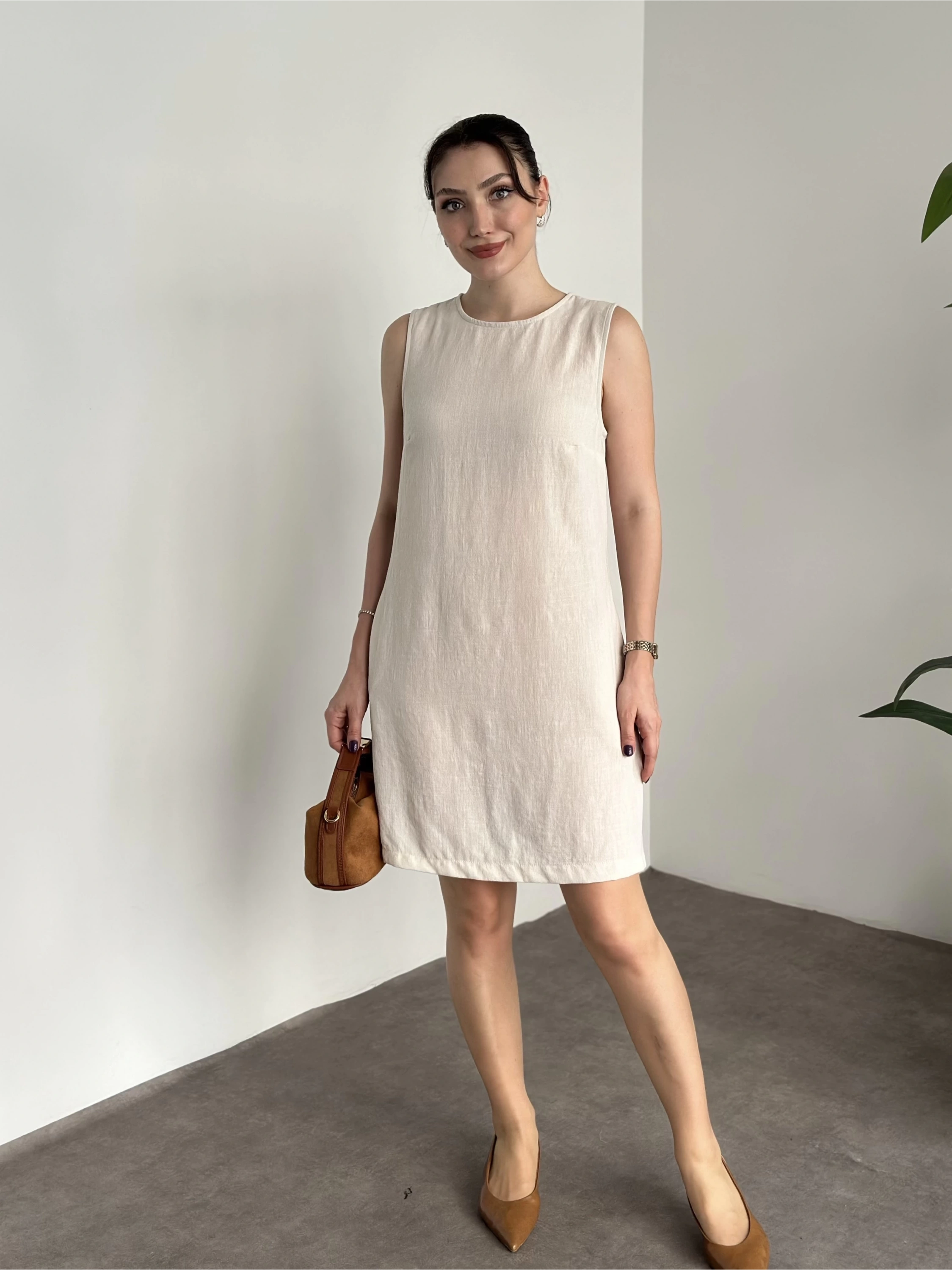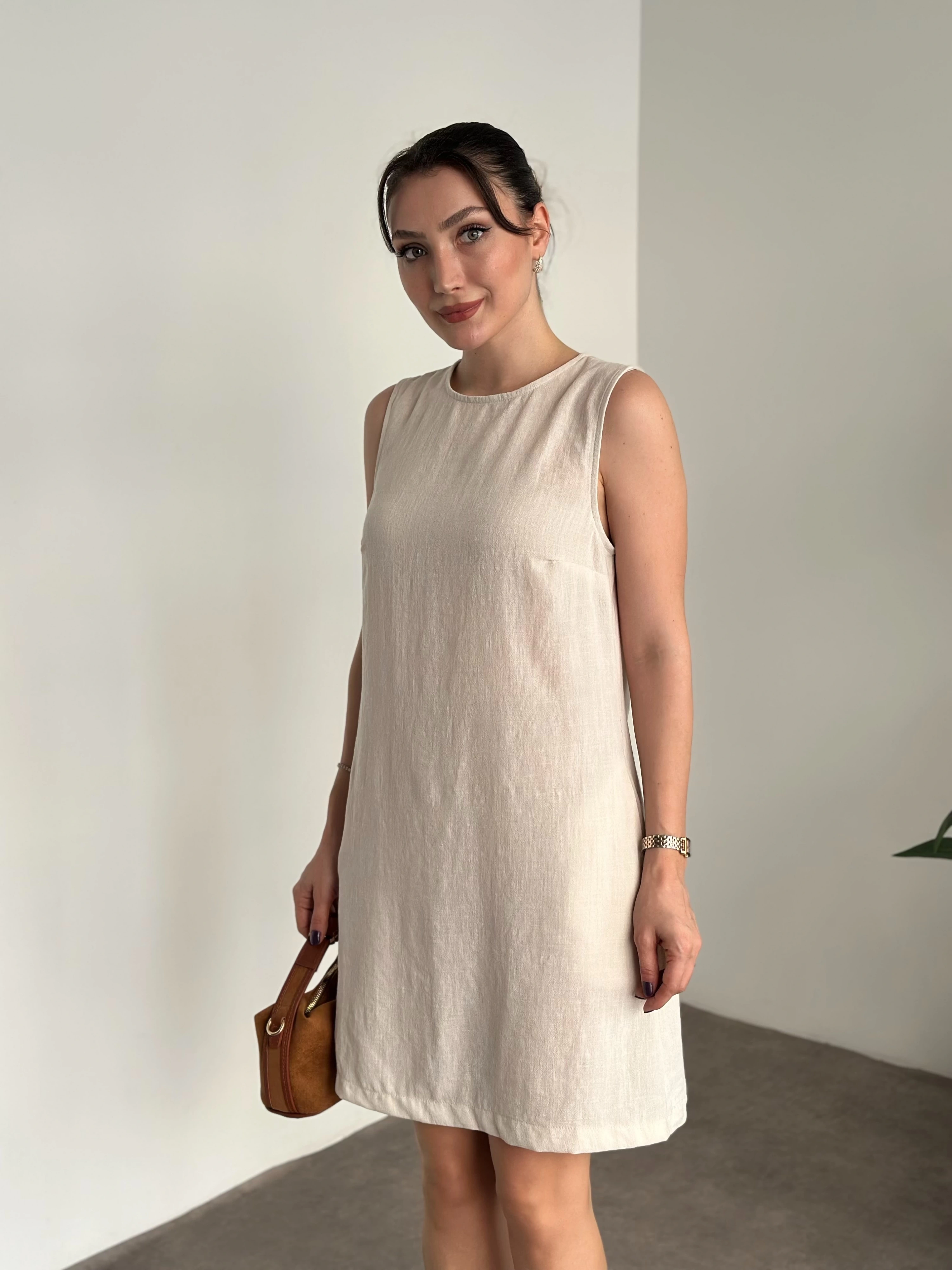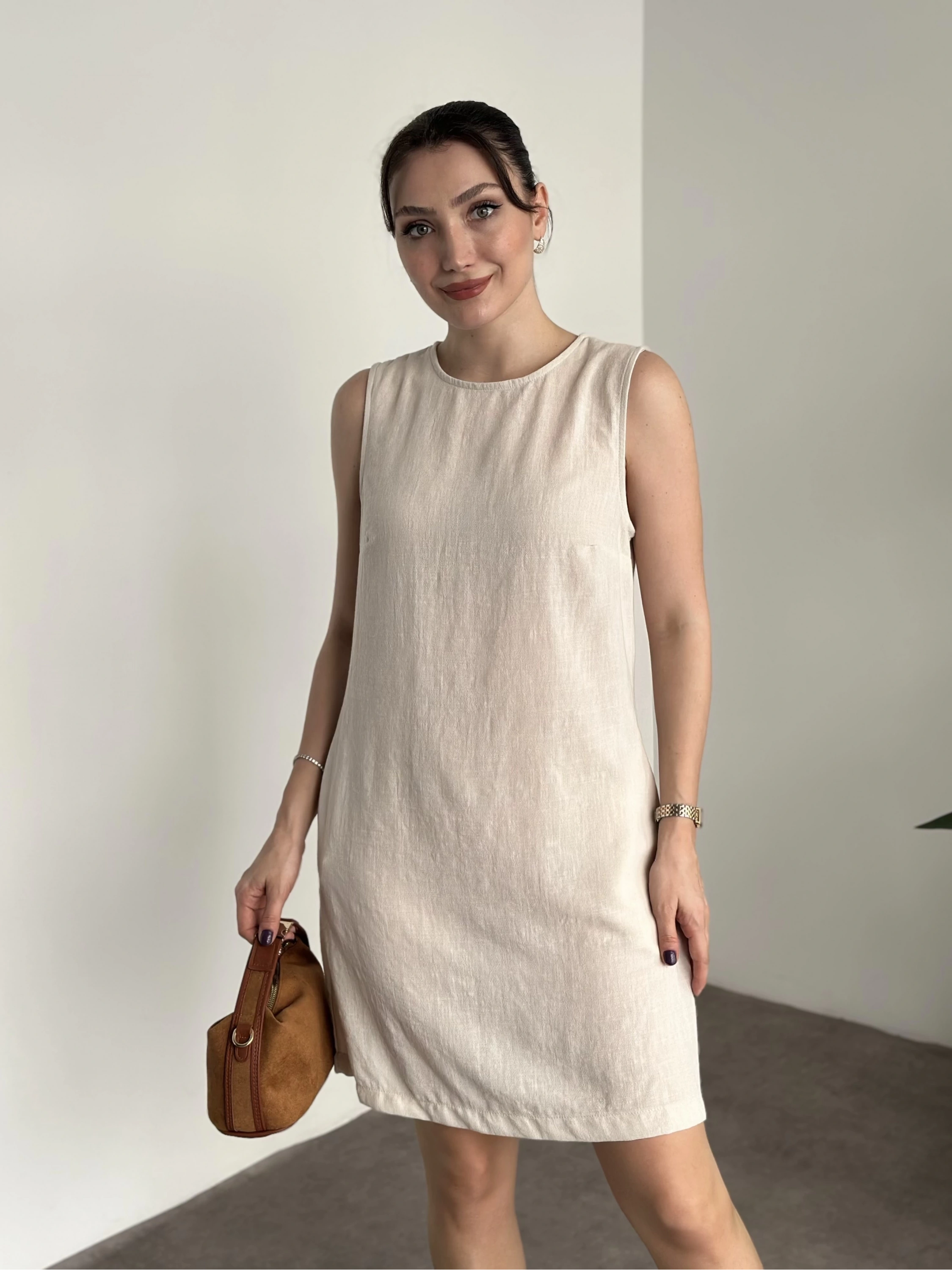 Sırt dekolteli askılı keten elbise bebek mavisi