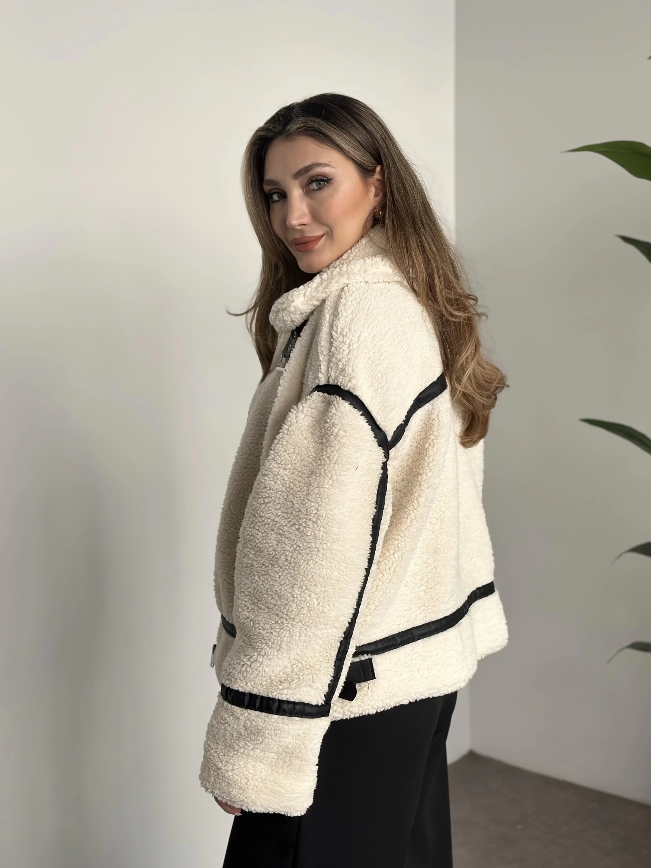 Biye detaylı içi astarlı teddy mont taş