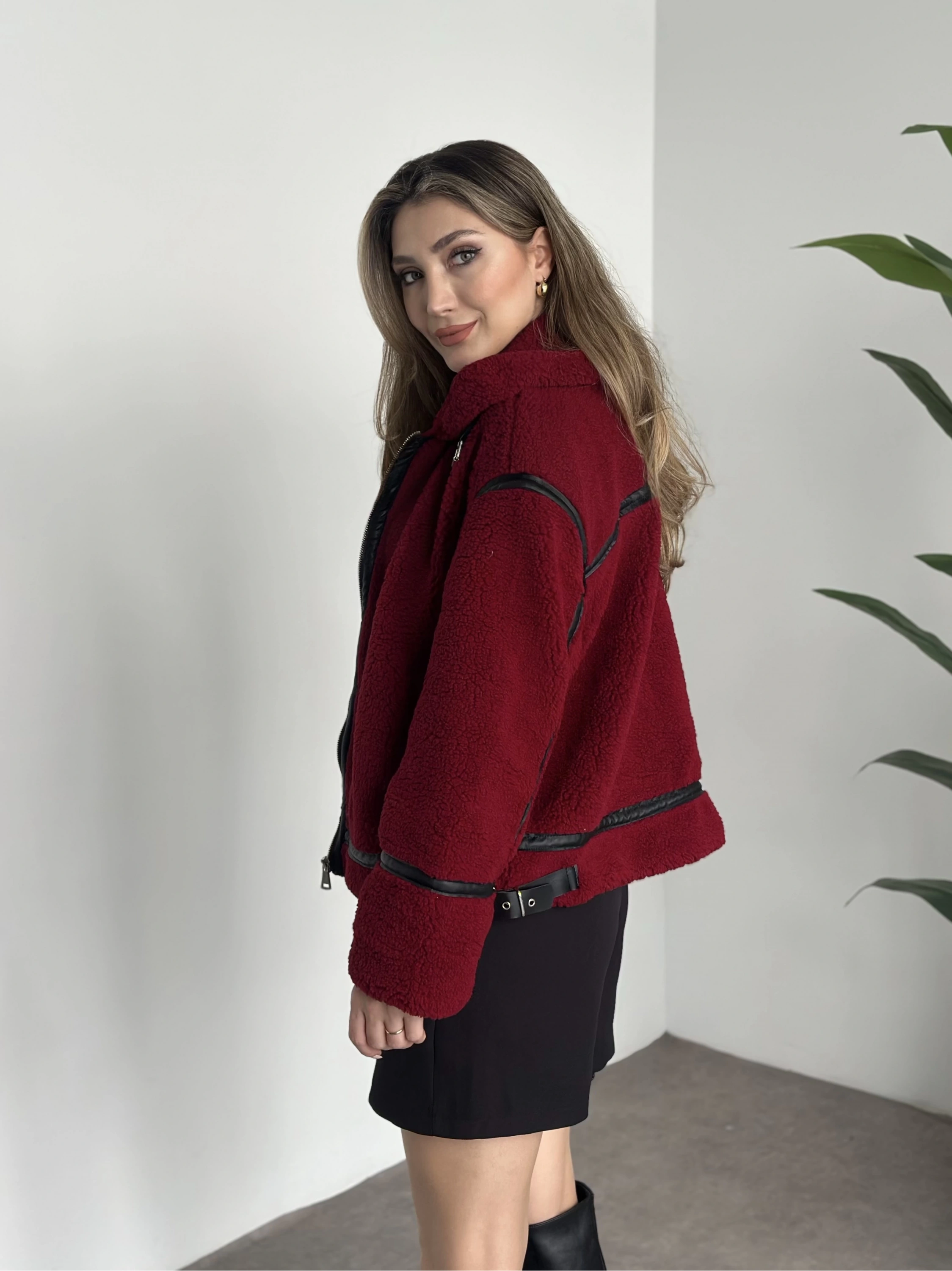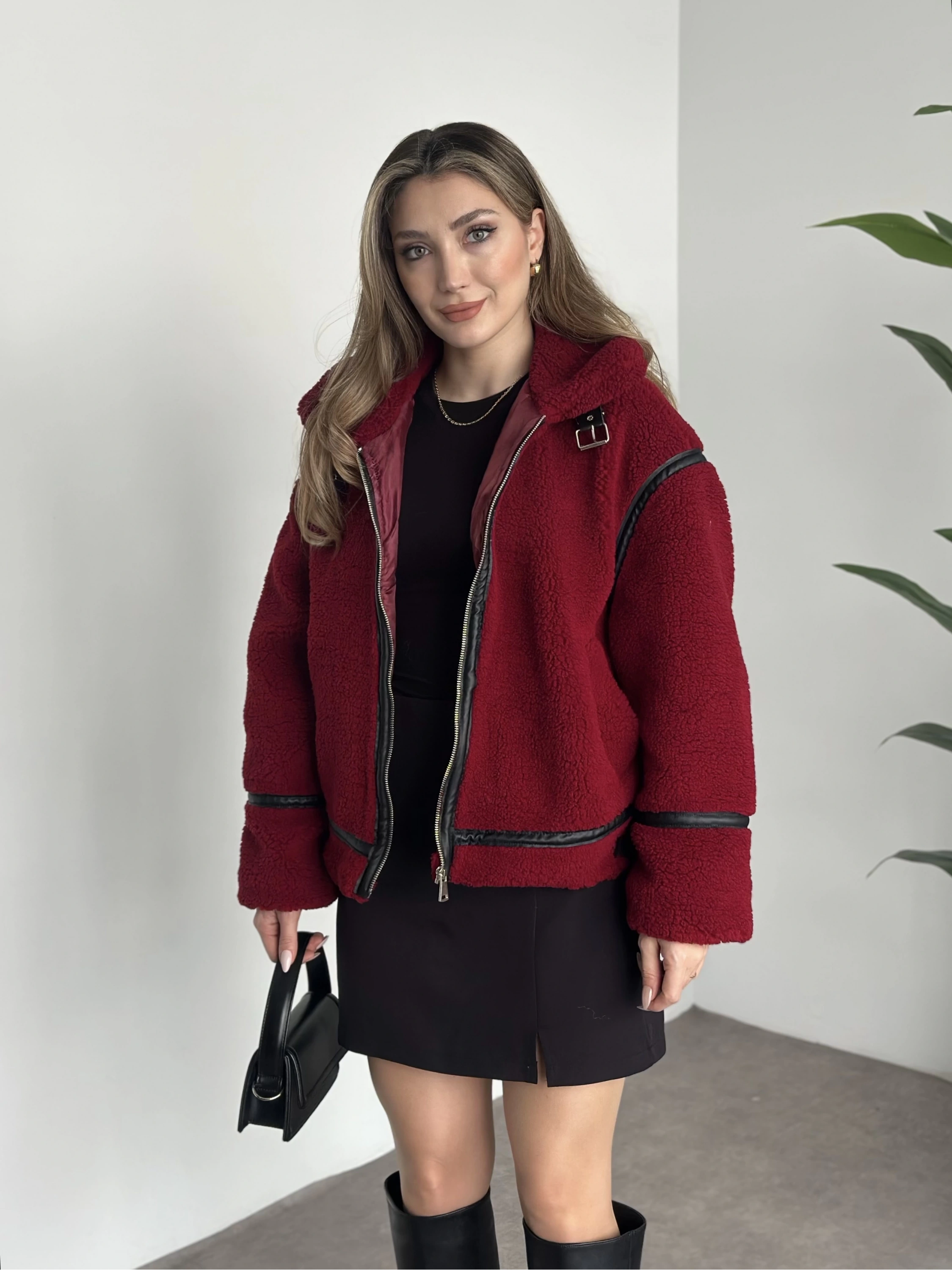 Biye detaylı içi astarlı teddy mont bordo