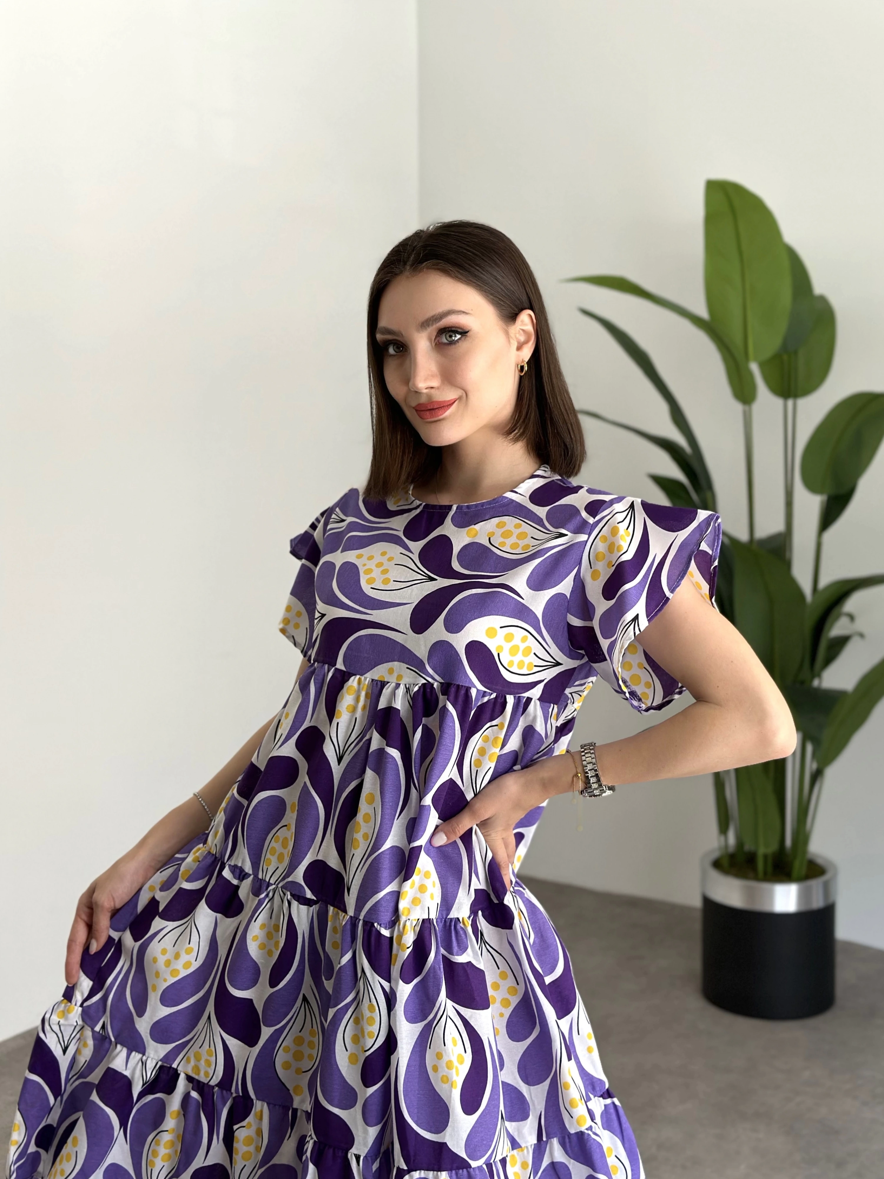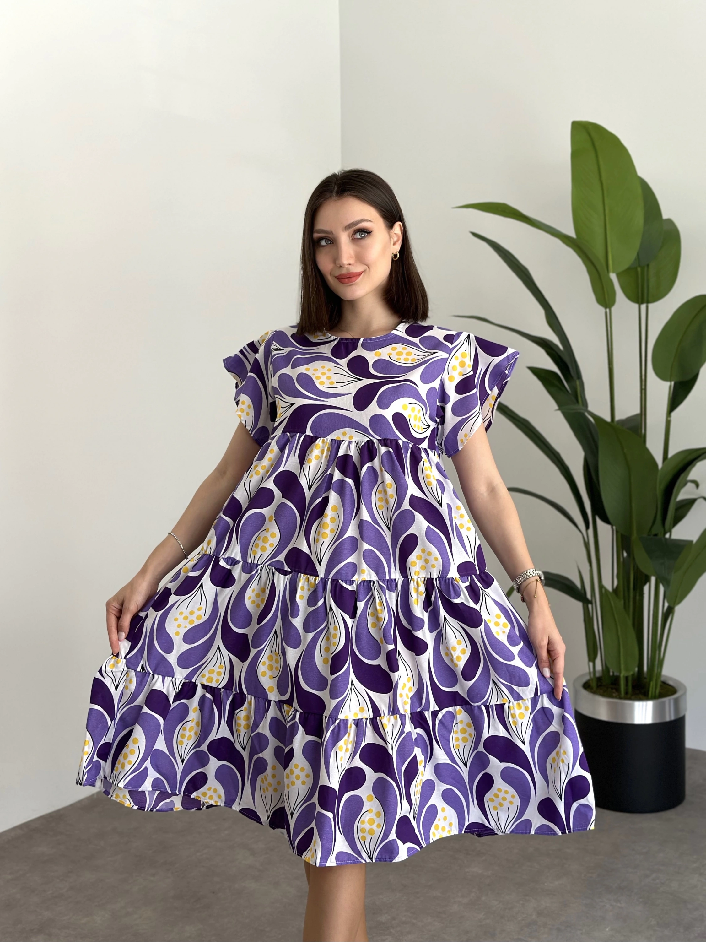 Bol Kesim Poplin Kumaş Mini Elbise Lila Mor Desenli