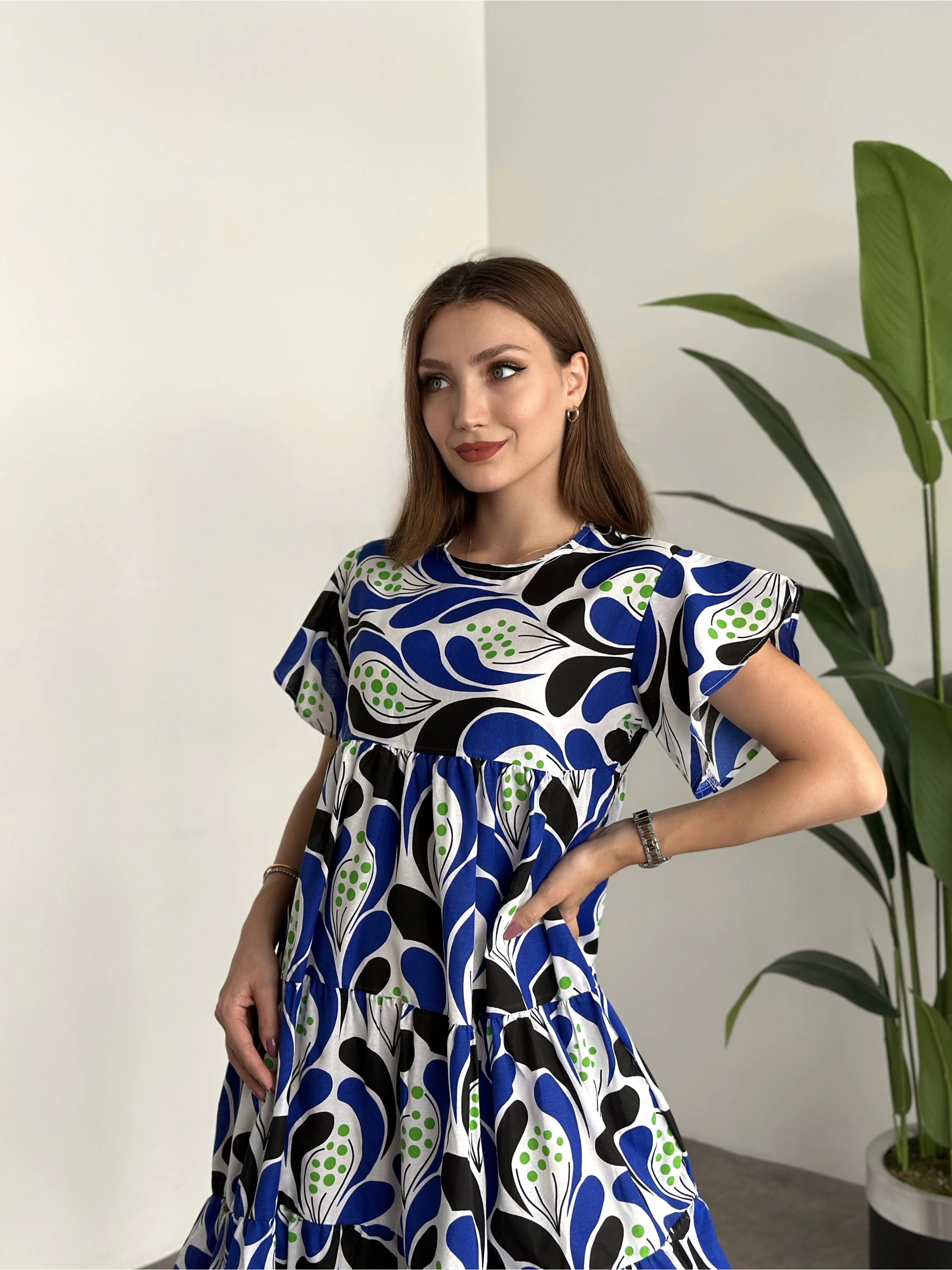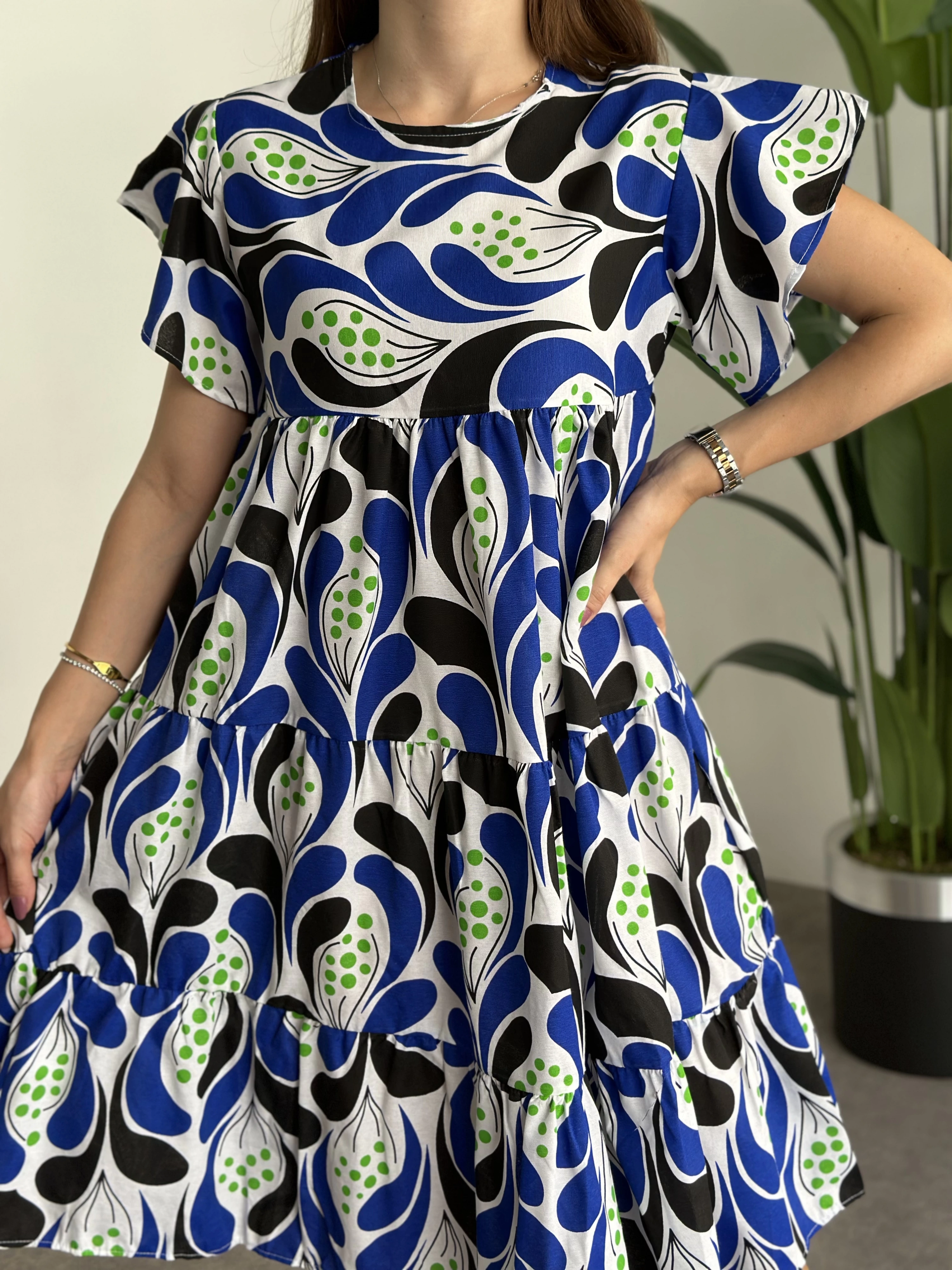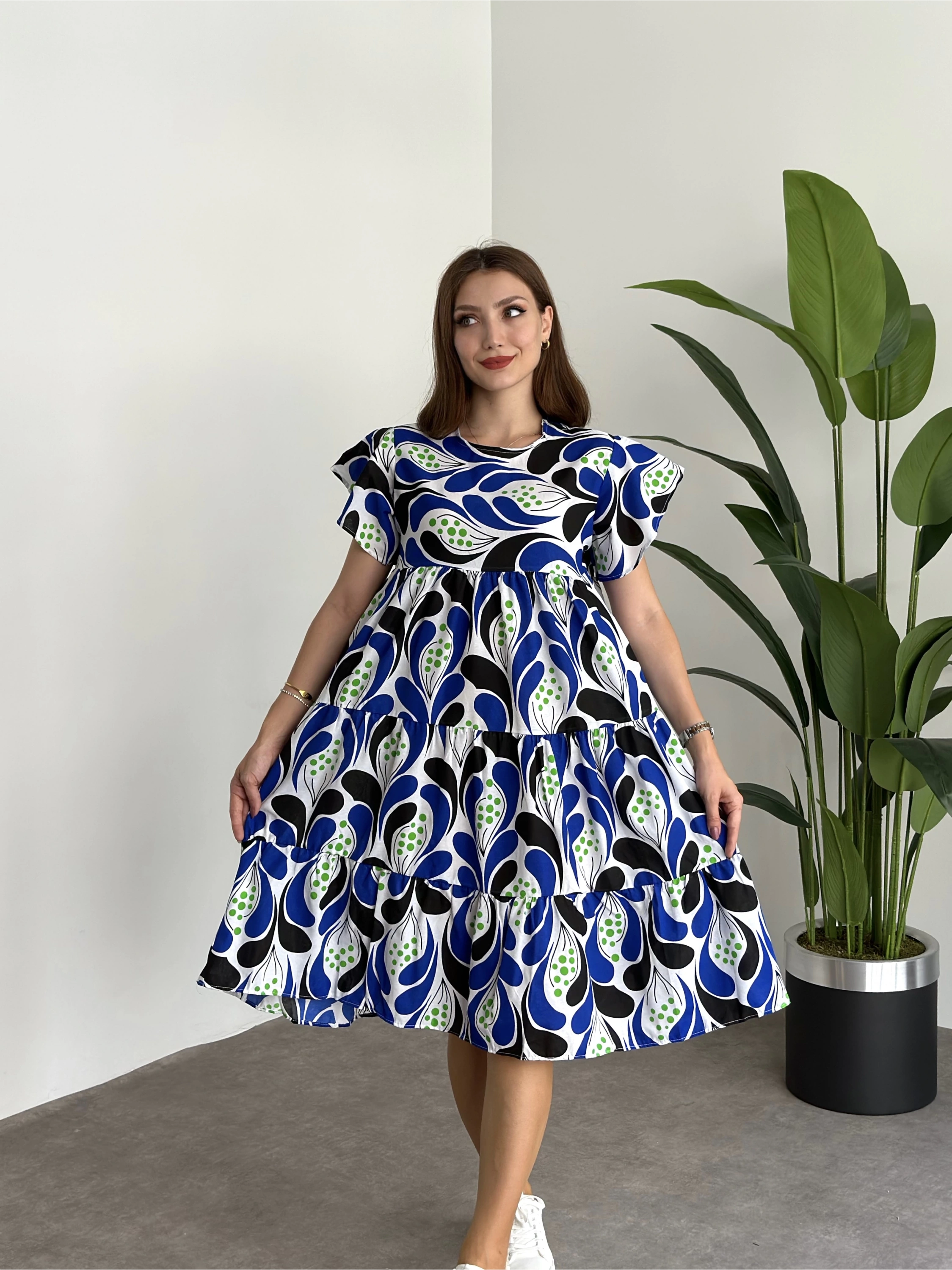 Bol Kesim Poplin Kumaş Mini Elbise Mavi Beyaz Desenli