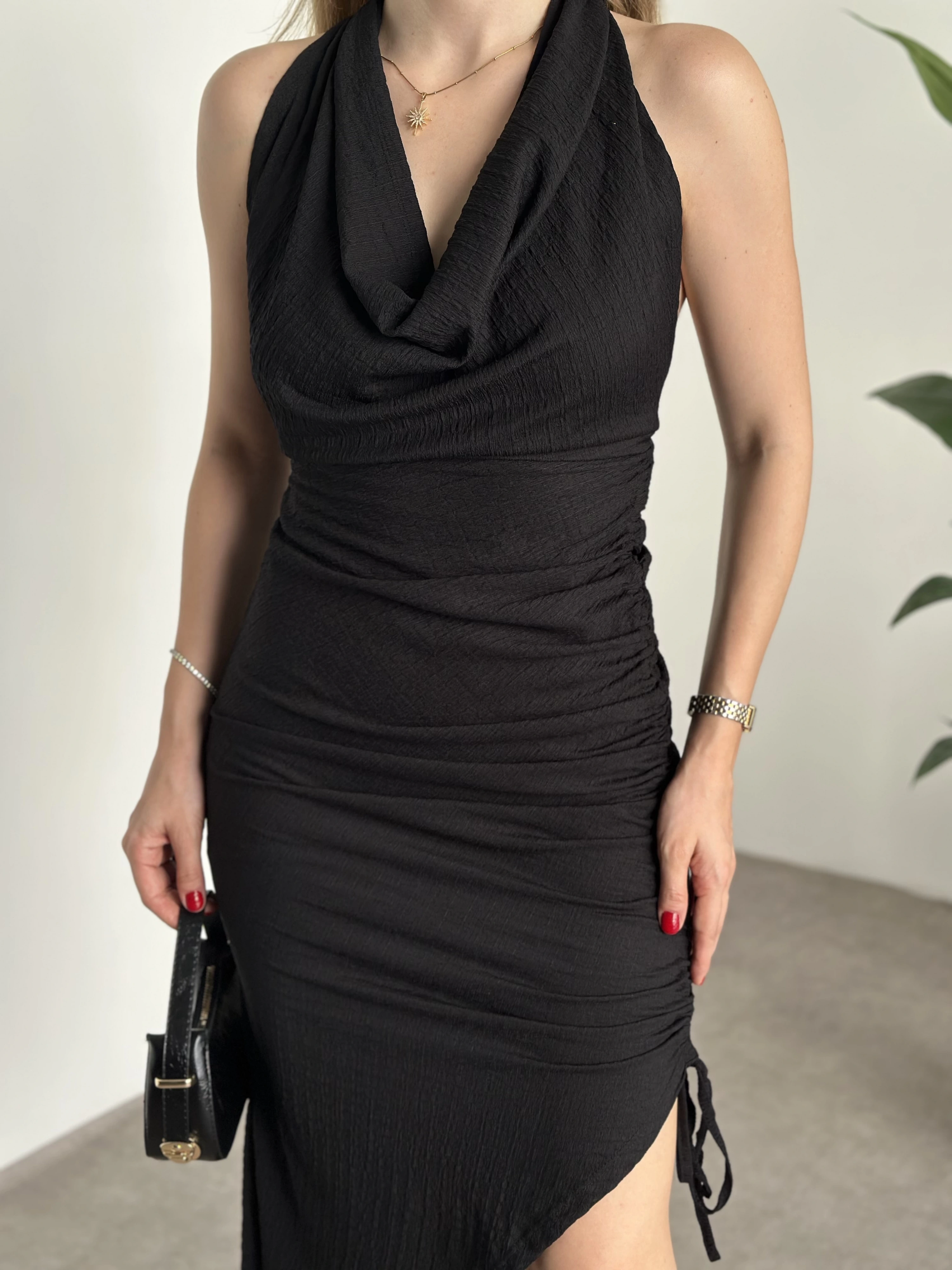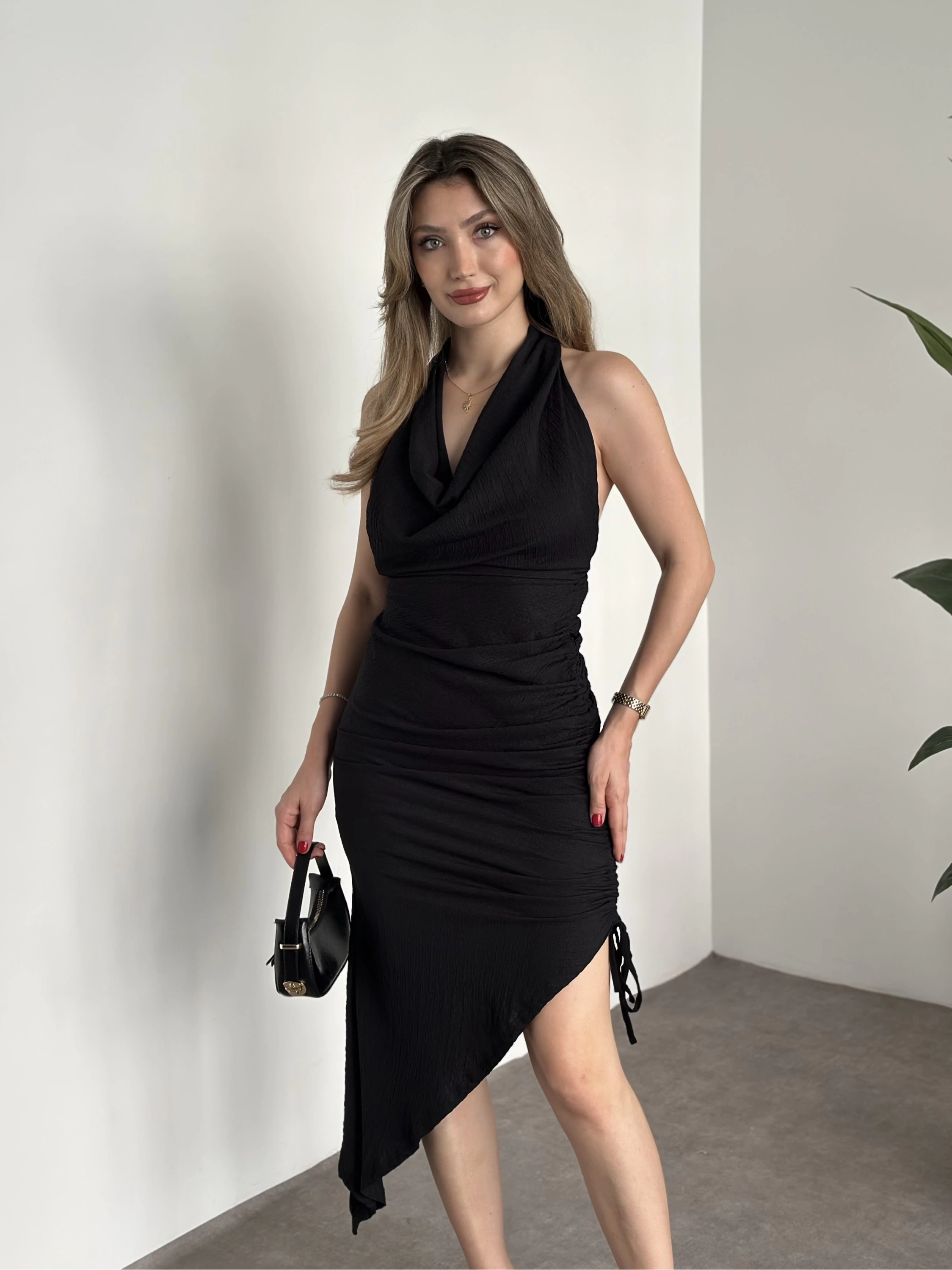 Boyundan bağlamalı asimetrik kesim gofre kumaş elbise siyah