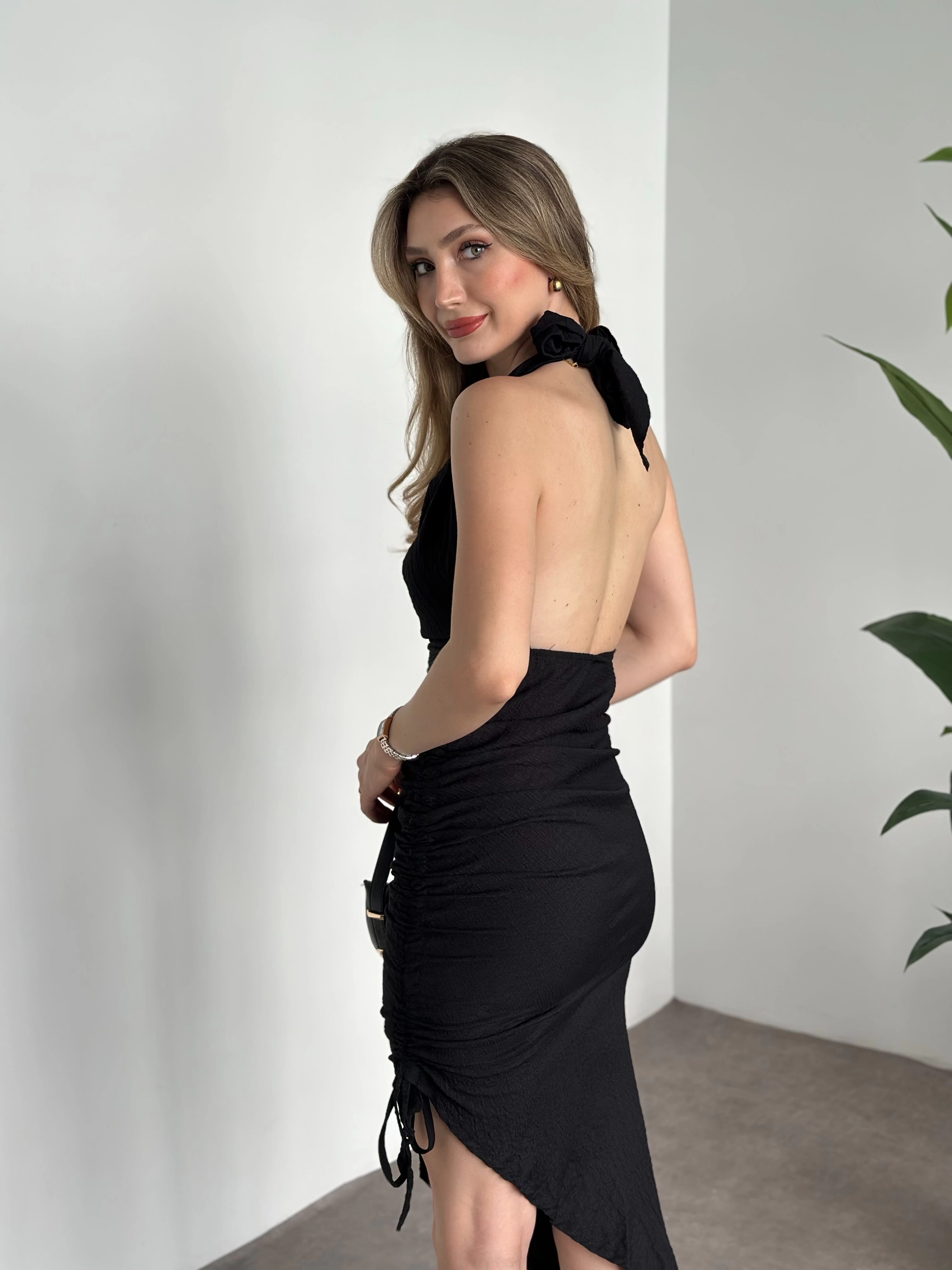 Boyundan bağlamalı yırtmaçlı ithal sandy kumaş elbise siyah