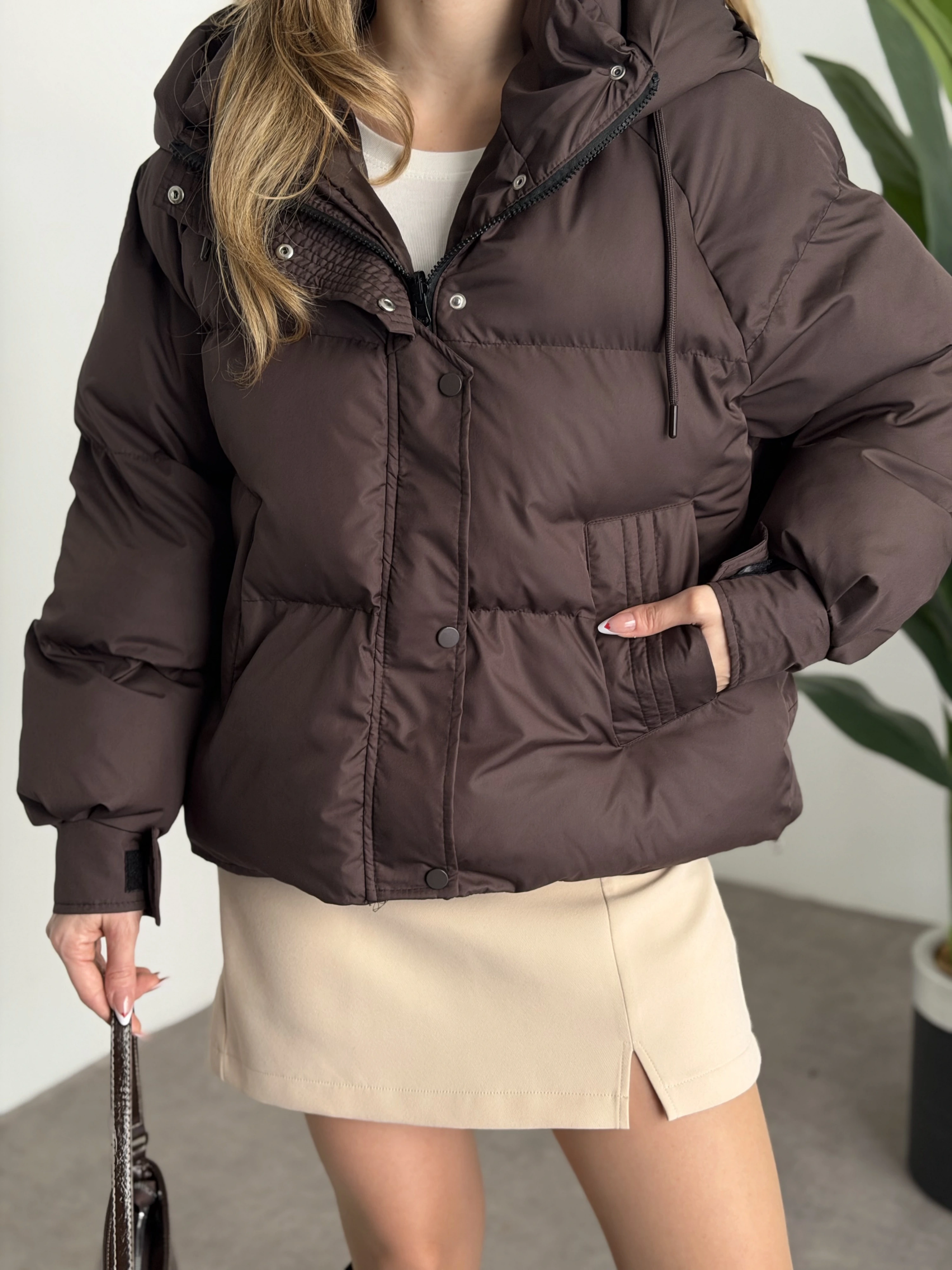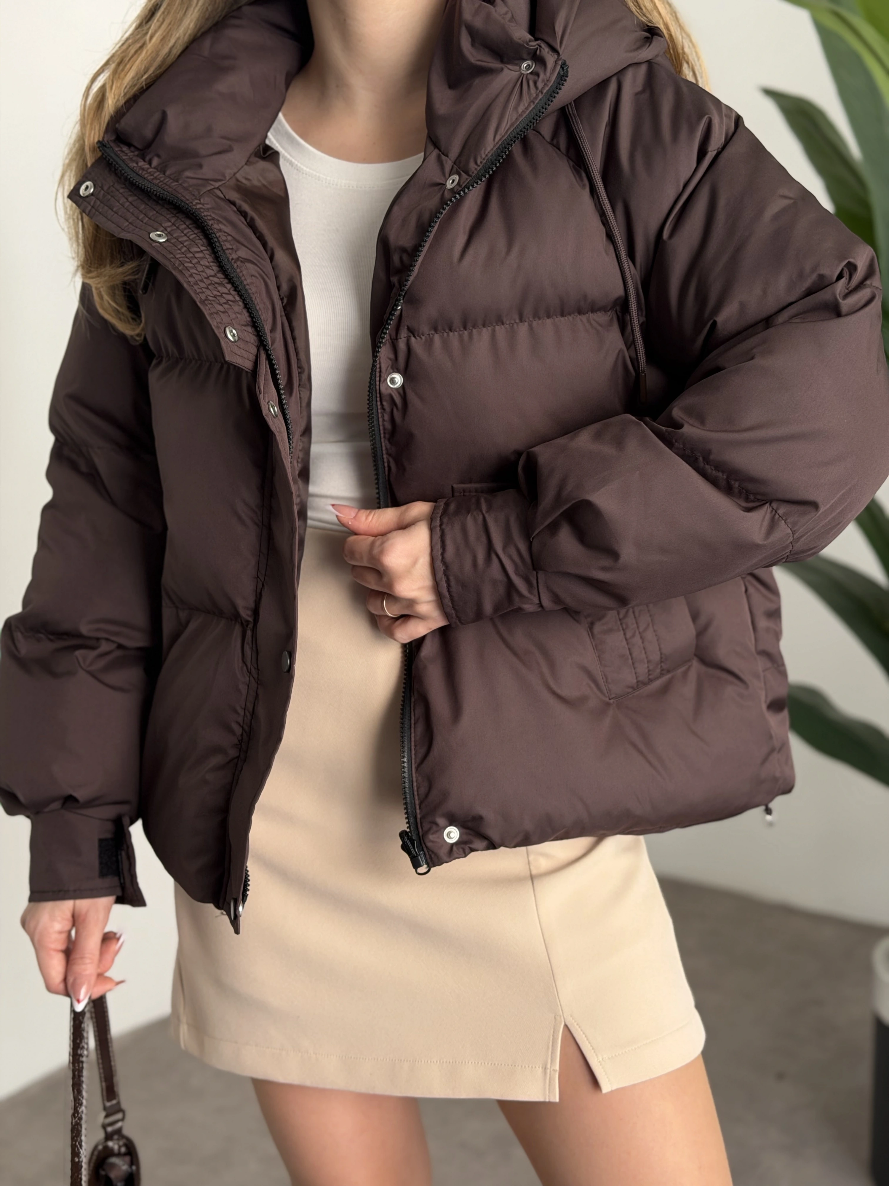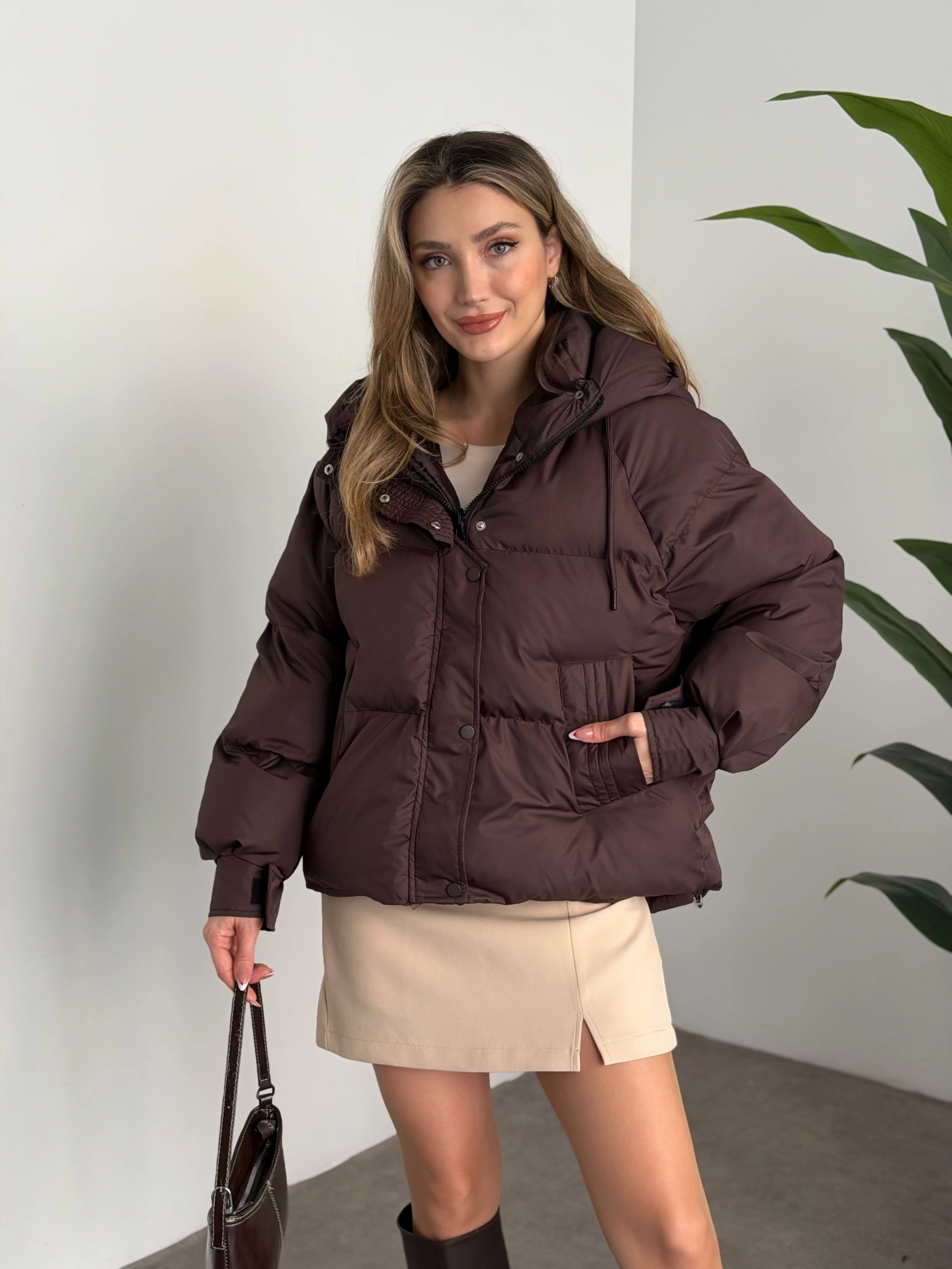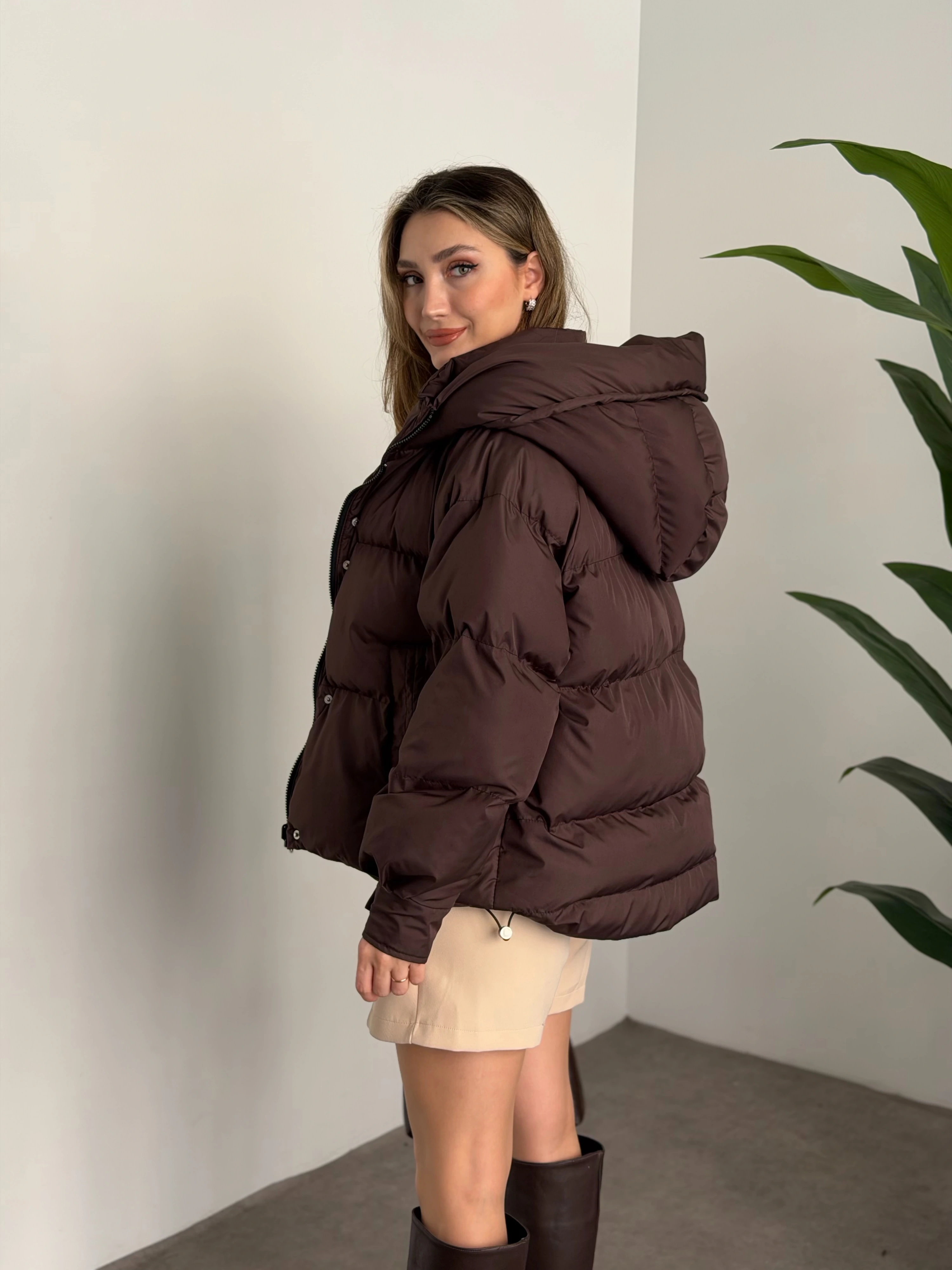 Buffy oversize kapşonlu şişme mont kahve