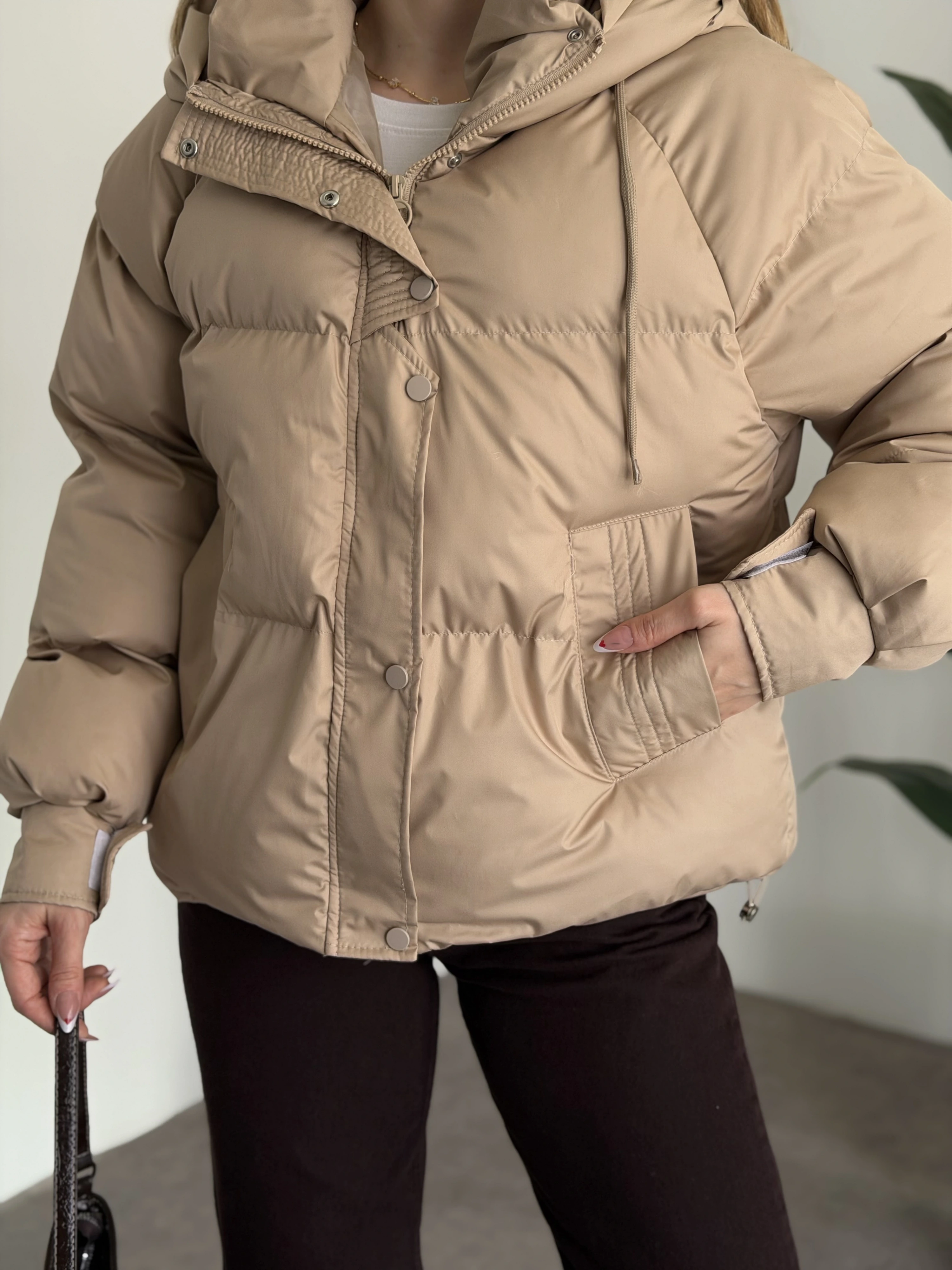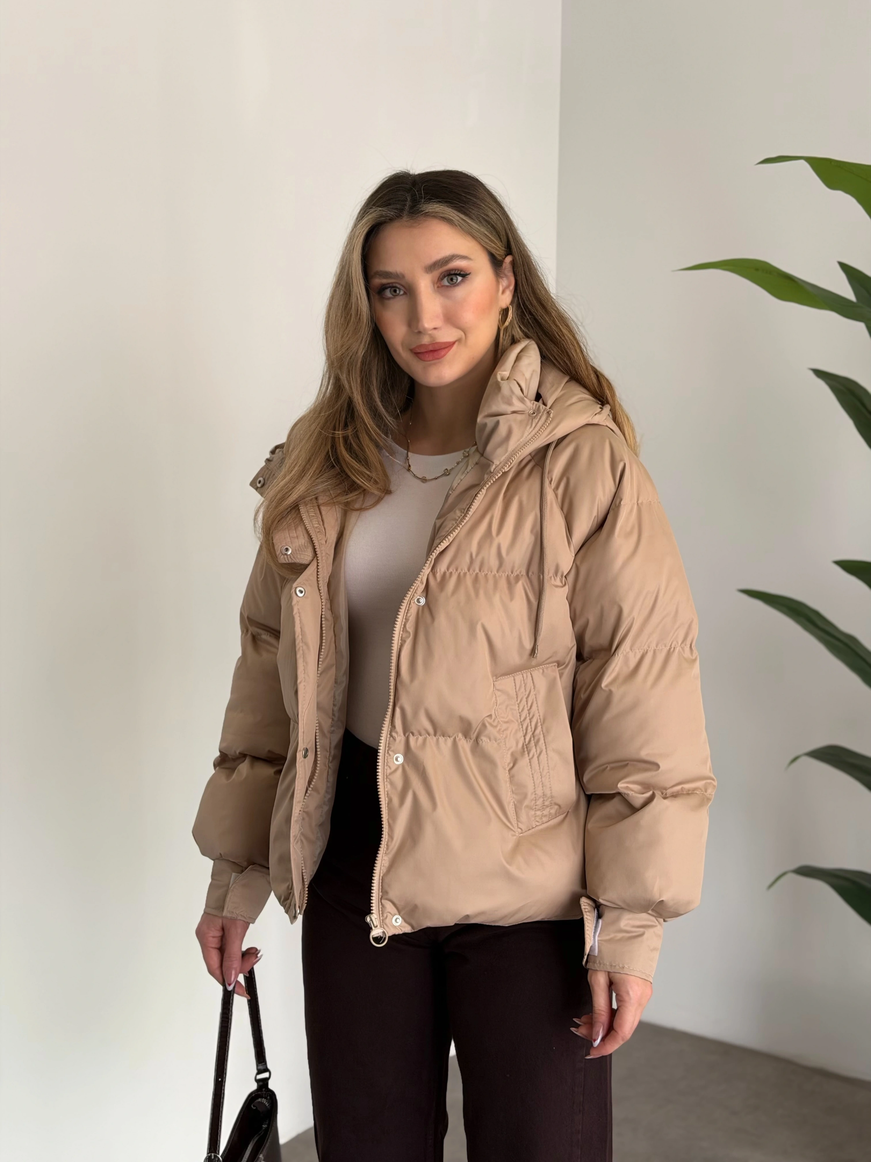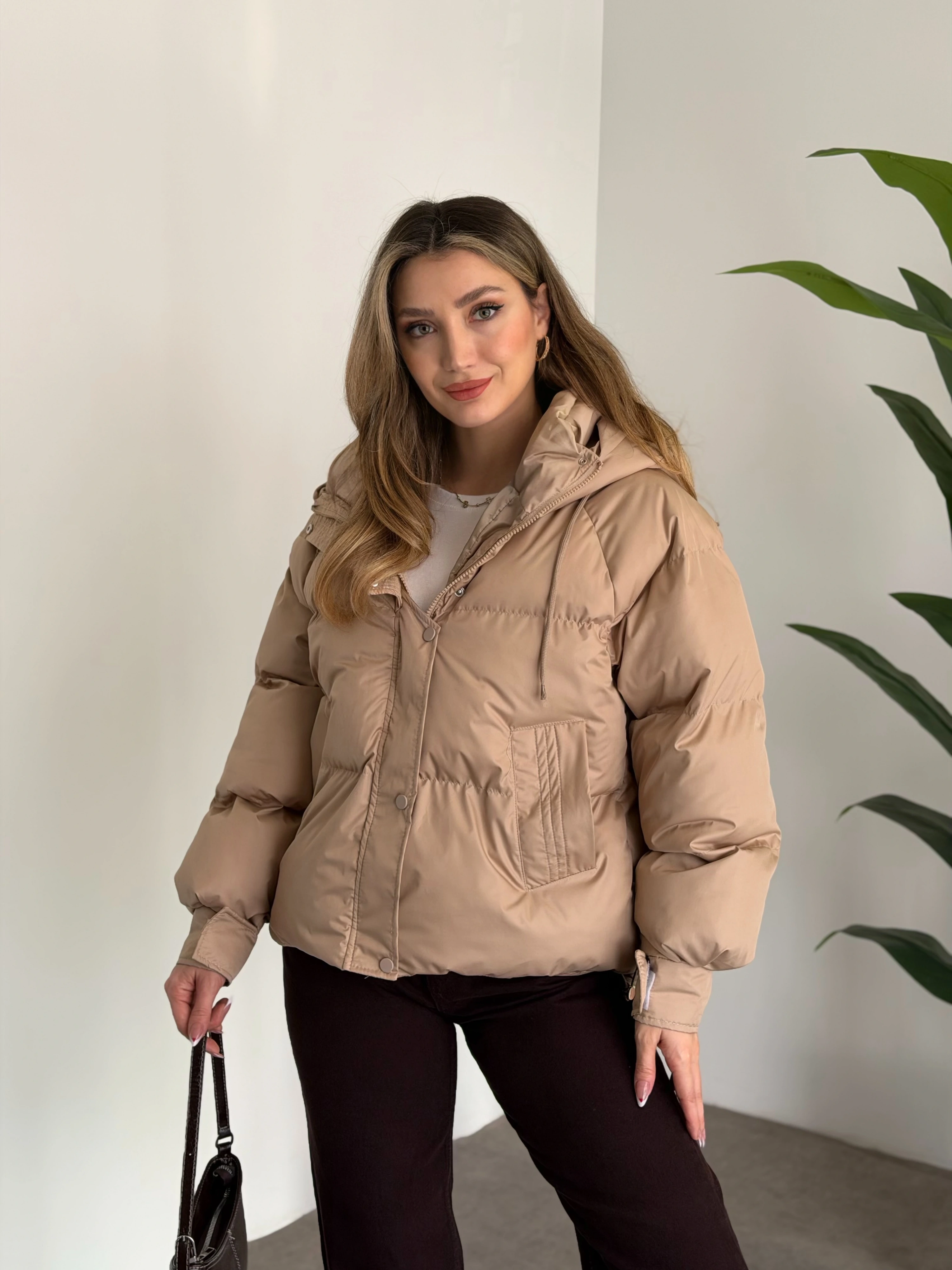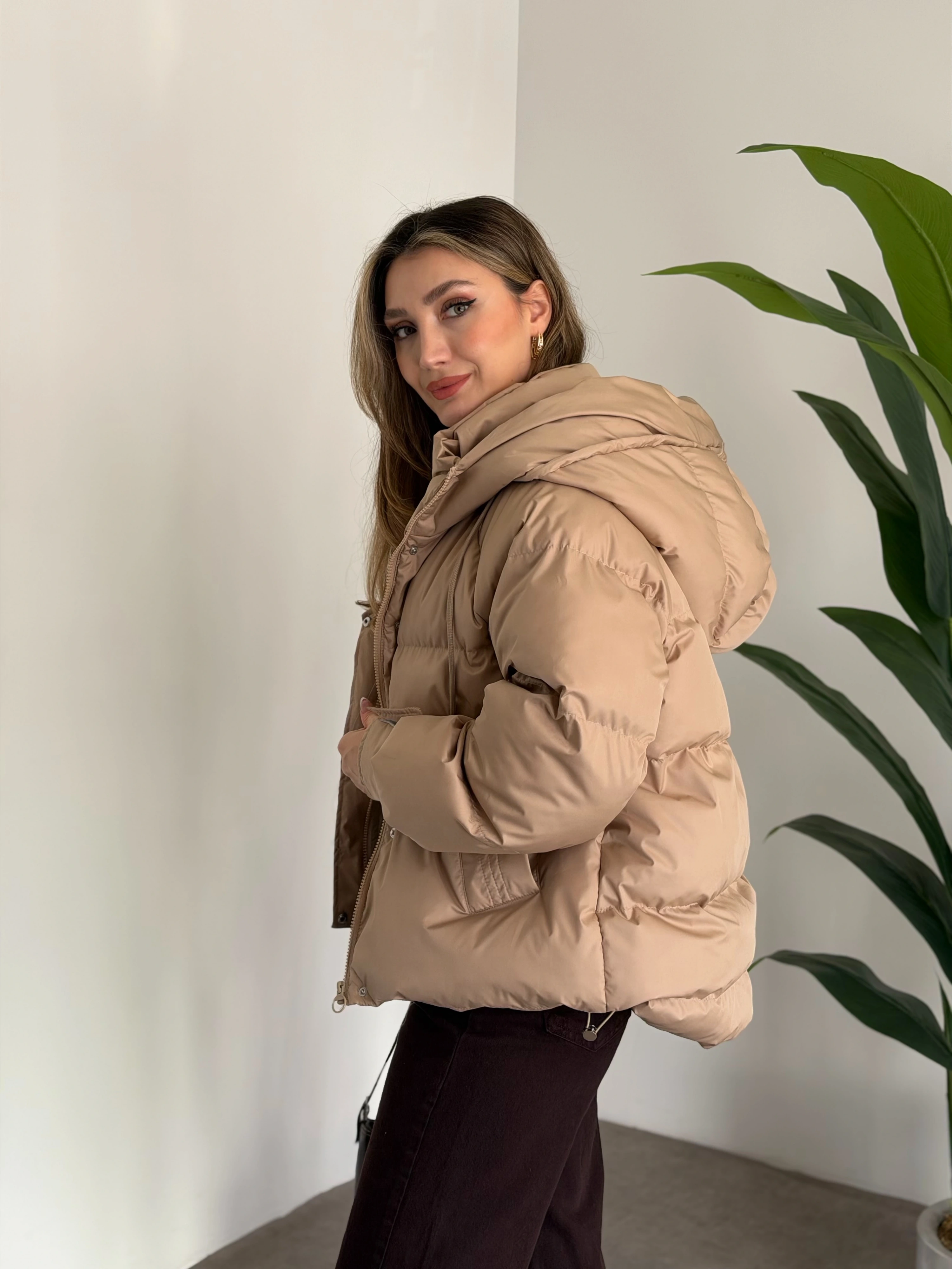 Buffy oversize kapşonlu şişme mont taş