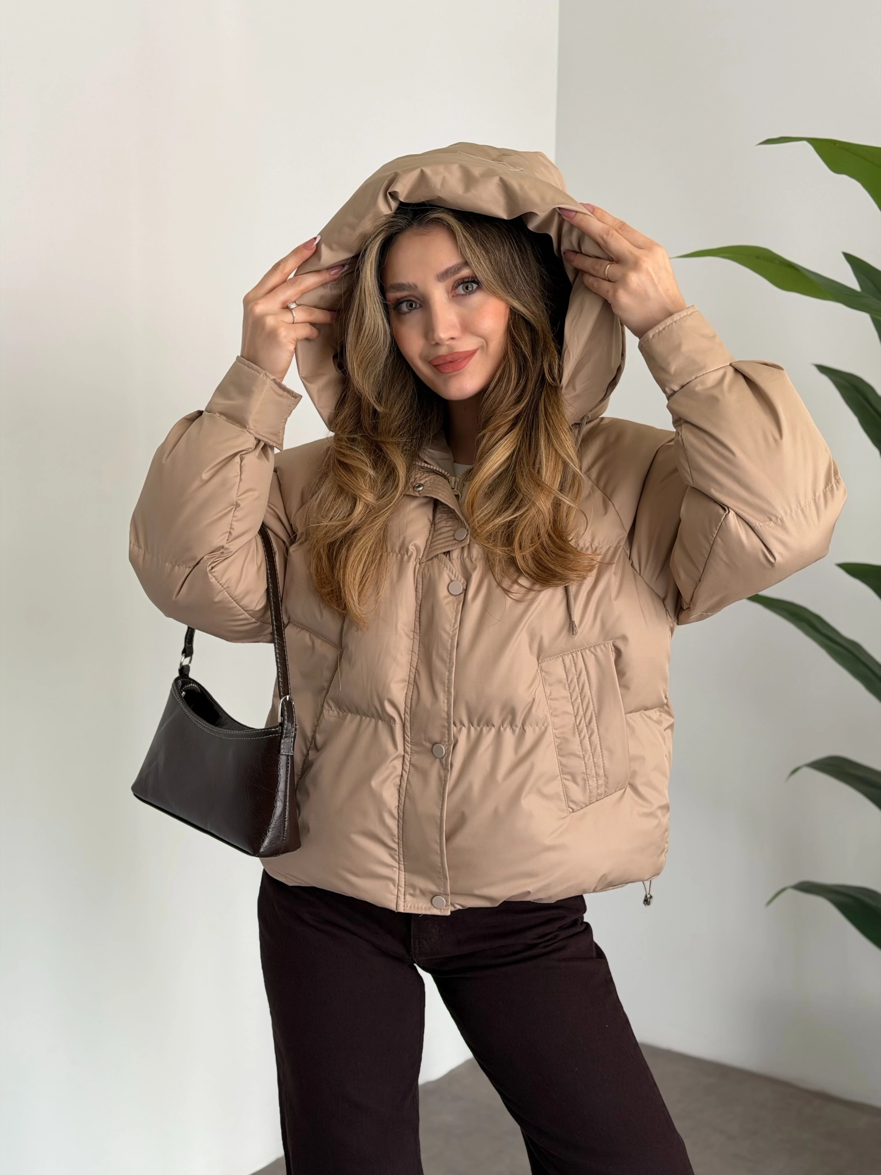 Dokulu süet içi peluşlu oversize marka model mont kahve