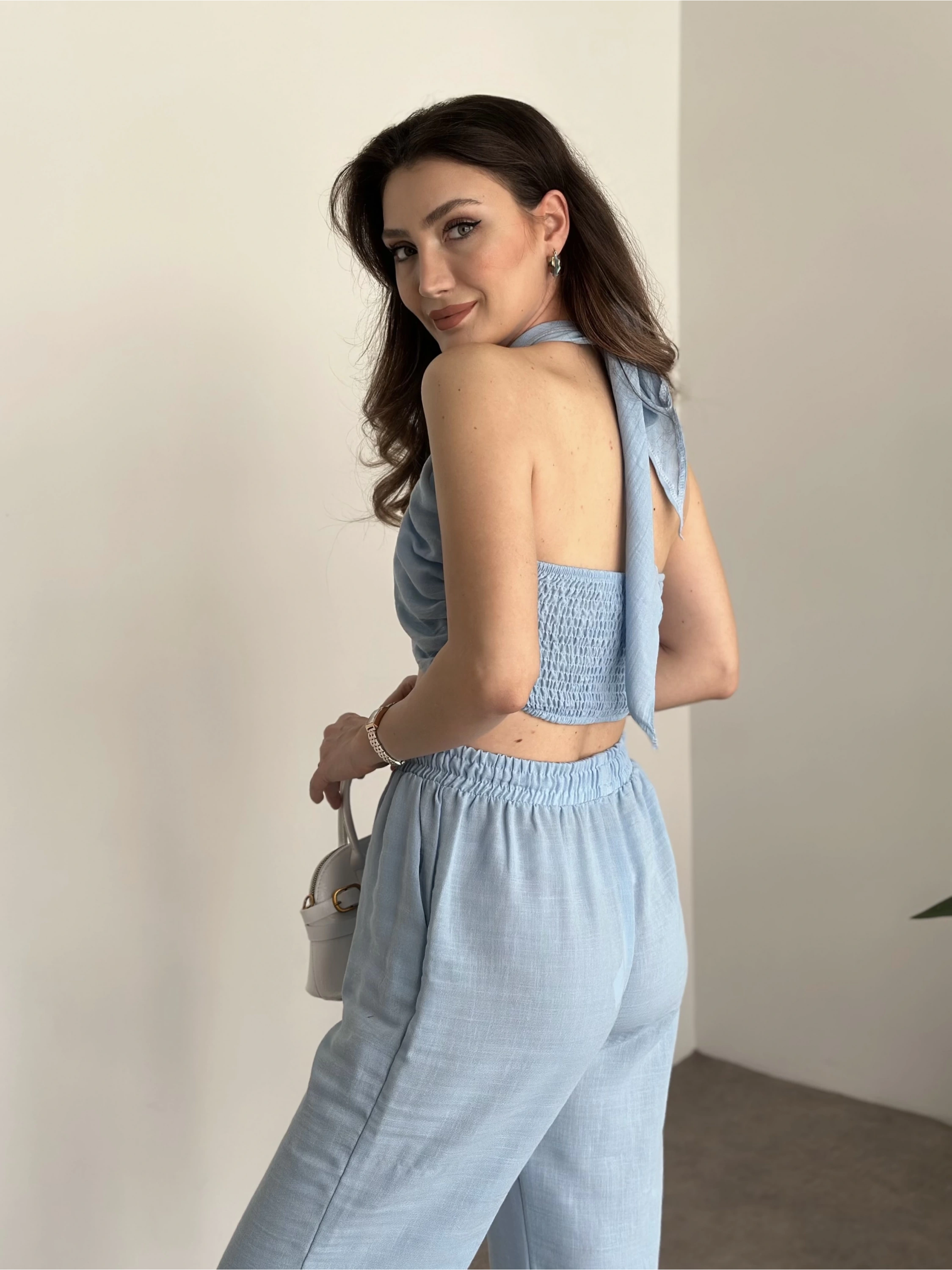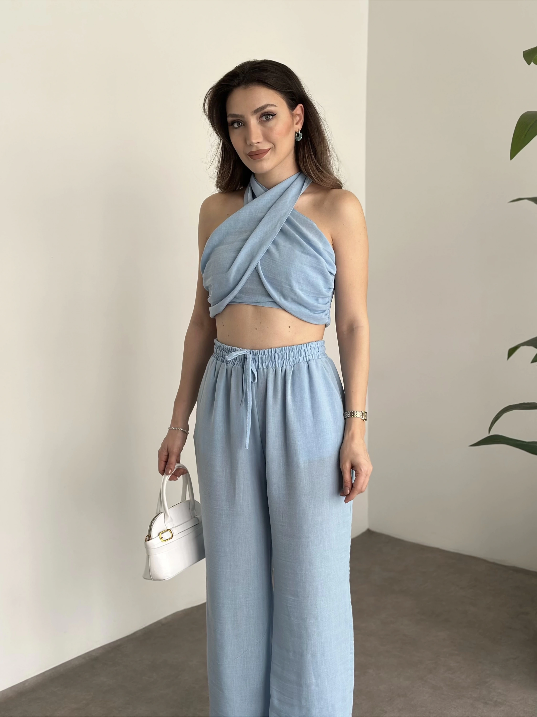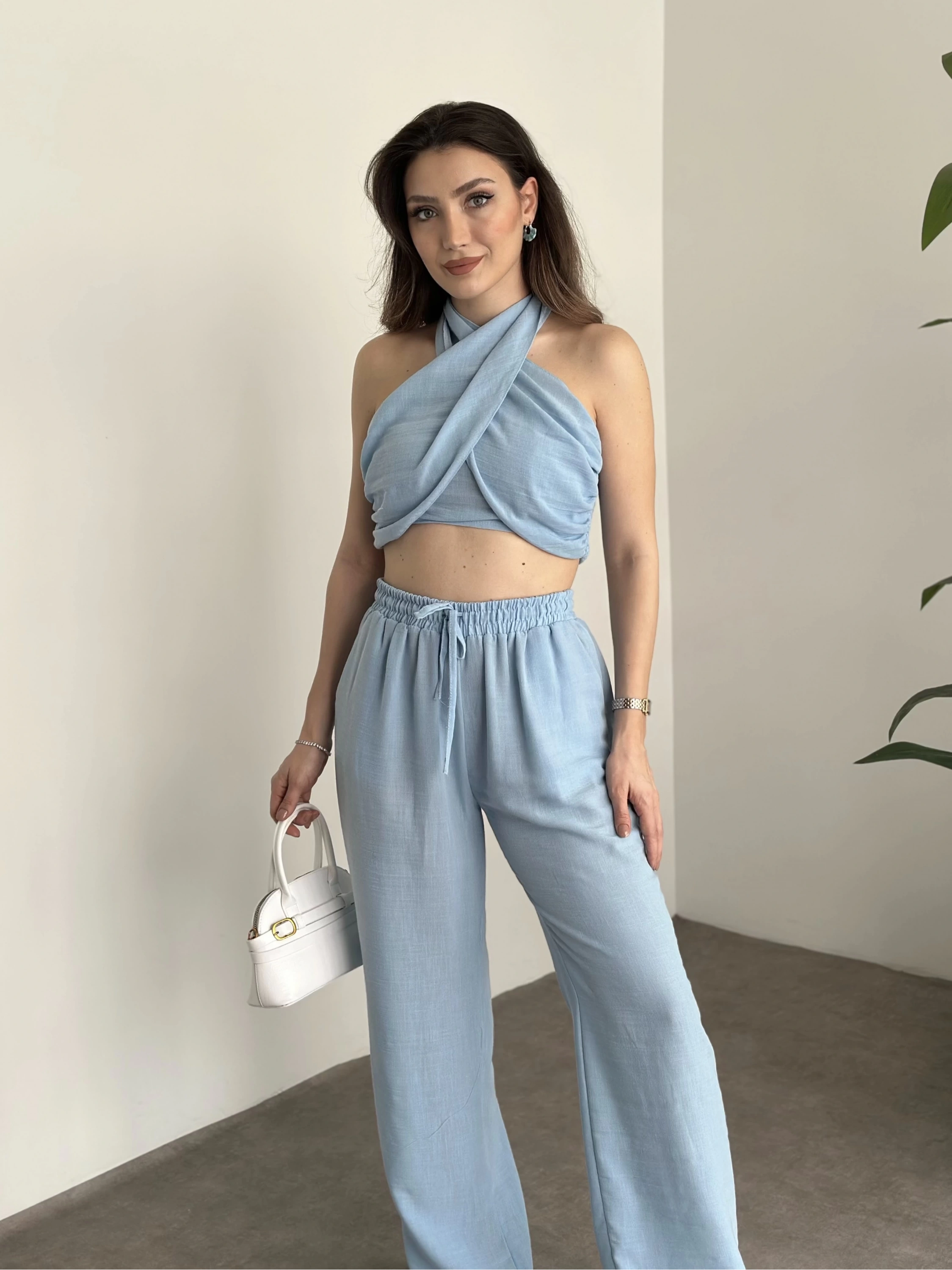 Çapraz bağlama detaylı keten takım bebek mavisi