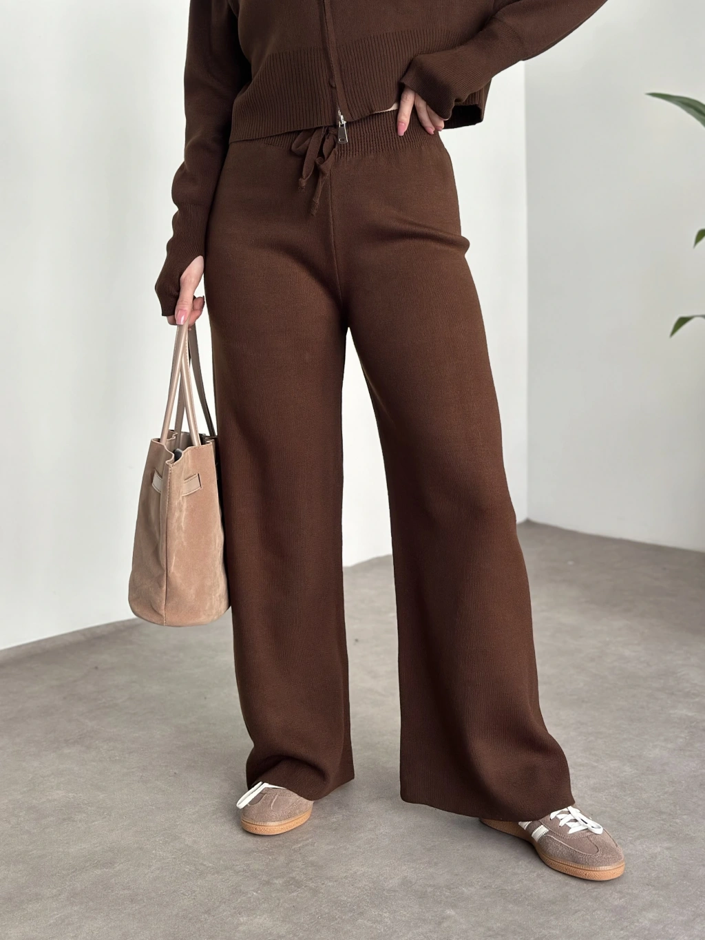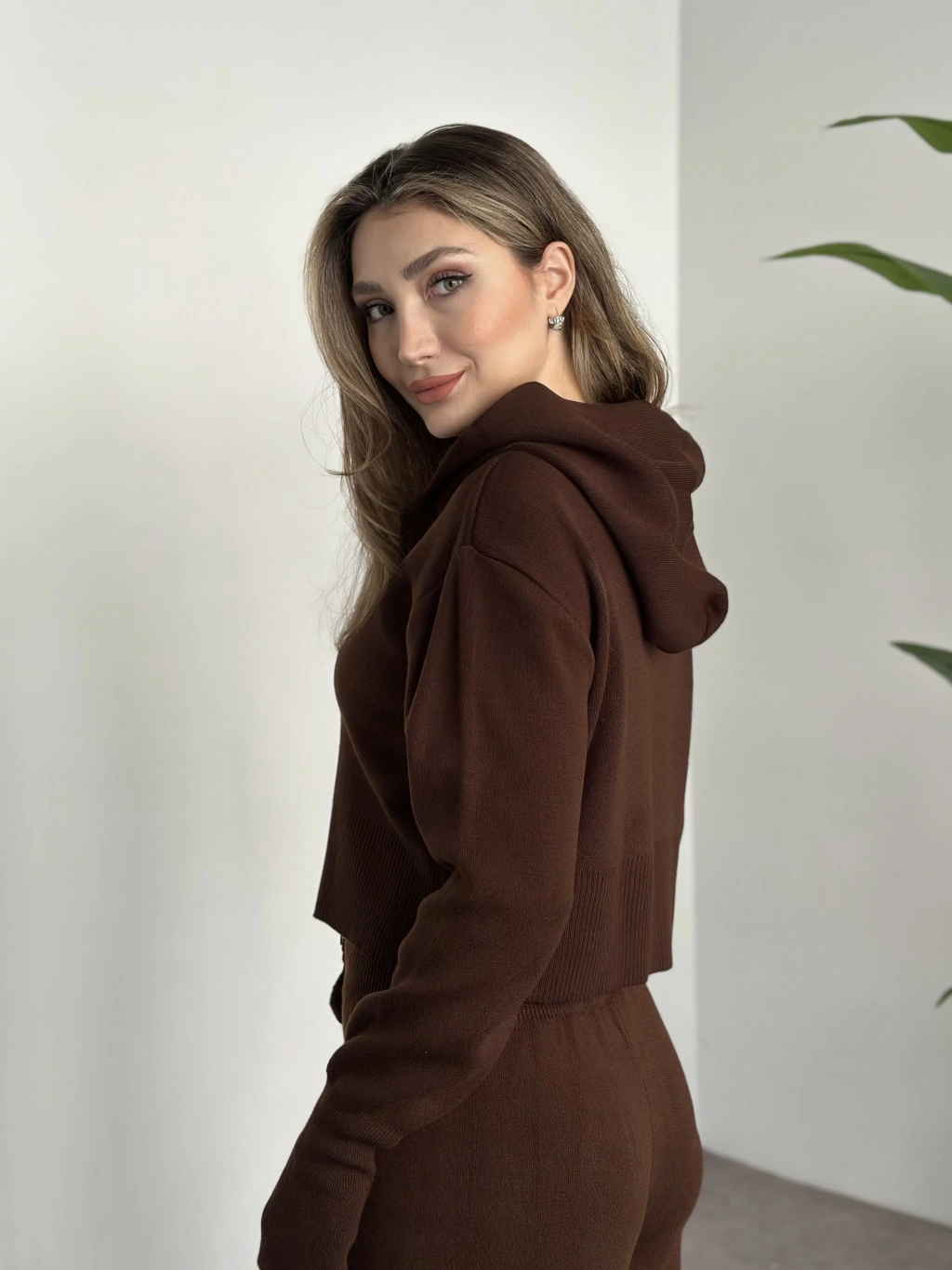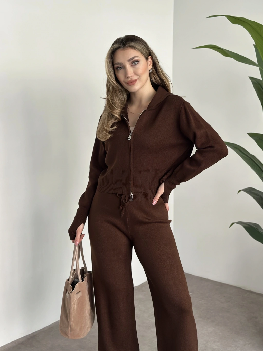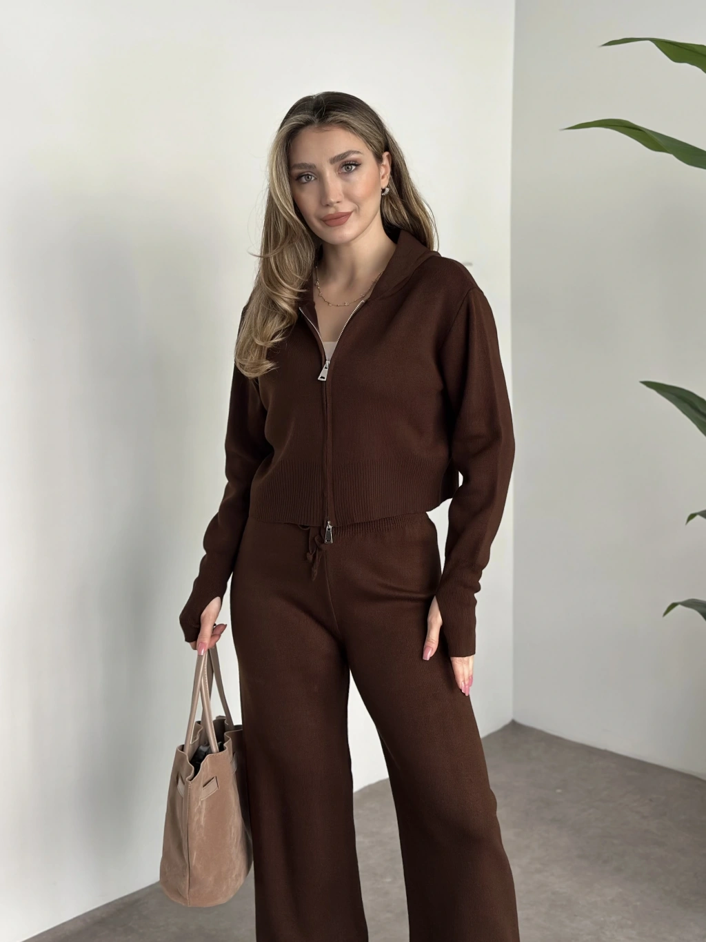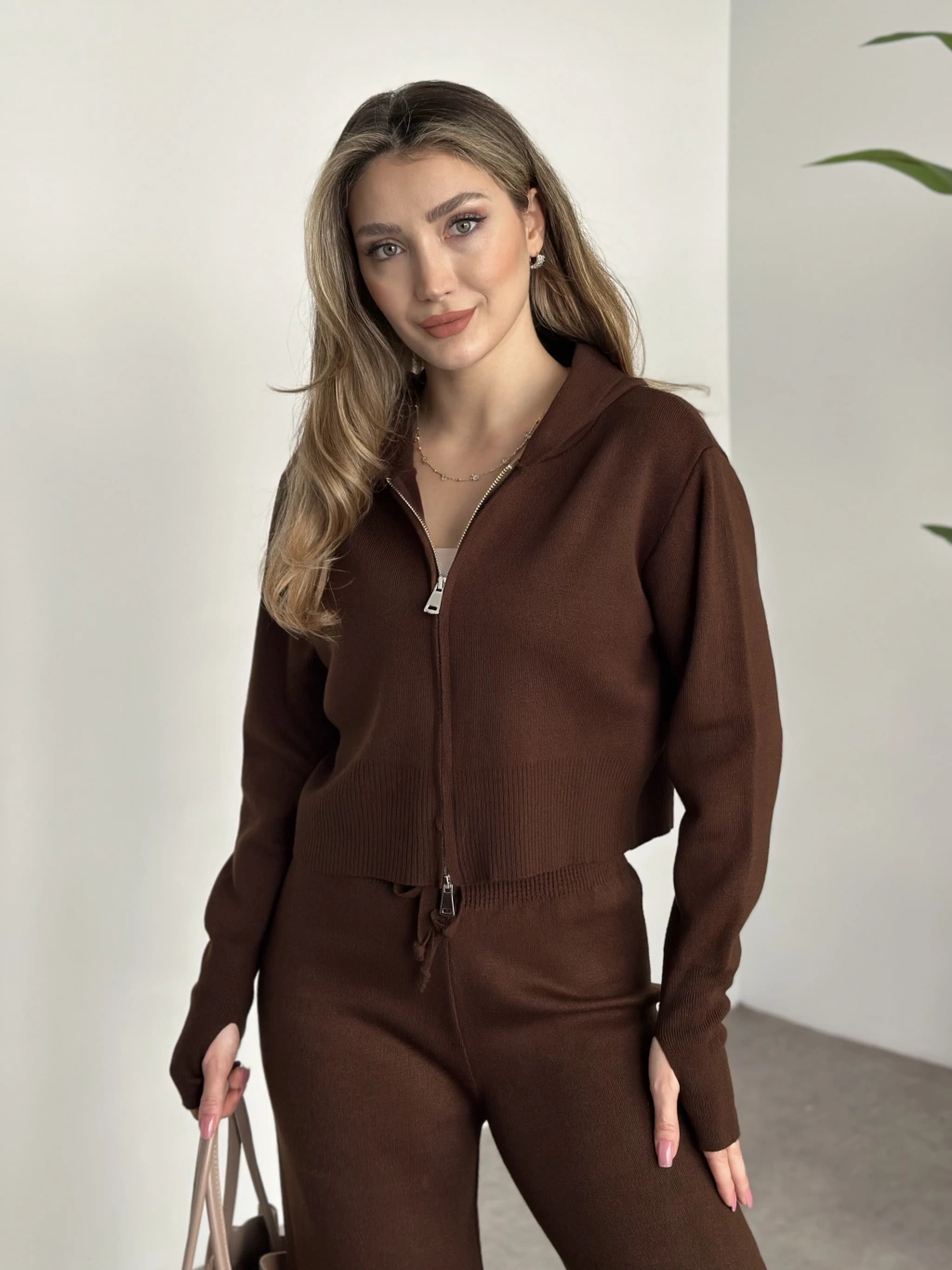 Çift fermuarlı kapşonlu triko takım kahve