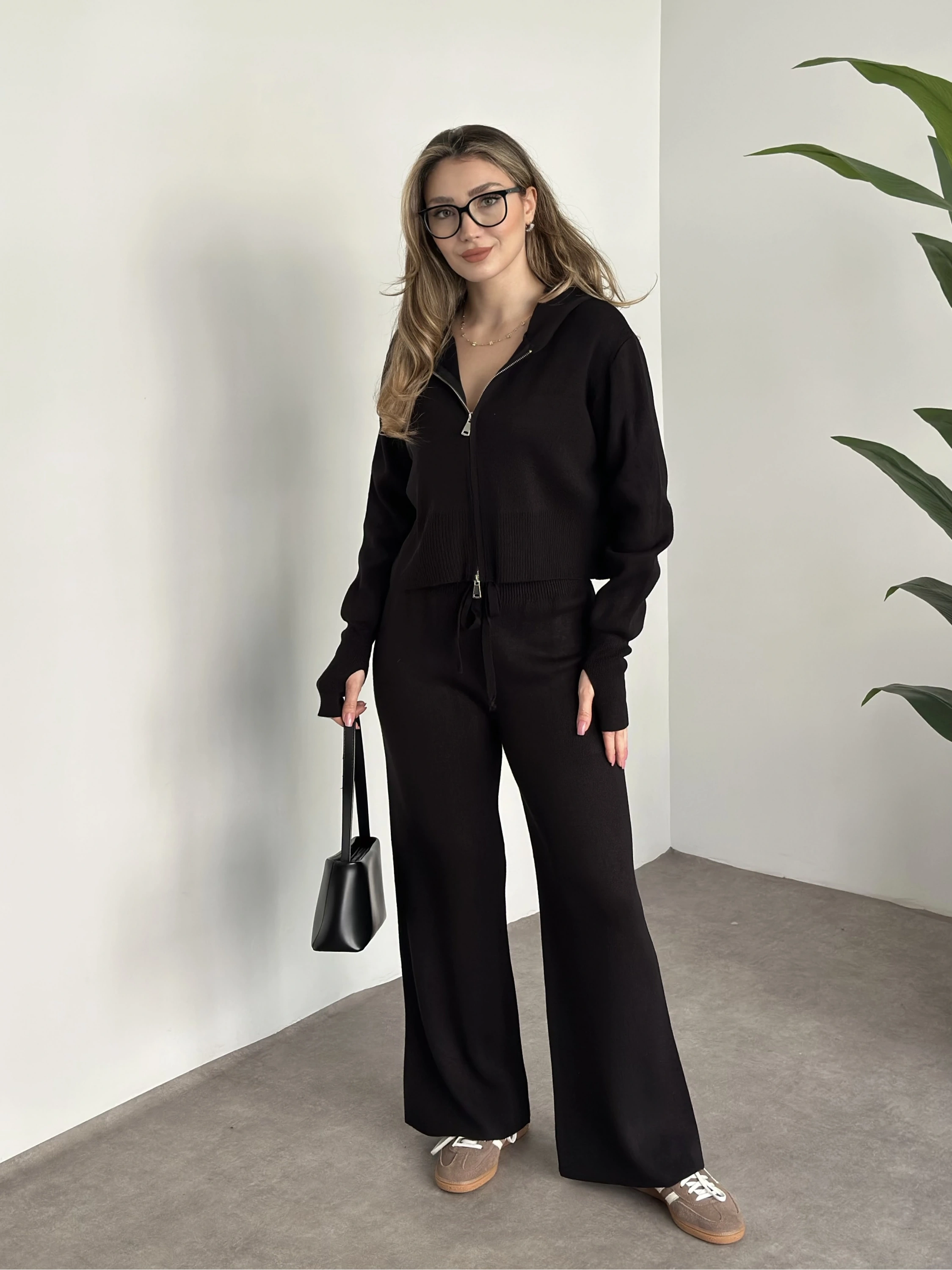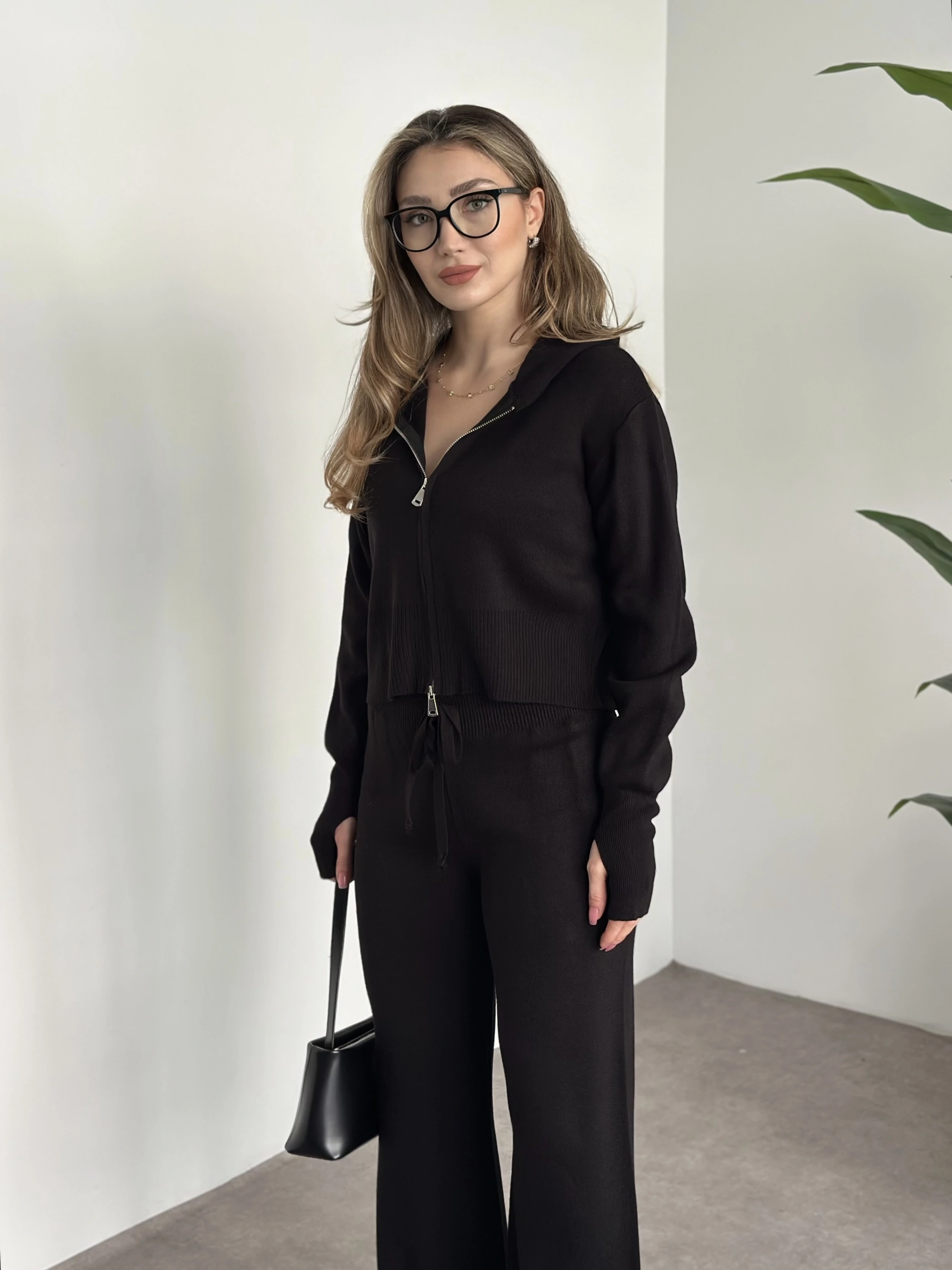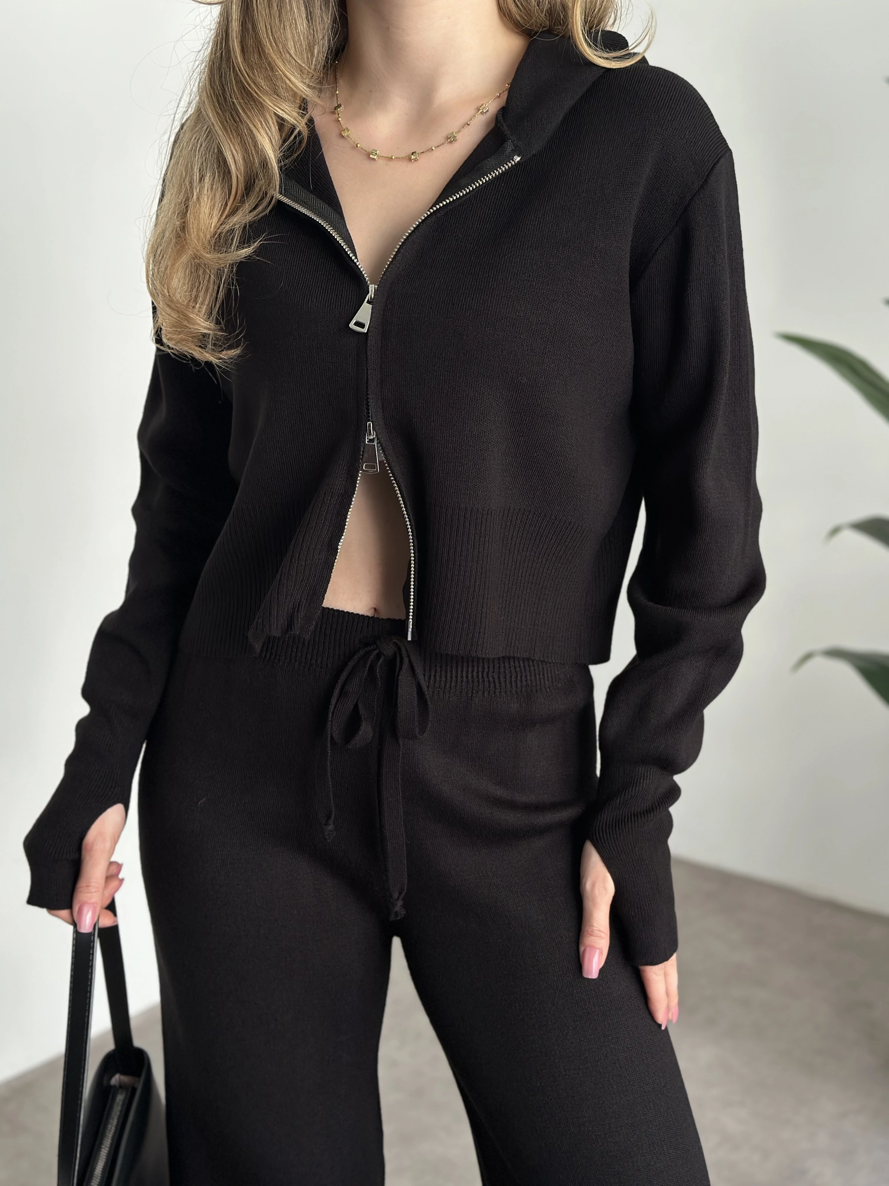 Çift fermuarlı kapşonlu triko takım siyah