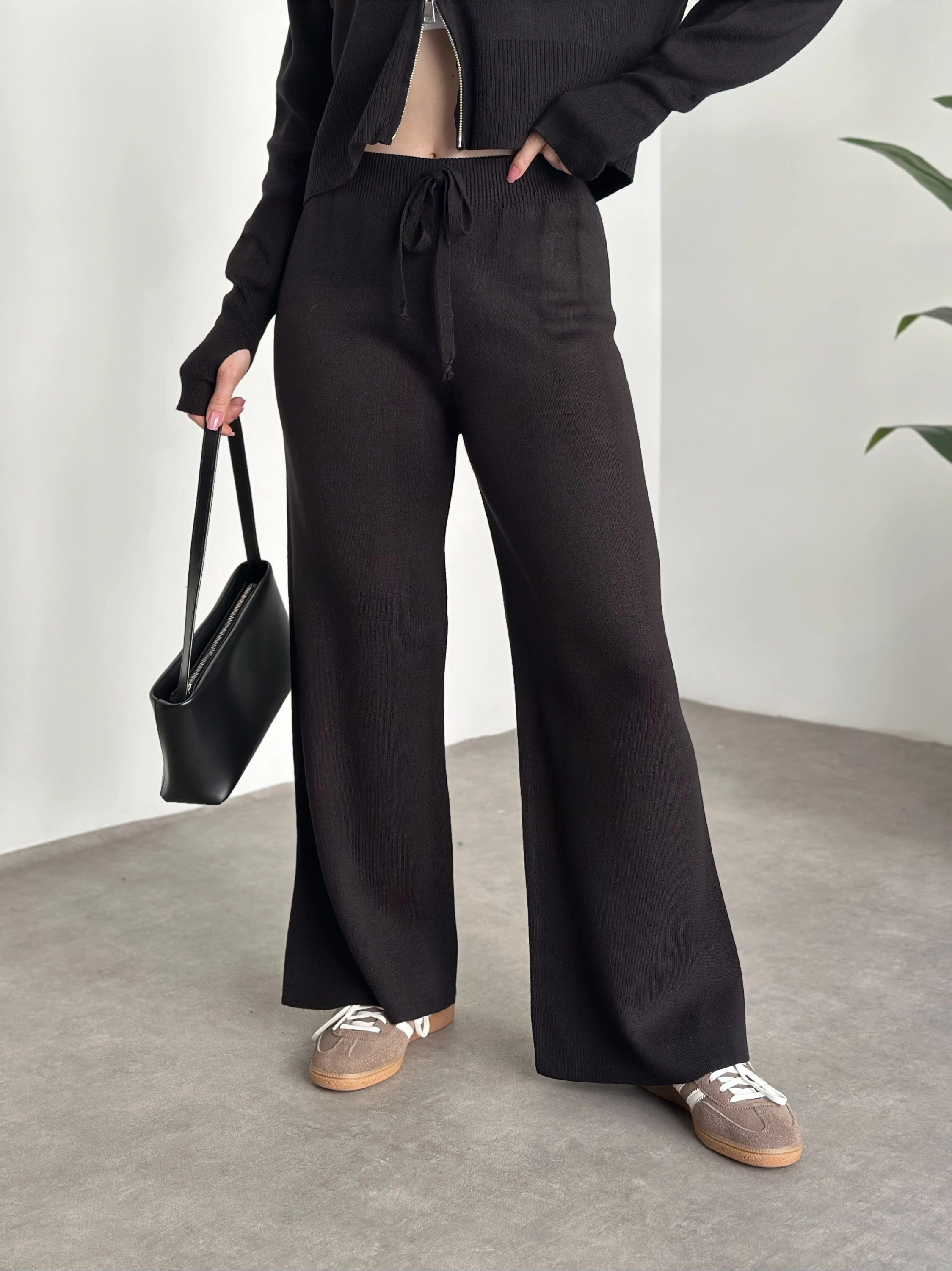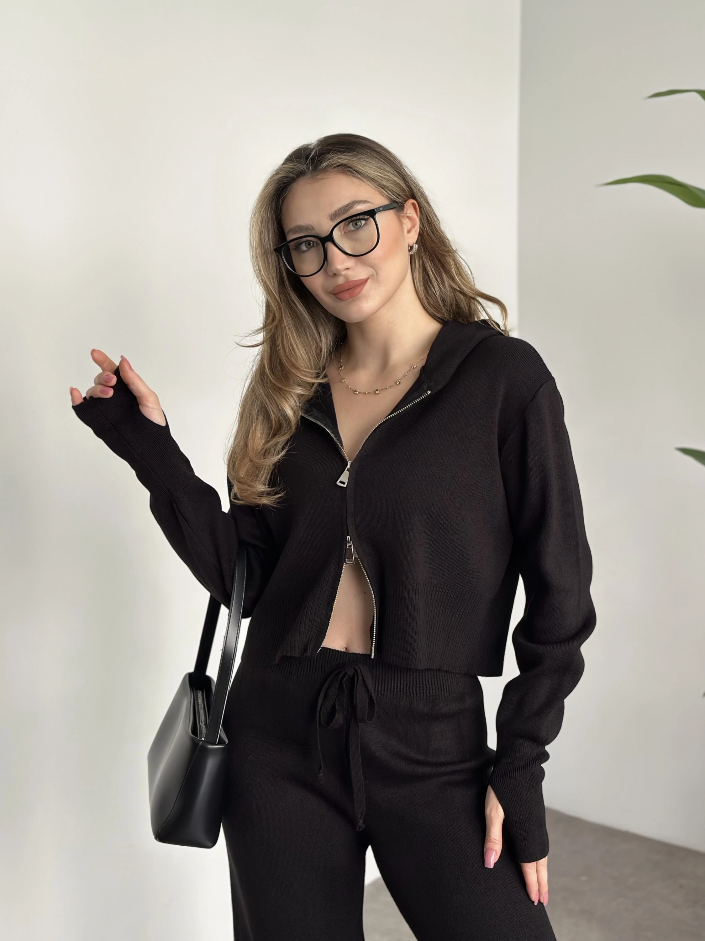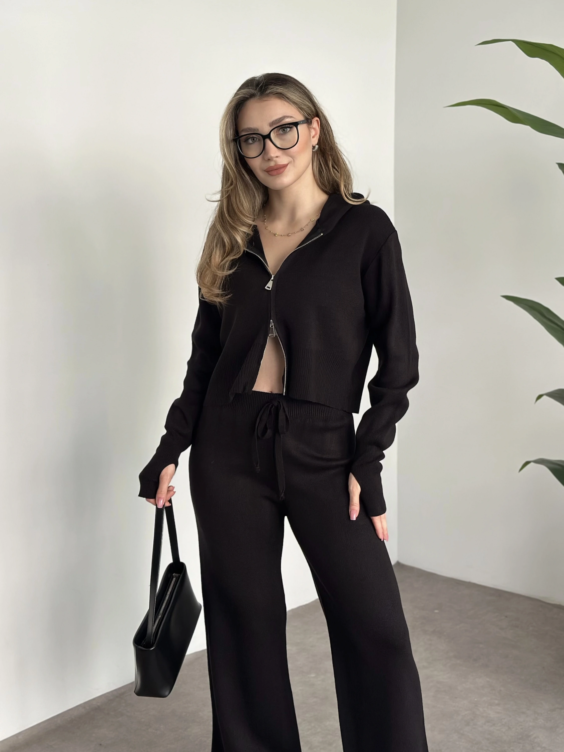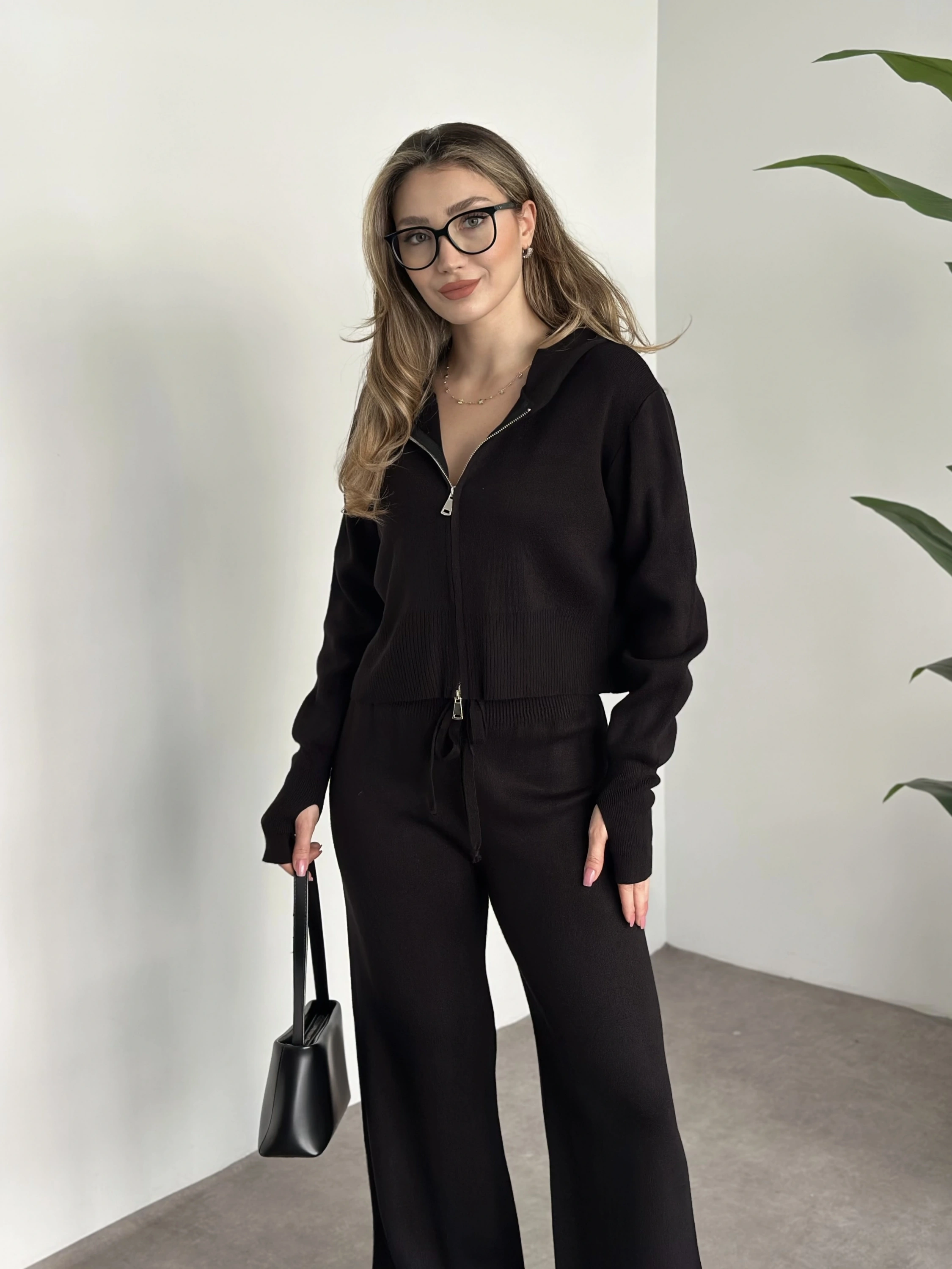 Çift fermuarlı kapşonlu triko takım siyah